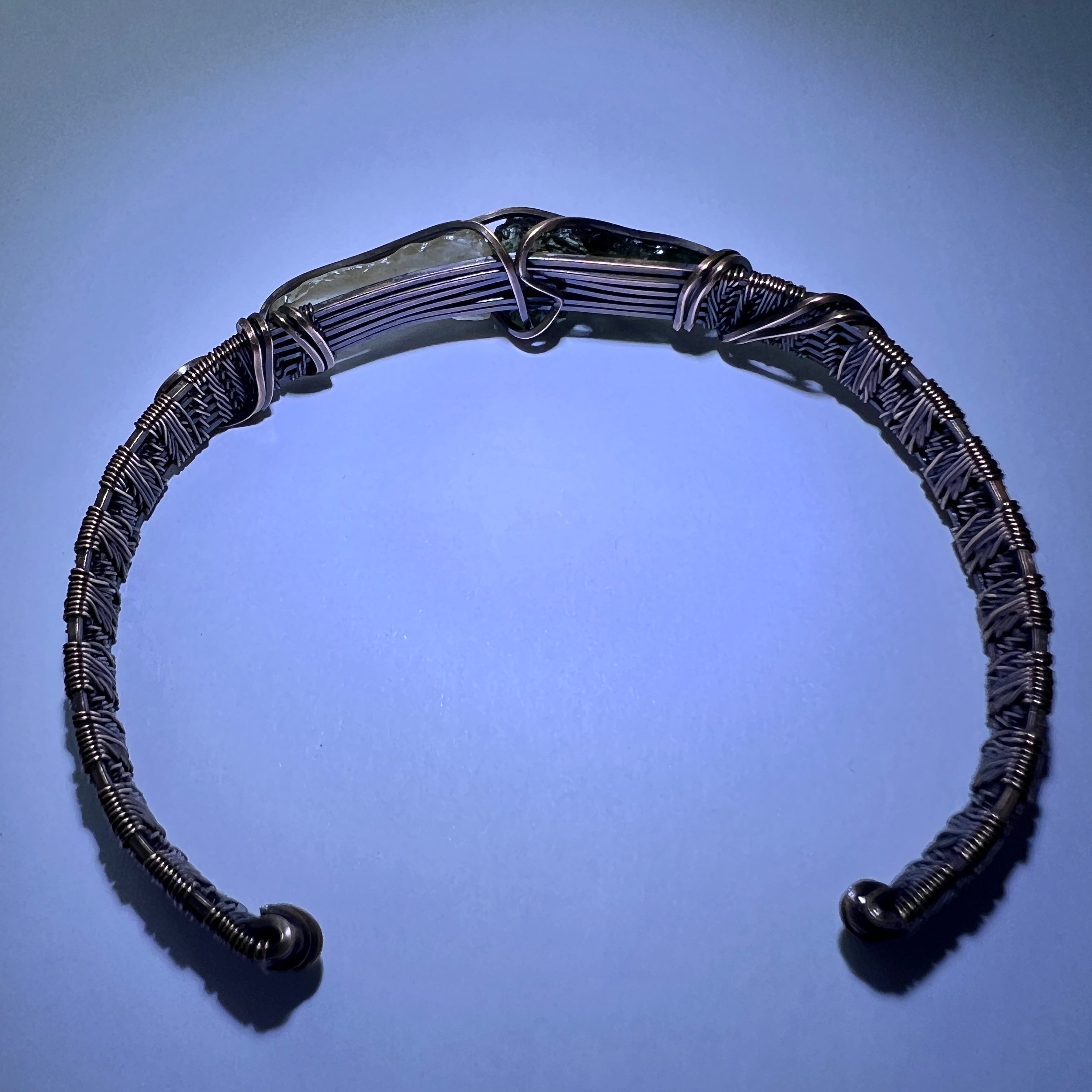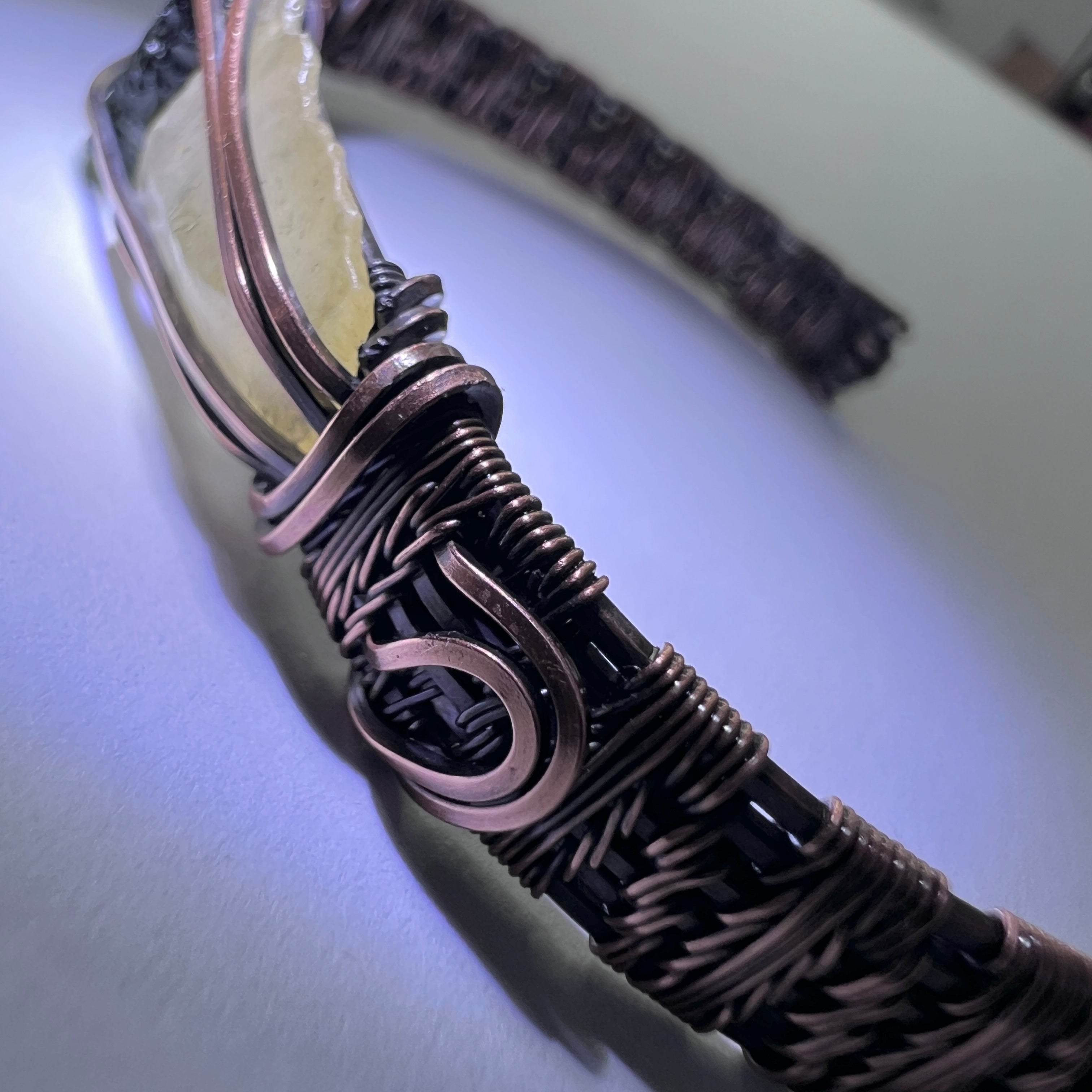 Moldavite is often associated with transformation, awakening, and higher consciousness, while copper has long been valued for its grounding and energy-conducting properties. Together, they symbolize the balance between cosmic change and earthly stability.