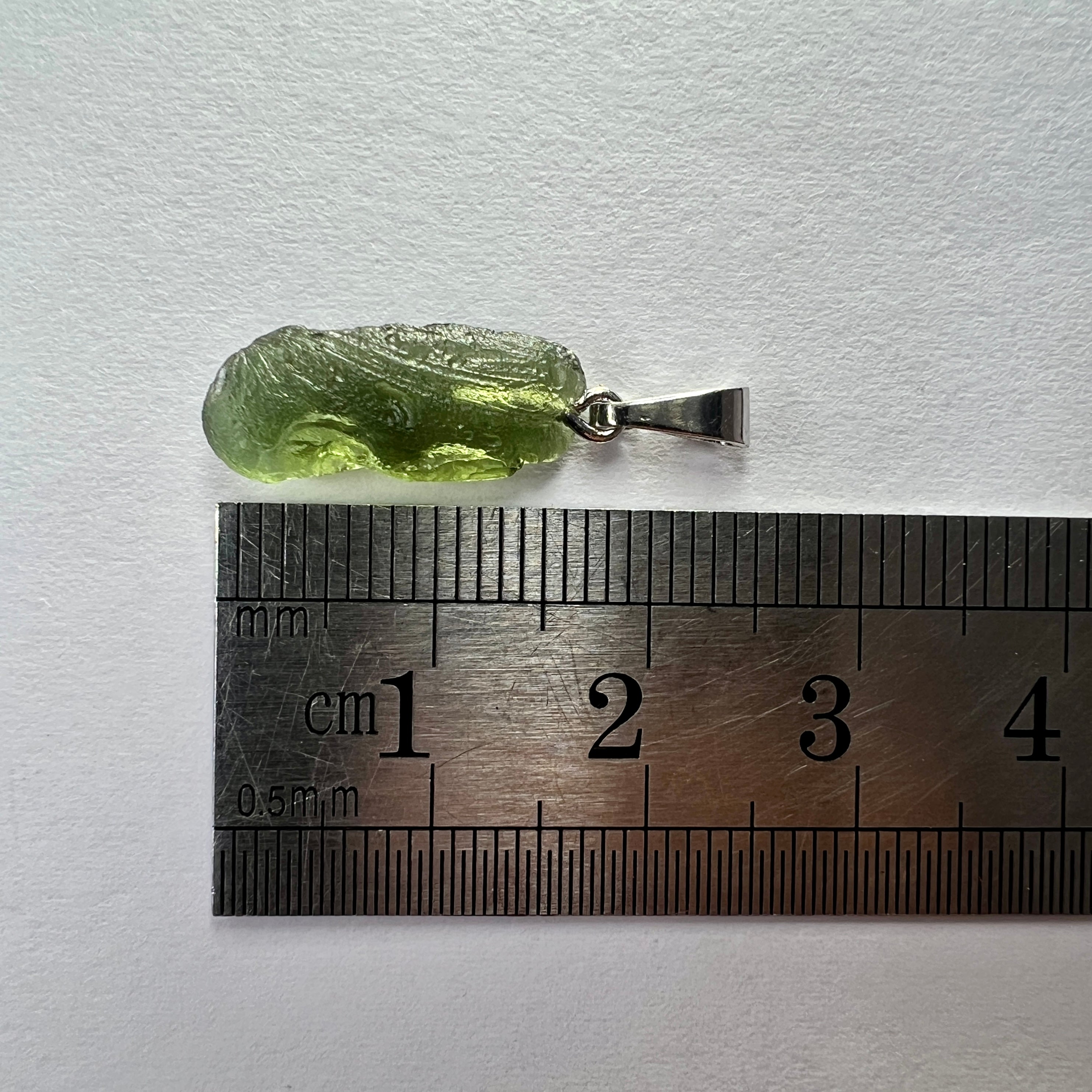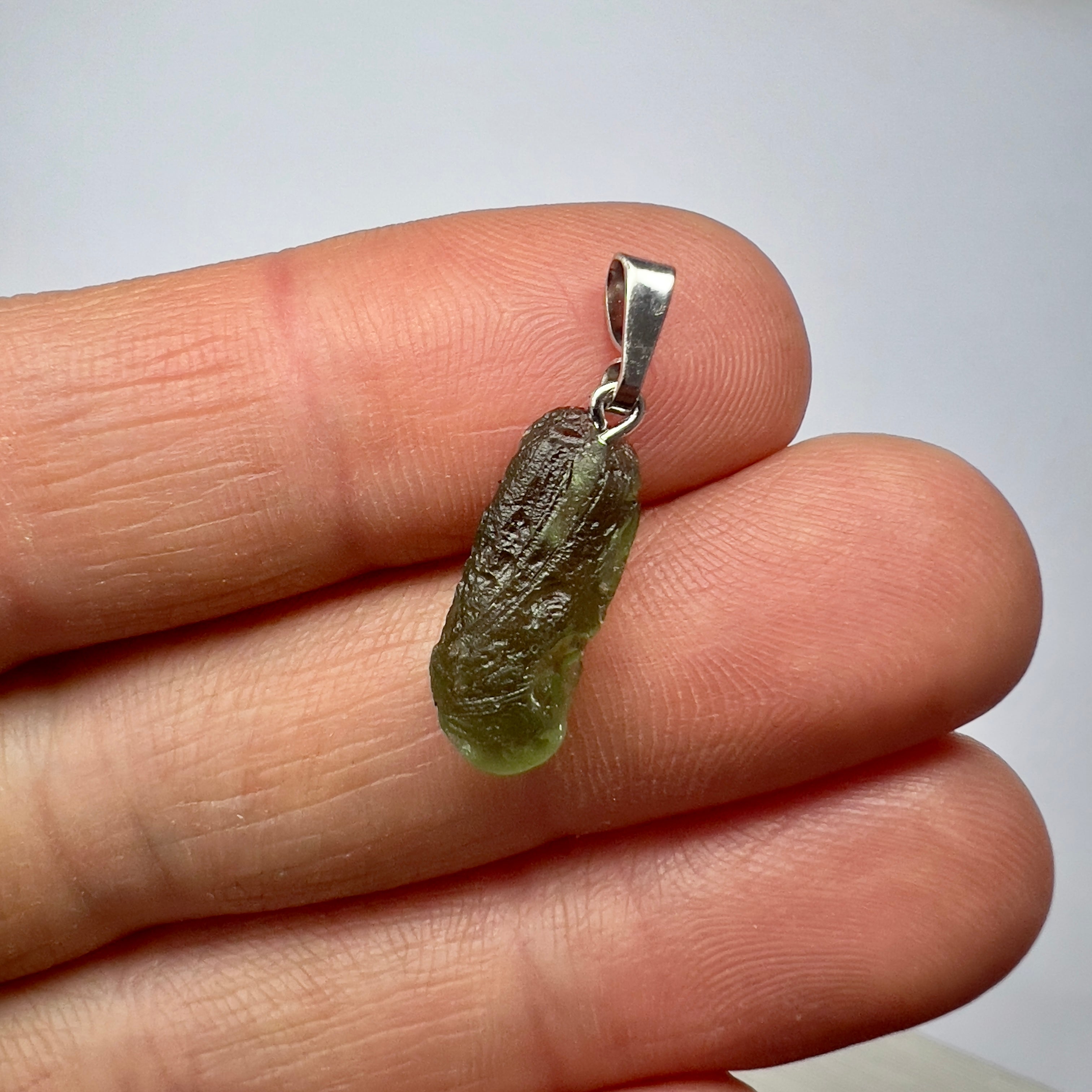 Tiny Moldavite pendant featuring a genuine, whole and undamaged Moldavite specimen. Not a chip or a fragment of a larger piece. Total weight including setting :0.89g