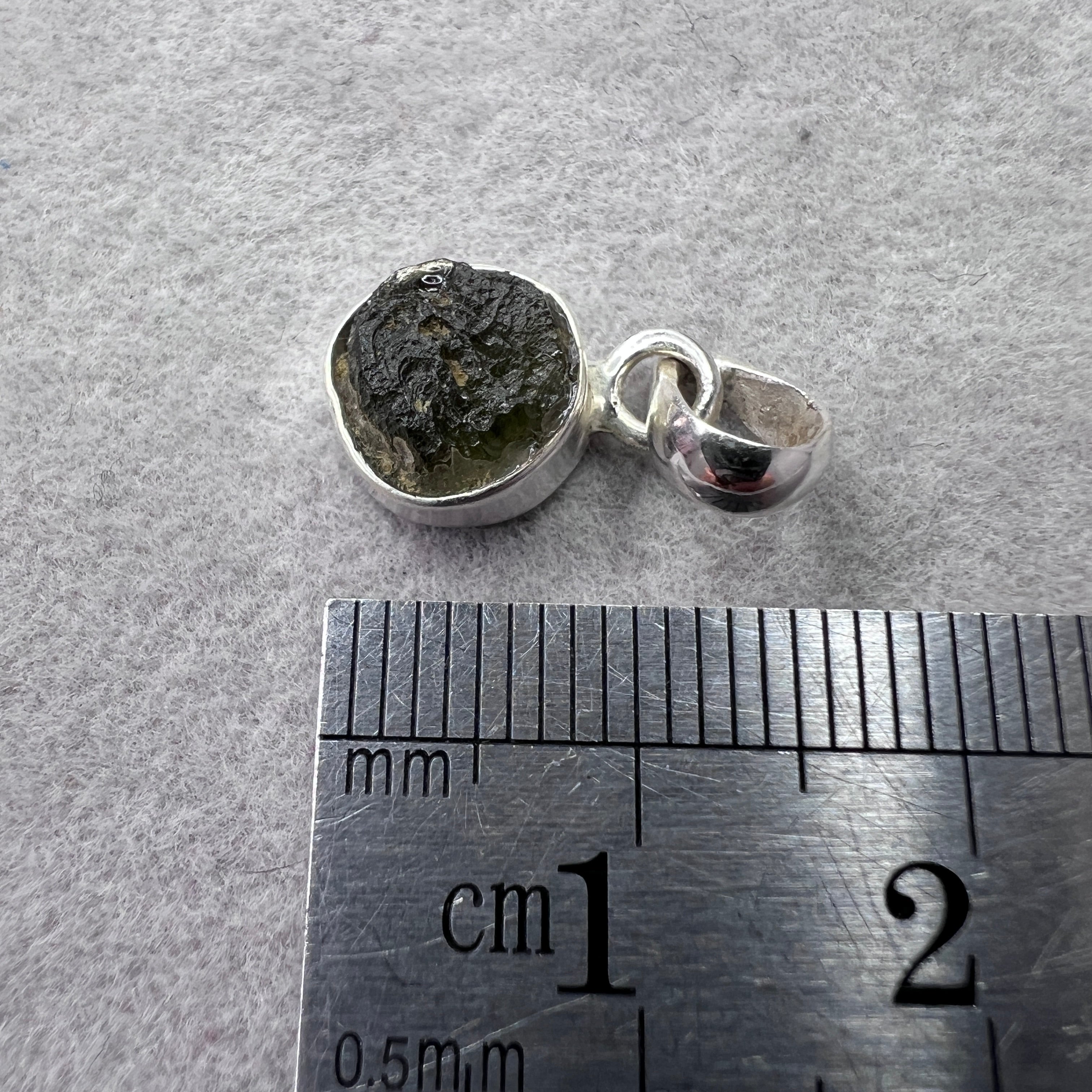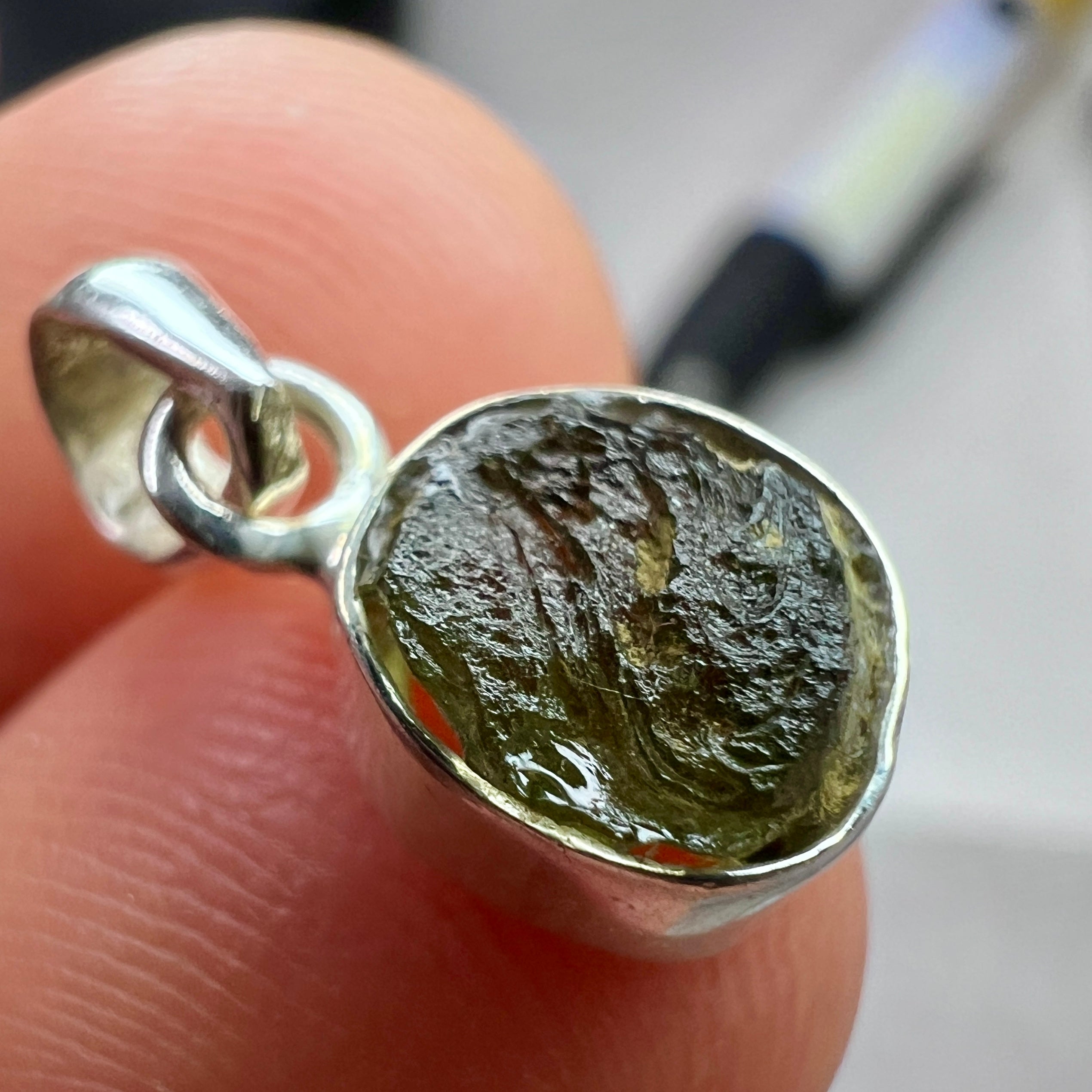 Authentic 1.10 g-gram Moldavite from Chlum, set in a sterling silver setting that highlights its natural texture and vibrant green color.