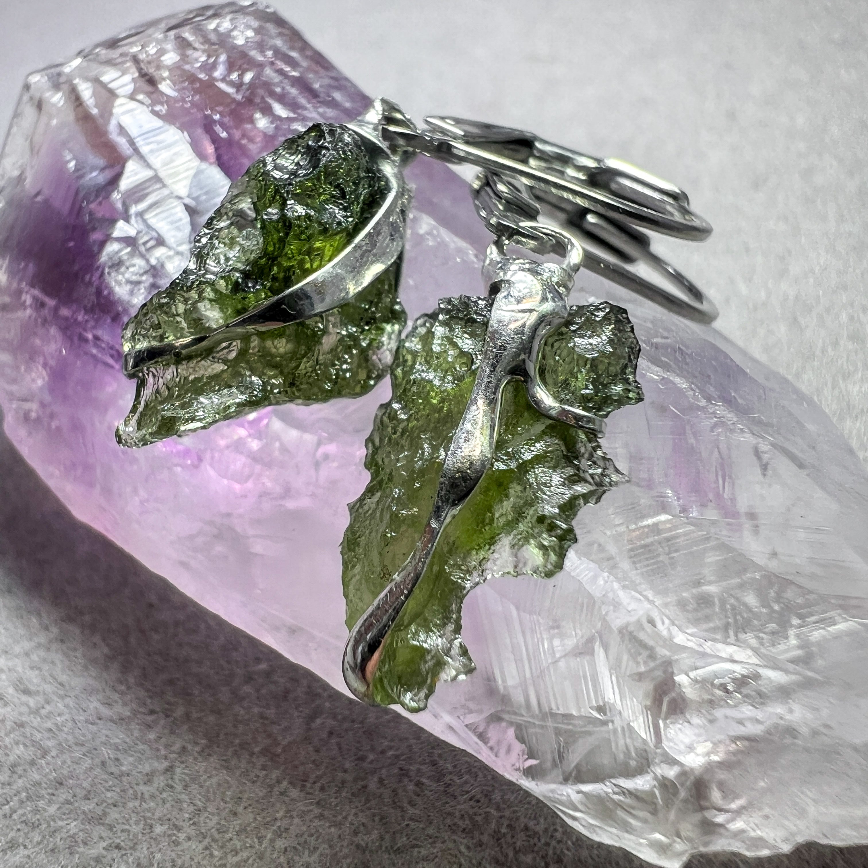 A charming pair of Moldavite earrings, naturally shaped and sourced from the renowned Chlum locality in the Czech Republic. Combined weight of the stones is 1.1g.