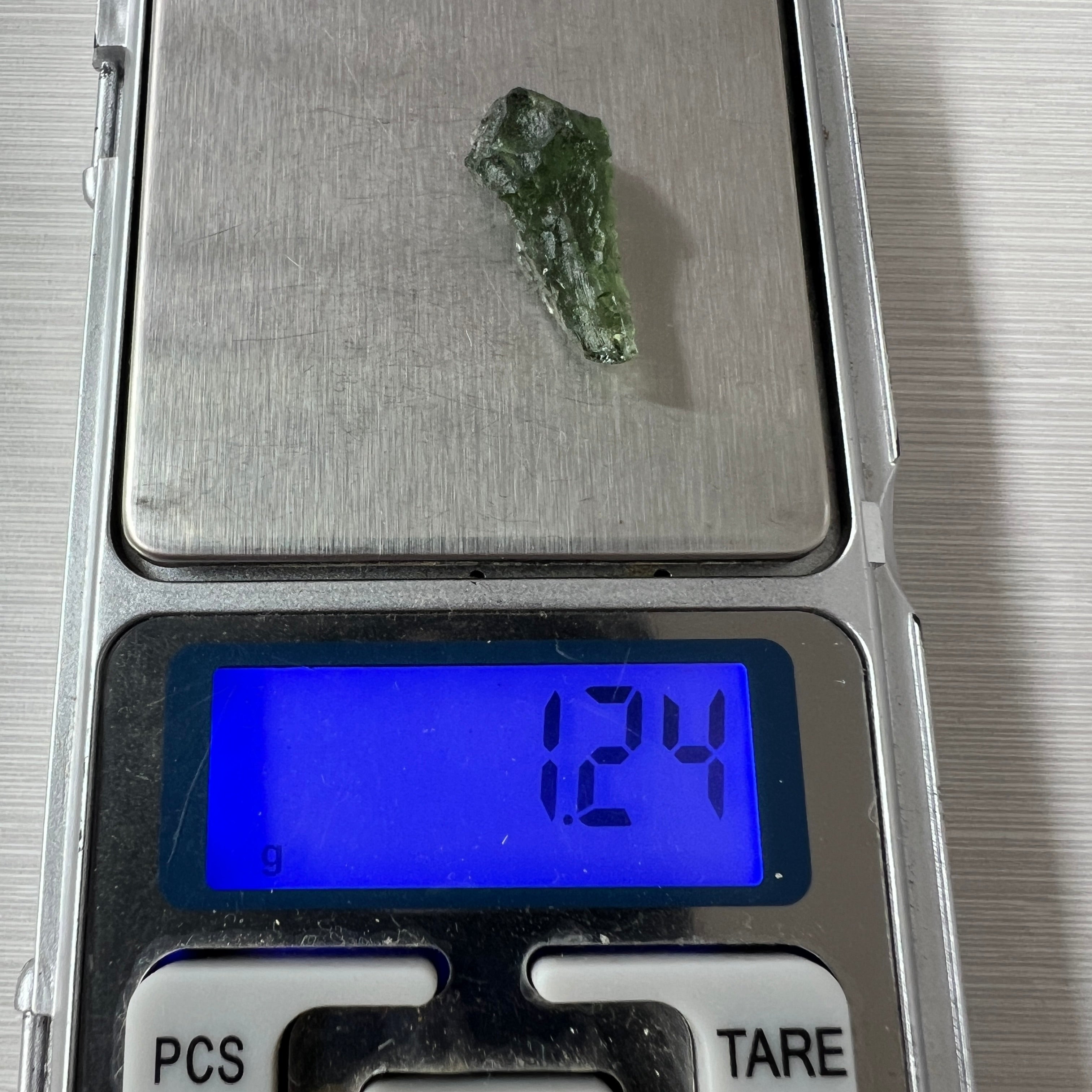 Weighing 1.24 grams, this piece stands out as an exceptional addition for any serious Moldavite collector.