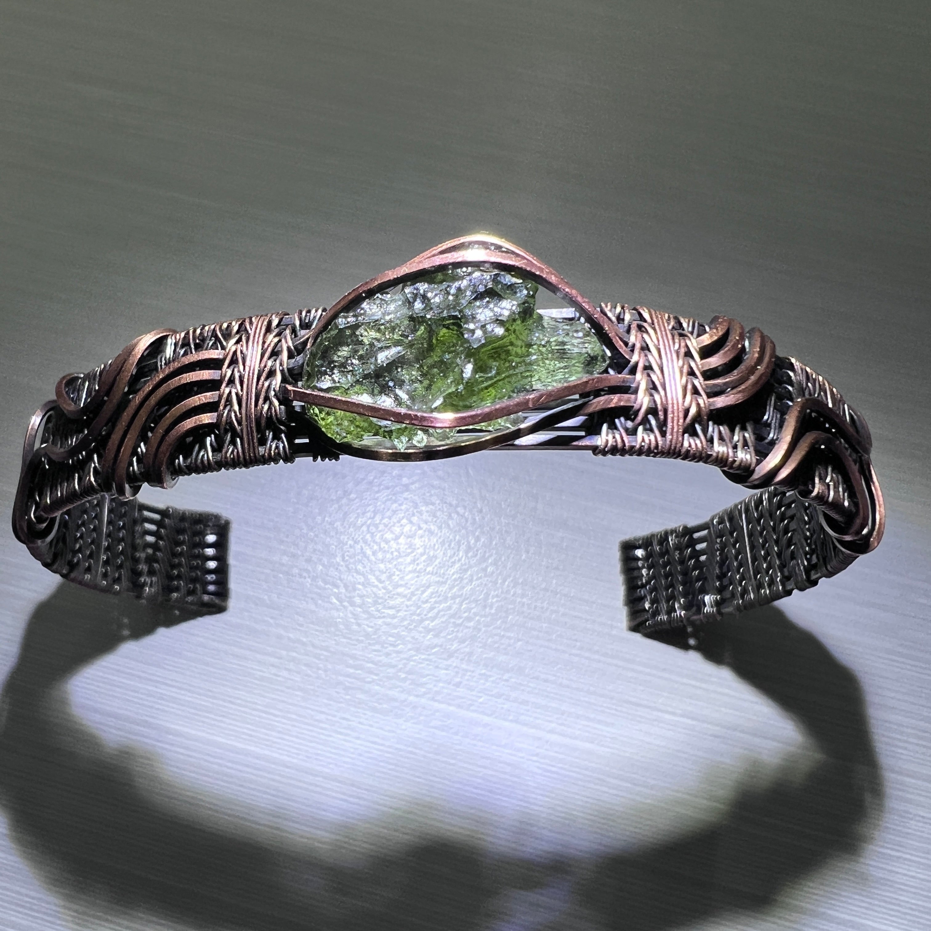 A handcrafted copper bracelet featuring a genuine 1.3-gram Moldavite from the well-known Marouškovo Pole locality in the Czech Republic. The warm tones of copper beautifully complement Moldavite’s natural texture and green depth, creating an earthy yet powerful piece.
