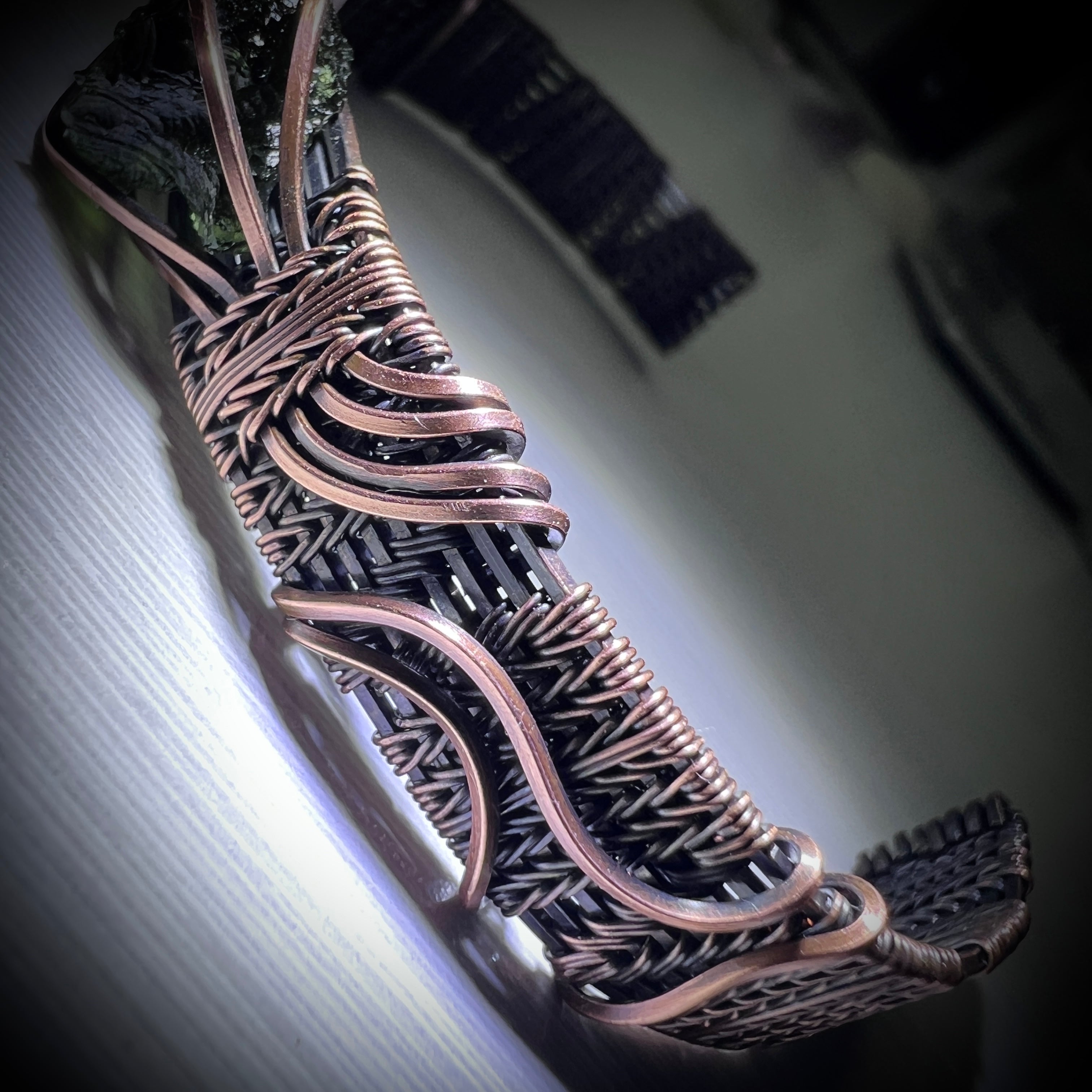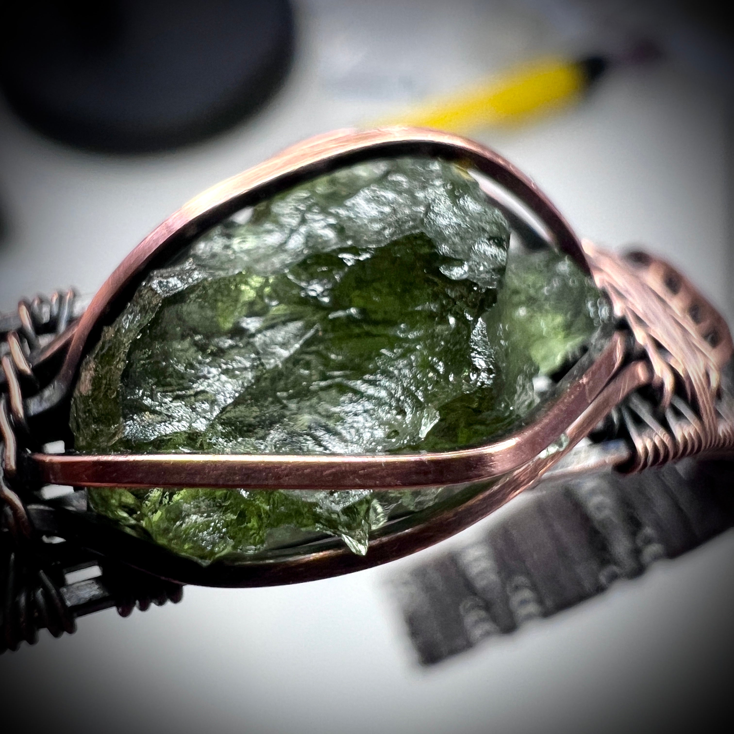 Moldavite is often associated with transformation, awakening, and higher consciousness, while copper has long been valued for its grounding and energy-conducting properties. Together, they symbolize the balance between cosmic change and earthly stability.