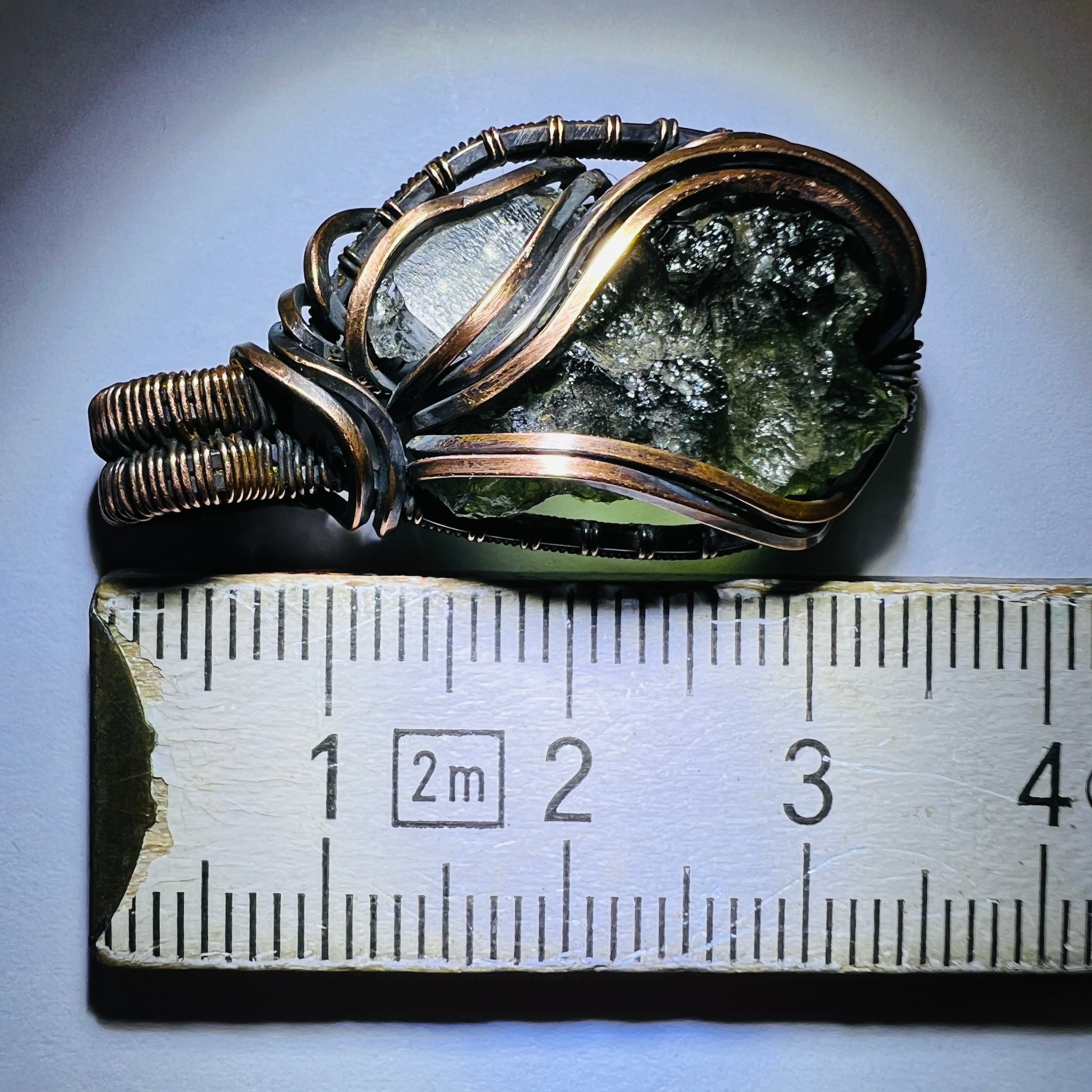 A striking union of raw texture and refined craftsmanship, this pendant features a 1.52g Moldavite from the famed Marouskovo Pole locality, paired with a clear, sparkling Herkimer Diamond. The Moldavite’s surface shows intricate natural sculpting and deep olive-green tones, highlighted by a thick, hand-wrapped copper setting that enhances its earthy character. The contrasting brilliance of the Herkimer Diamond adds balance — light meeting depth, clarity meeting energy.