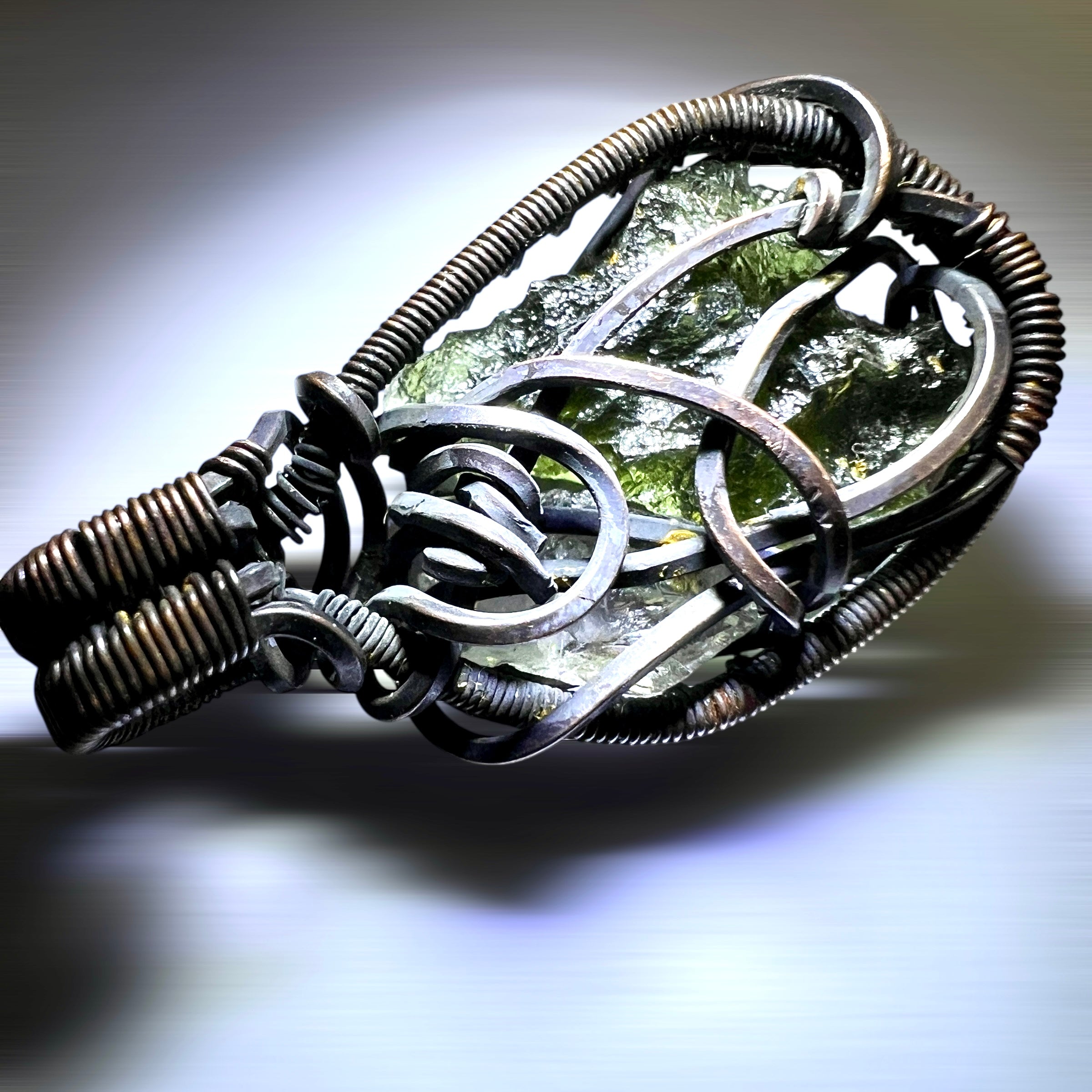 Moldavite is a rare tektite or meteoric glass, caused by an asteroid impact 15mil. years ago. The intense, 10,000°c+ temperatures of the strike vapourised the asteroid, target rock and sand, flinging the molten substance high into the atmosphere.