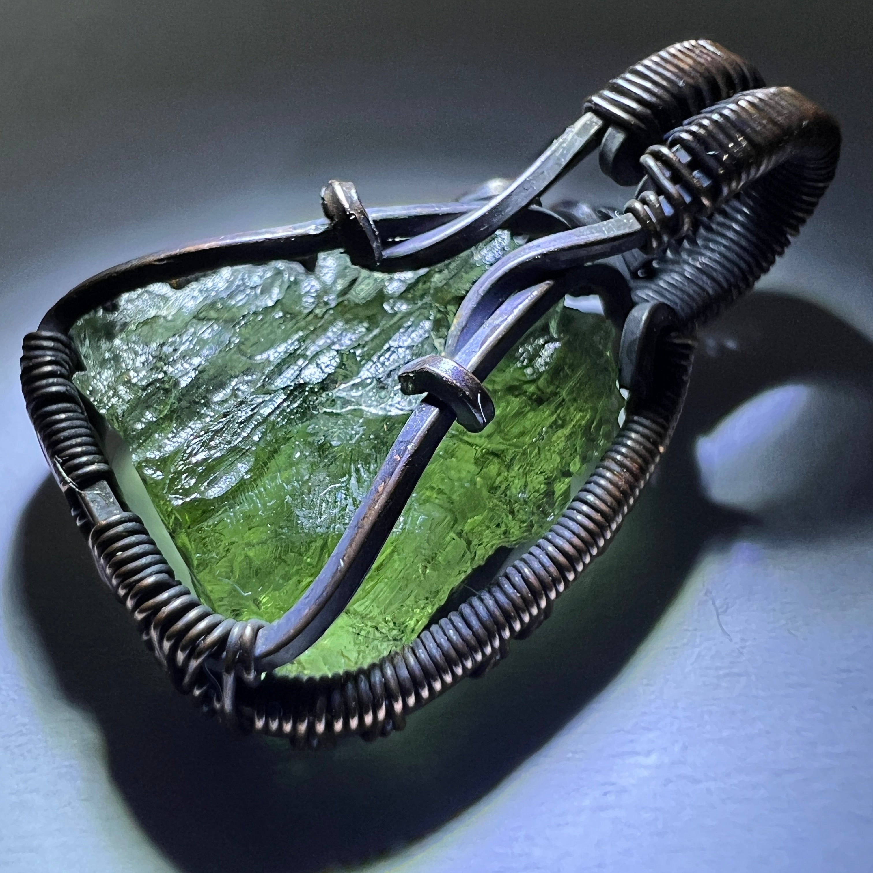 Visually, the rustic glow of antiqued copper harmonizes with Moldavite’s deep forest-green hue, giving the piece a timeless, organic look. Energetically, copper acts as a bridge between the heavens and the earth, mirroring Moldavite’s origin—born from the union of cosmic impact and terrestrial matter. Together, they form a powerful combination: Moldavite for awakening and transformation, and copper for grounding, circulation, and amplification.
