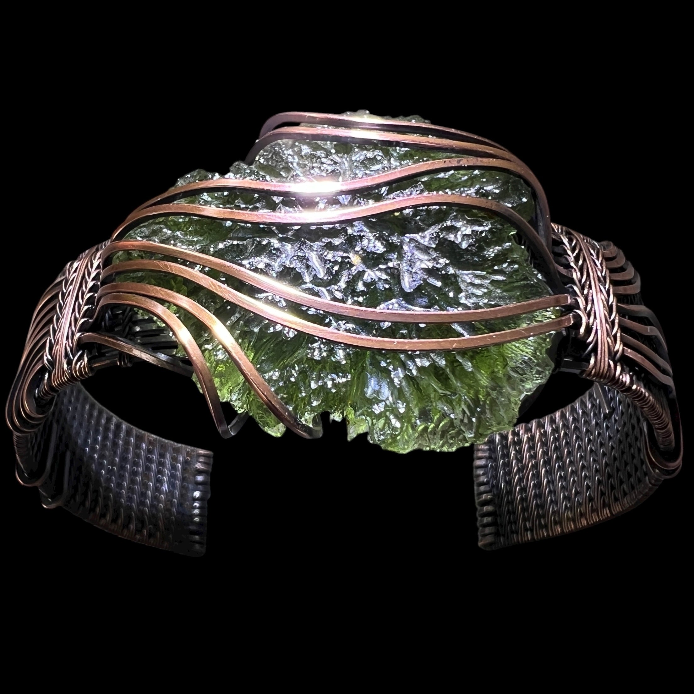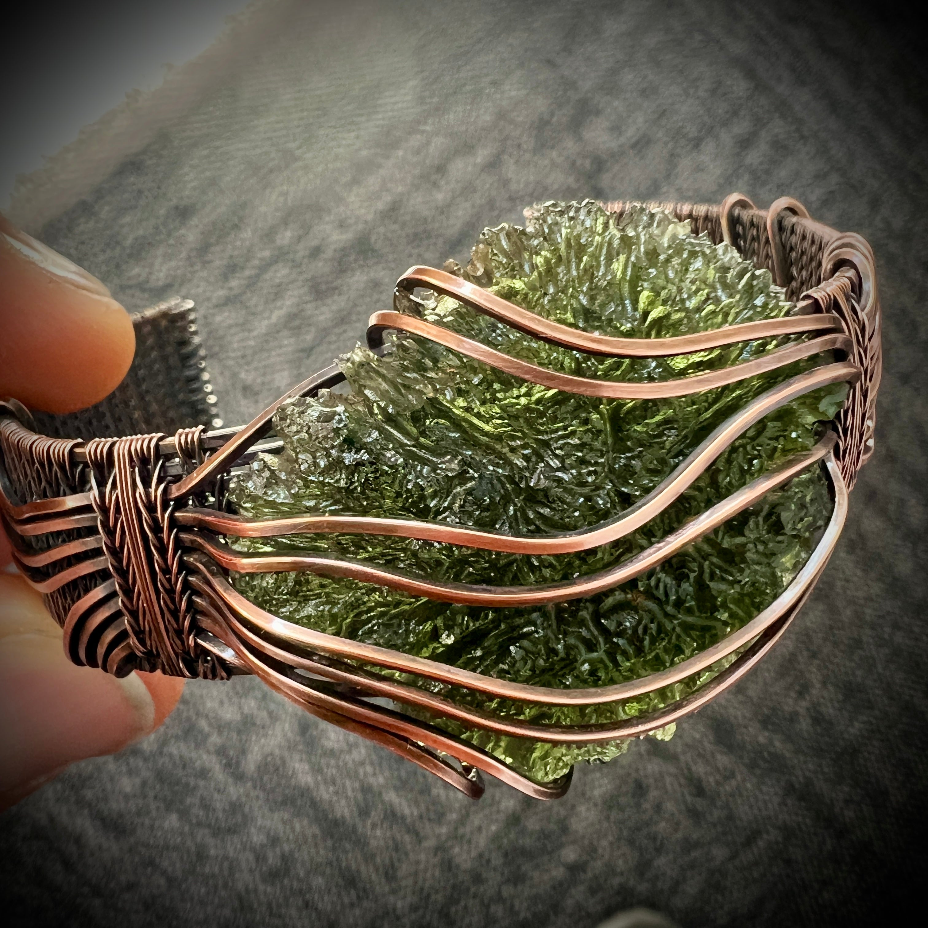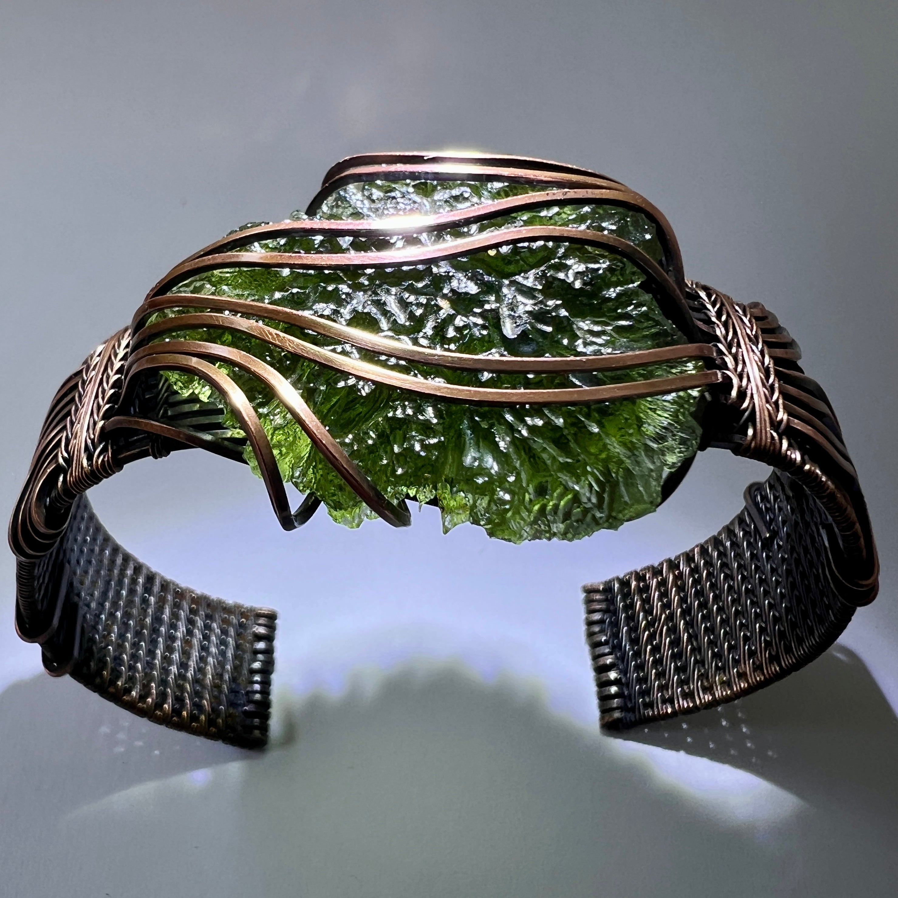 Exquisite Moldavite Bracelet — Handwoven in Antiqued Copper