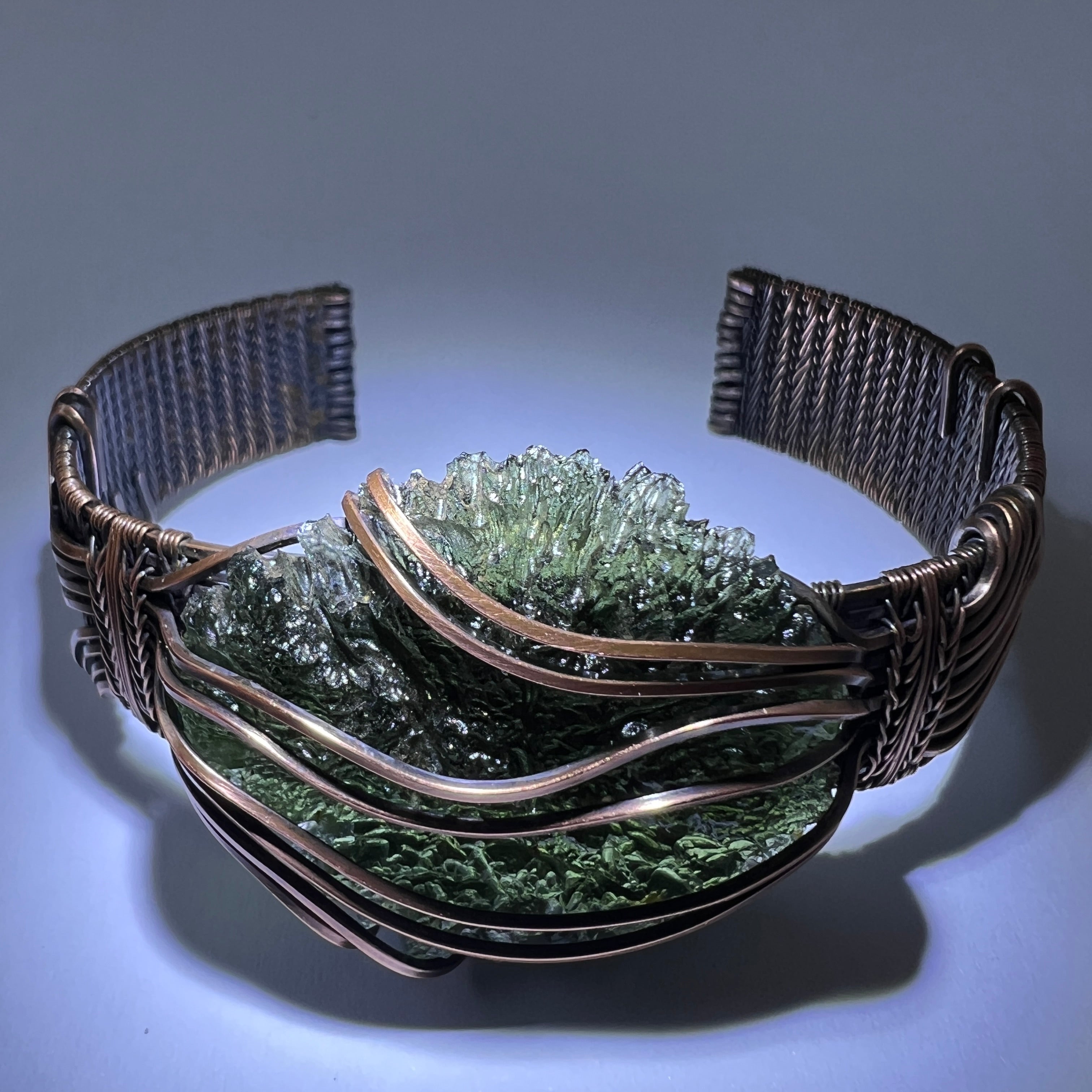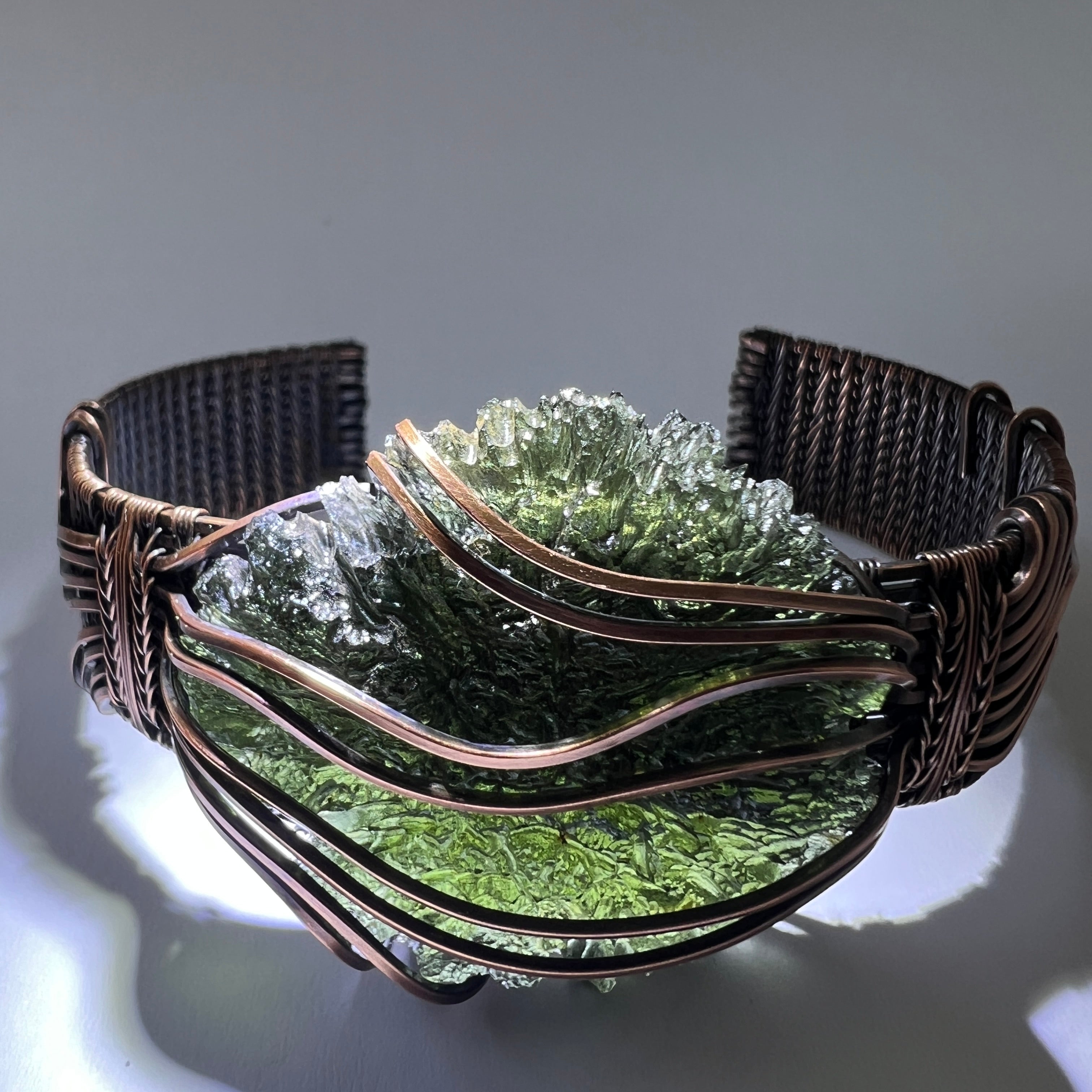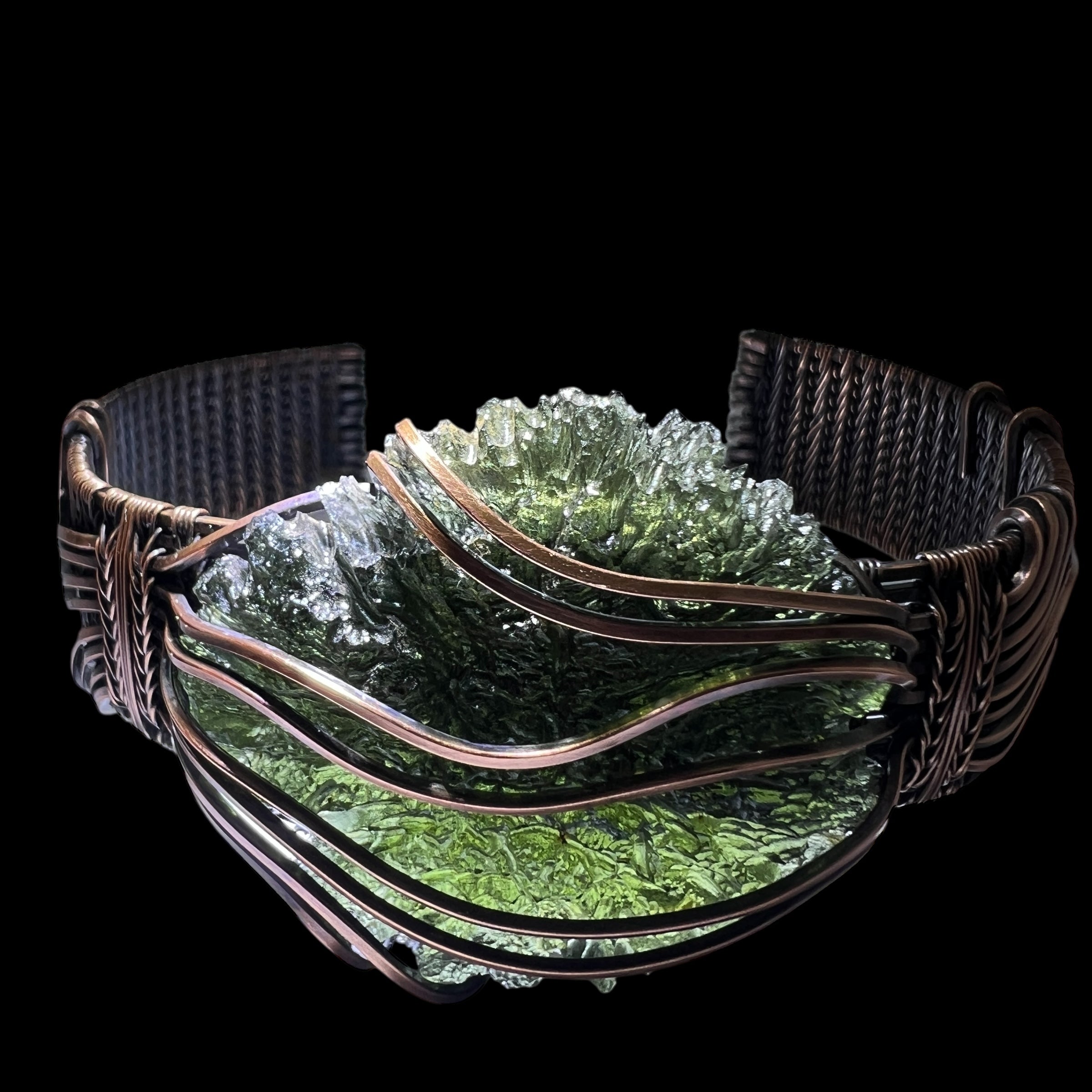 Exquisite Moldavite Bracelet — Handwoven in Antiqued Copper
