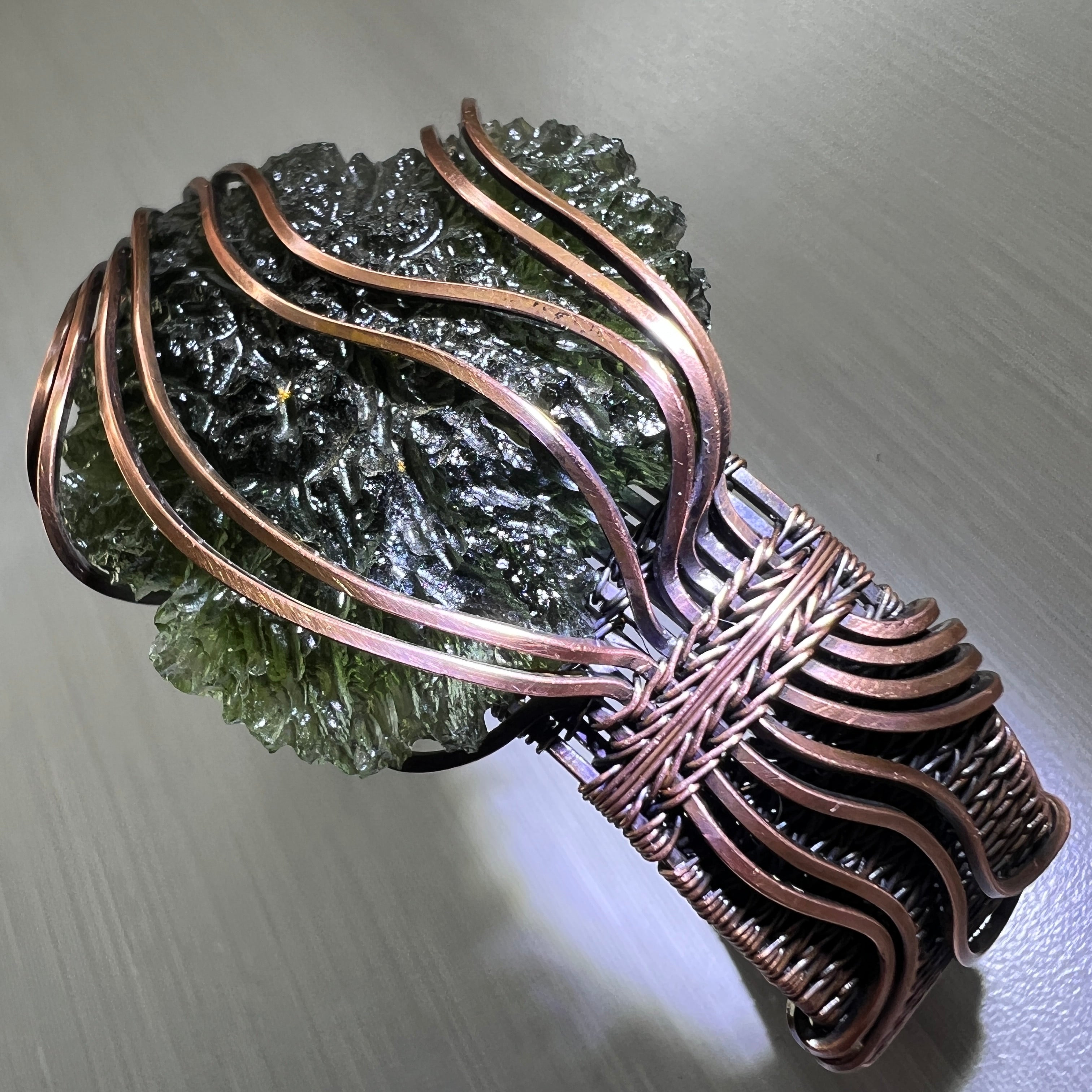 Presenting an extraordinary piece of wearable Moldavite art. This exquisite bracelet has been masterfully wrapped by hand in antiqued copper using our signature technique. Every strand has been painstakingly woven to achieve a depth and texture that is twice the thickness (15 mm) of our standard, and much-loved, design.