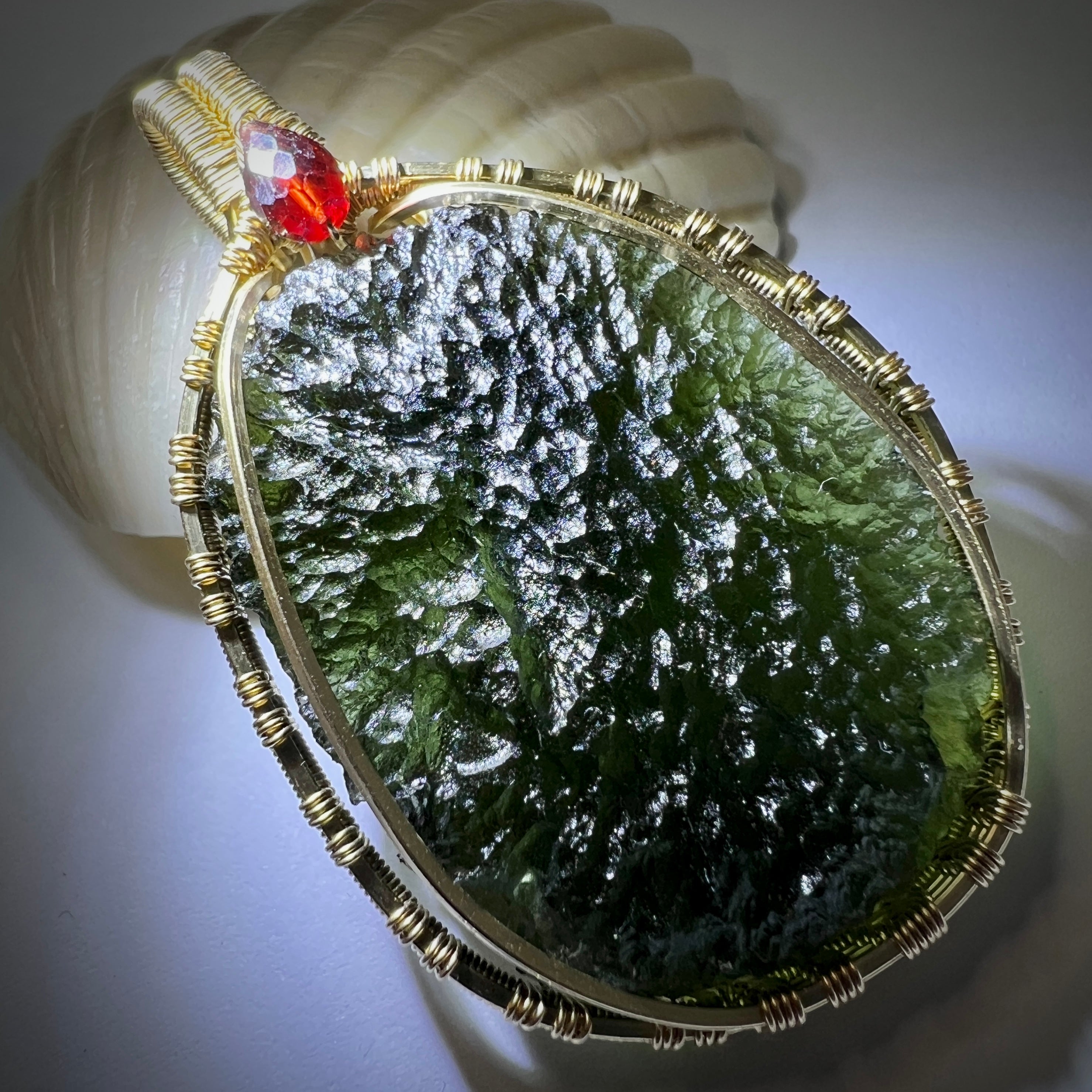 Adorning this magnificent Moldavite is a faceted Garnet bead, its crimson brilliance a striking contrast to the ethereal green. Together, they embody a union of cosmic and terrestrial energy — Moldavite representing transformation and higher consciousness, Garnet symbolizing vitality and grounded strength.