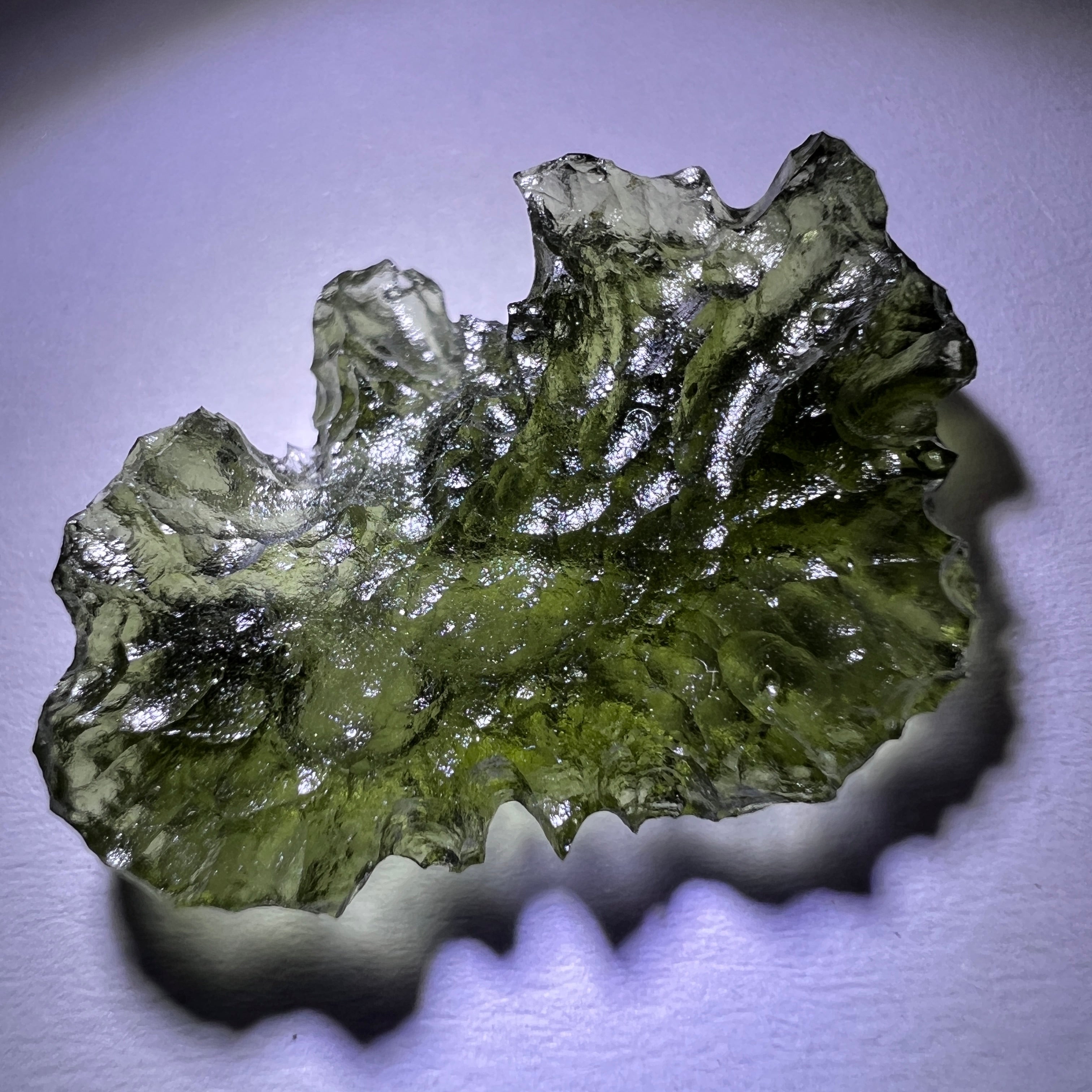 Moldavite is a rare tektite or meteoric glass, caused by an asteroid impact 15mil. years ago. The intense, 10,000°c+ temperatures of the strike vapourised the asteroid, target rock and sand, flinging the molten substance high into the atmosphere.