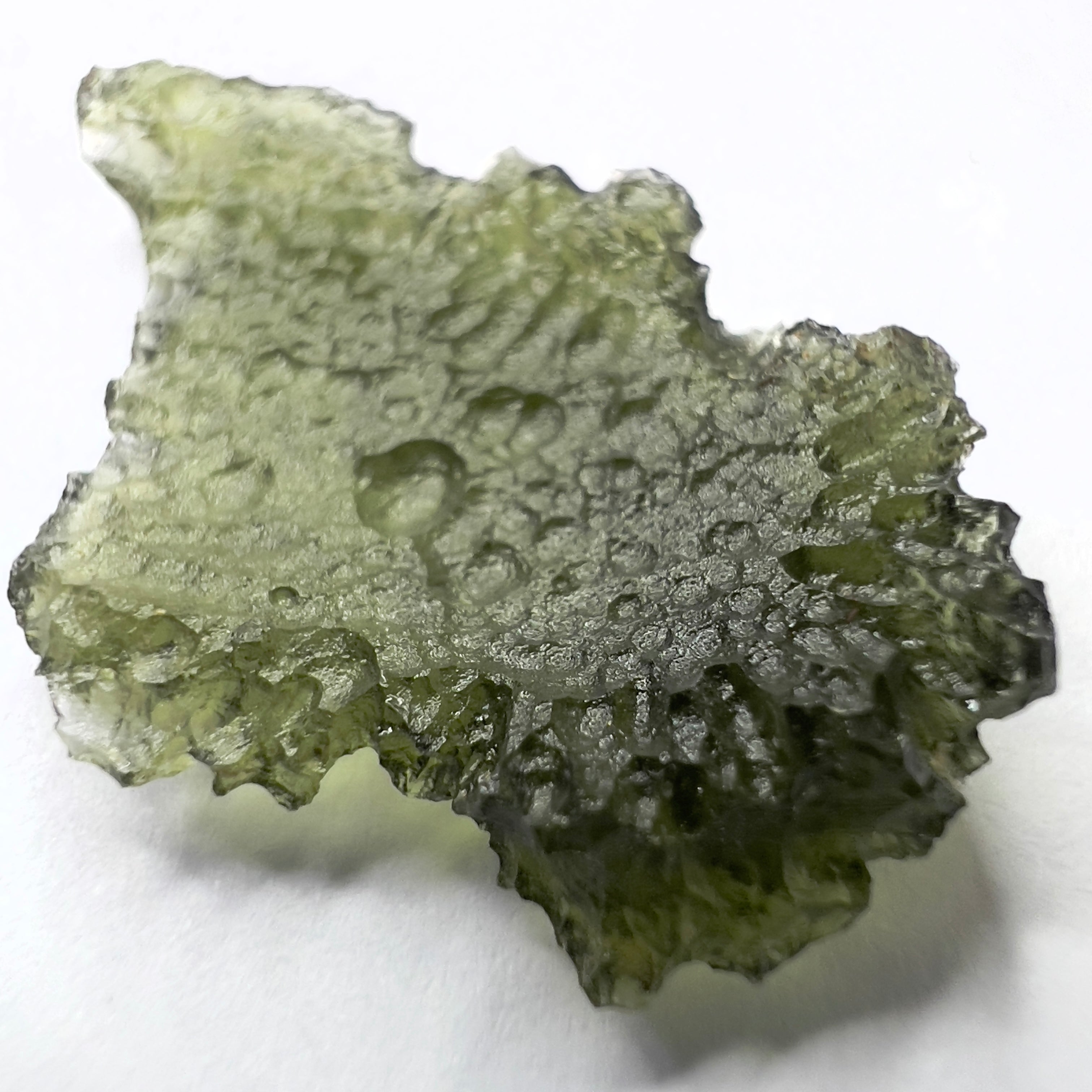 An impressive 2.28 gram Moldavite from the fertile fields of Marouskovo Pole — a locality celebrated for its character-rich surface texture and raw, earthy forms. This piece boasts a broad, organically shaped body with deep etching and captivating natural flow.