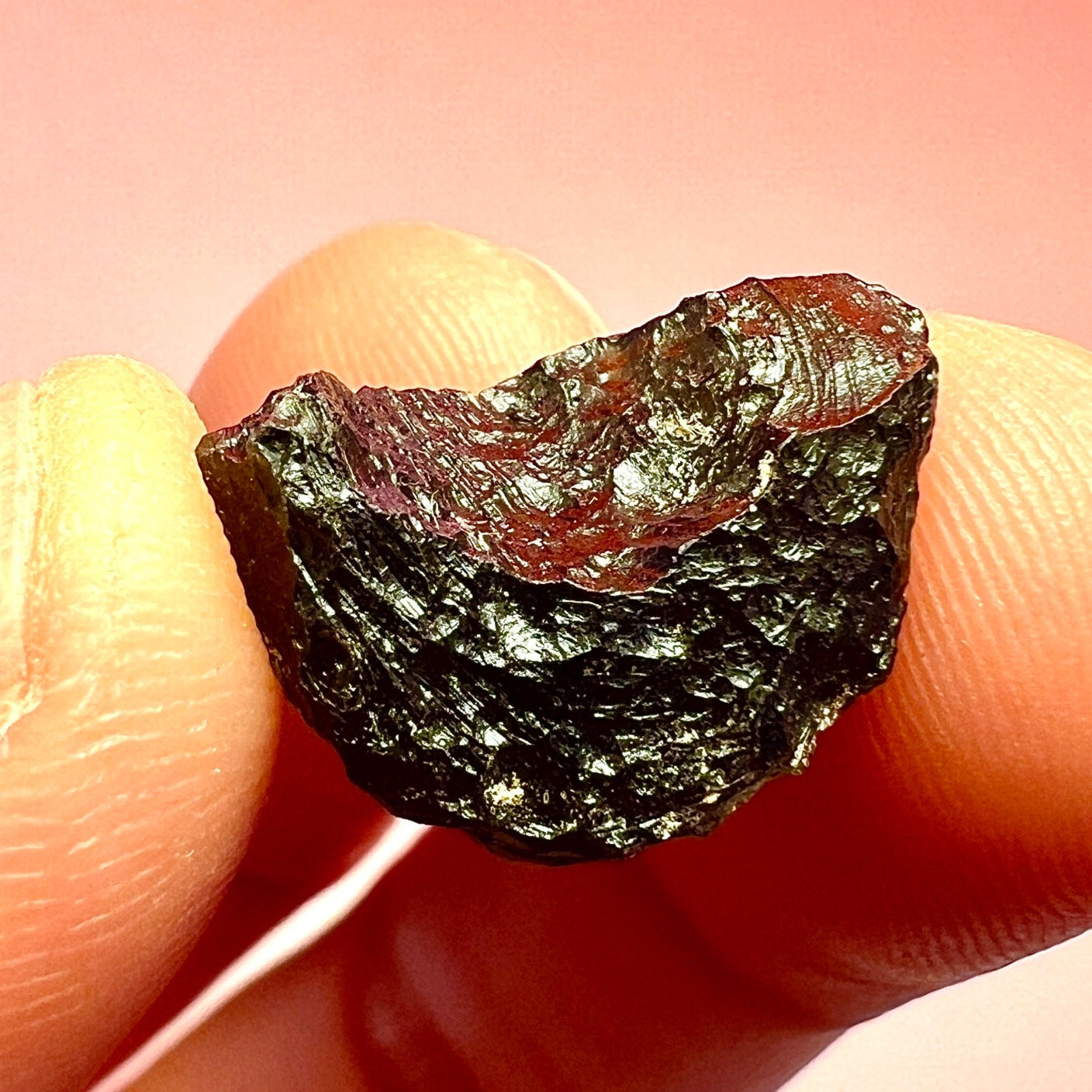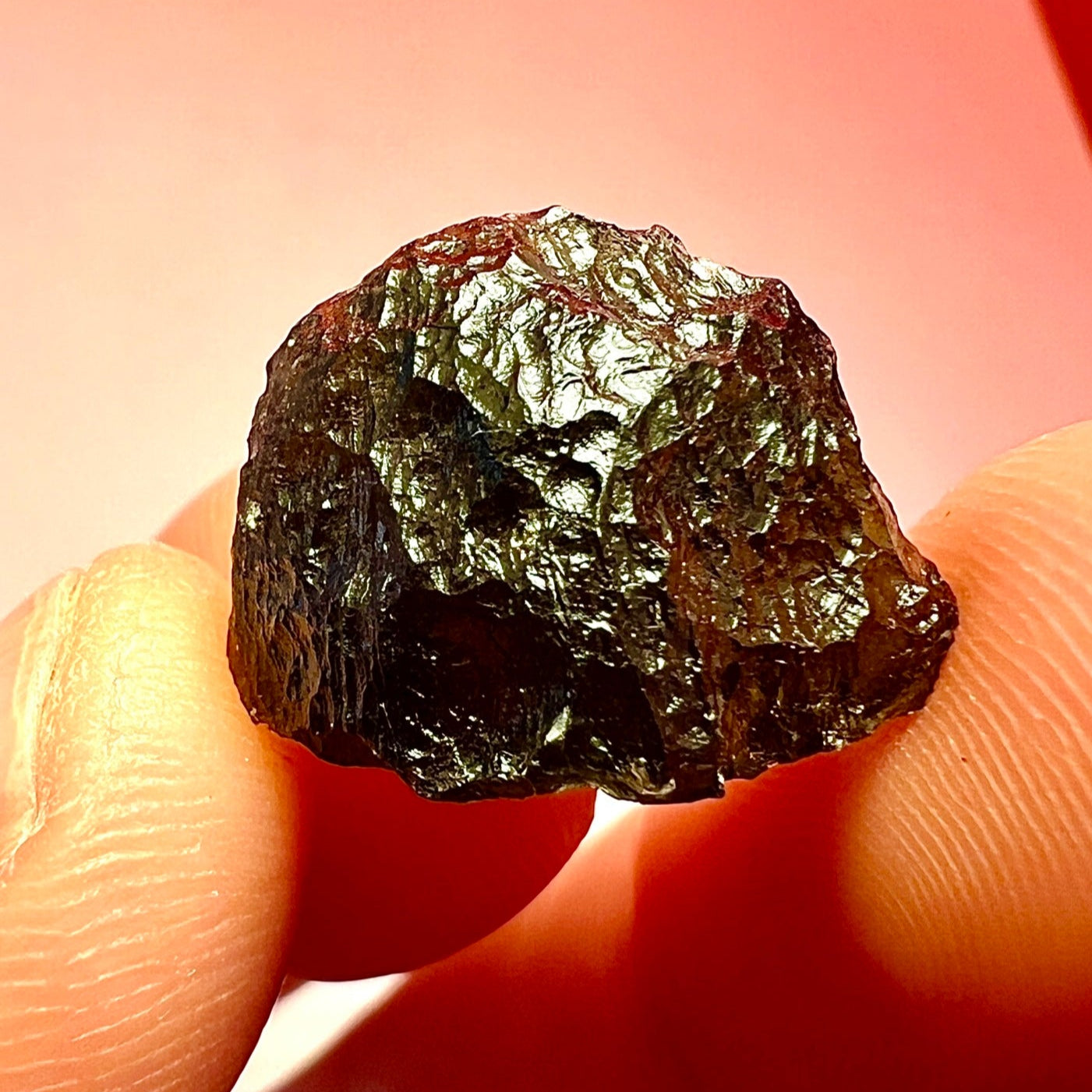 Moldavite is a rare tektite or meteoric glass, caused by an asteroid impact 15mil. years ago. The intense, 10,000°c+ temperatures of the strike vapourised the asteroid, target rock and sand, flinging the molten substance high into the atmosphere.