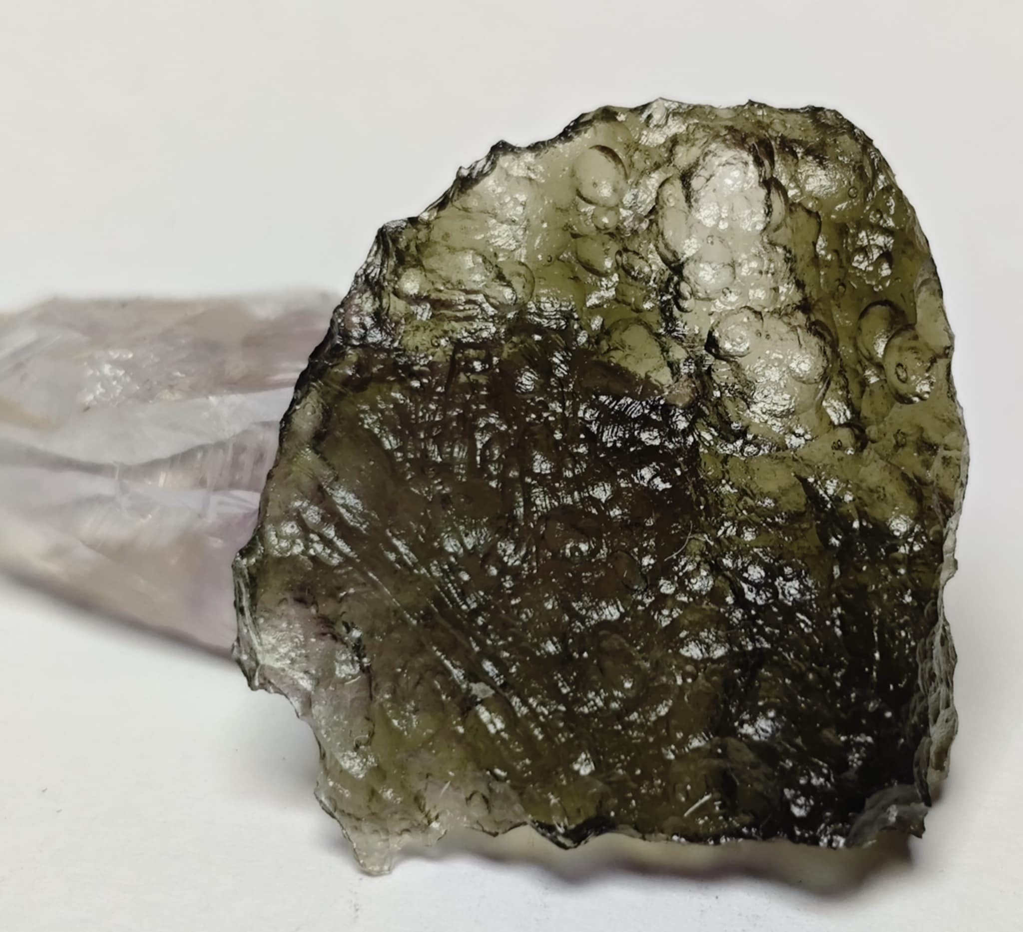 Moldavite is a rare tektite or meteoric glass, caused by an asteroid impact 15mil. years ago. The intense, 10,000°c+ temperatures of the strike vapourised the asteroid, target rock and sand, flinging the molten substance high into the atmosphere.