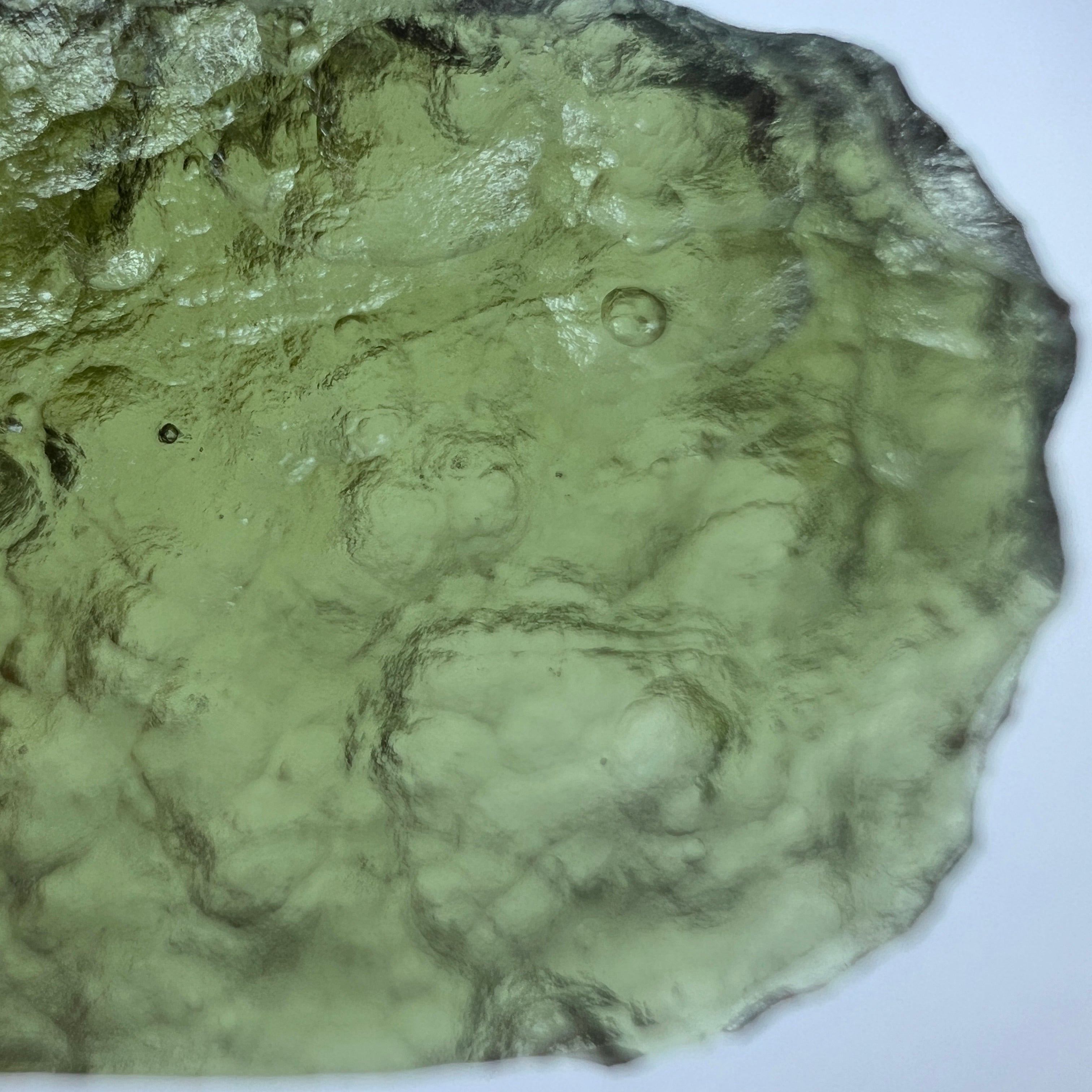 Moldavite is a rare tektite or meteoric glass, caused by an asteroid impact 15mil. years ago. The intense, 10,000°c+ temperatures of the strike vapourised the asteroid, target rock and sand, flinging the molten substance high into the atmosphere.