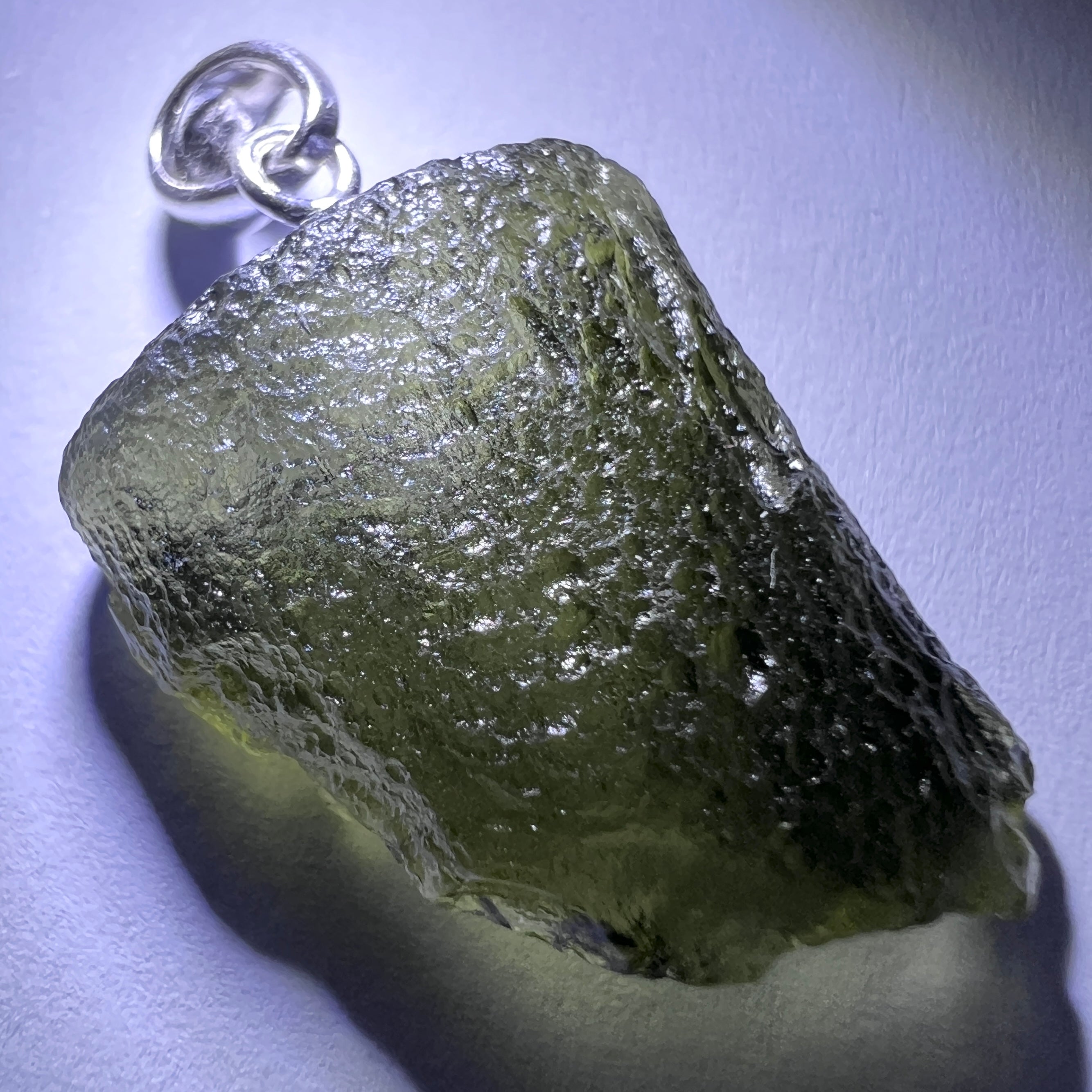 This style keeps the design intentionally simple so that the Moldavite itself remains the true focal point. With no heavy metal frame surrounding the stone, its natural texture, shape and translucent green colour can be admired without obstruction.