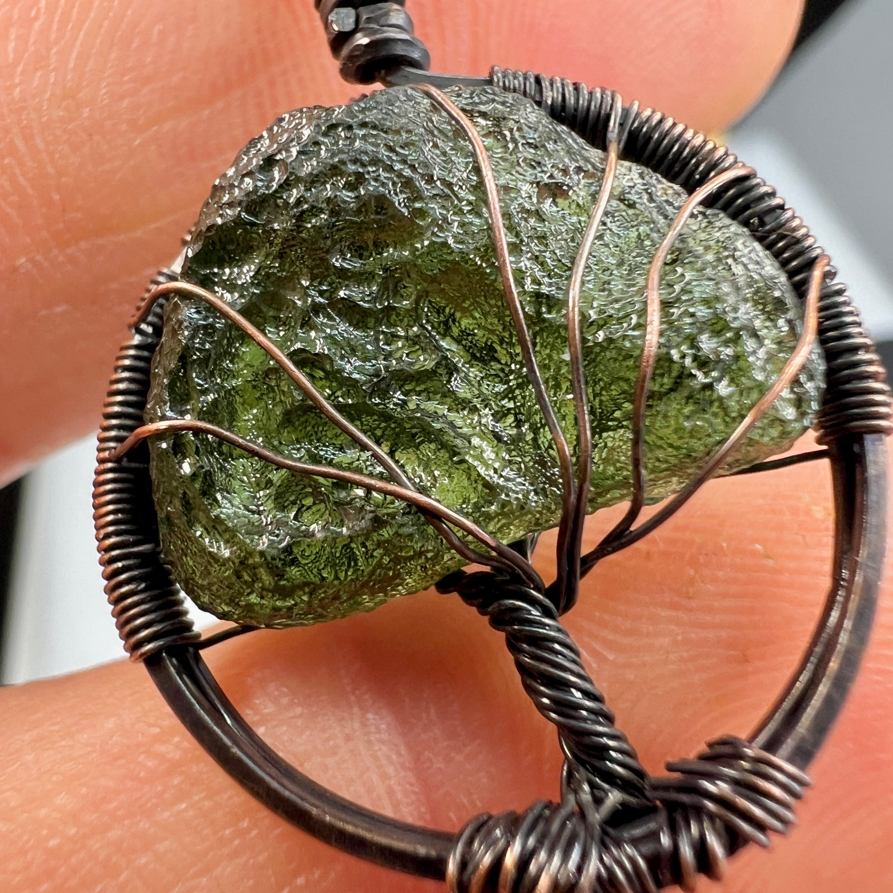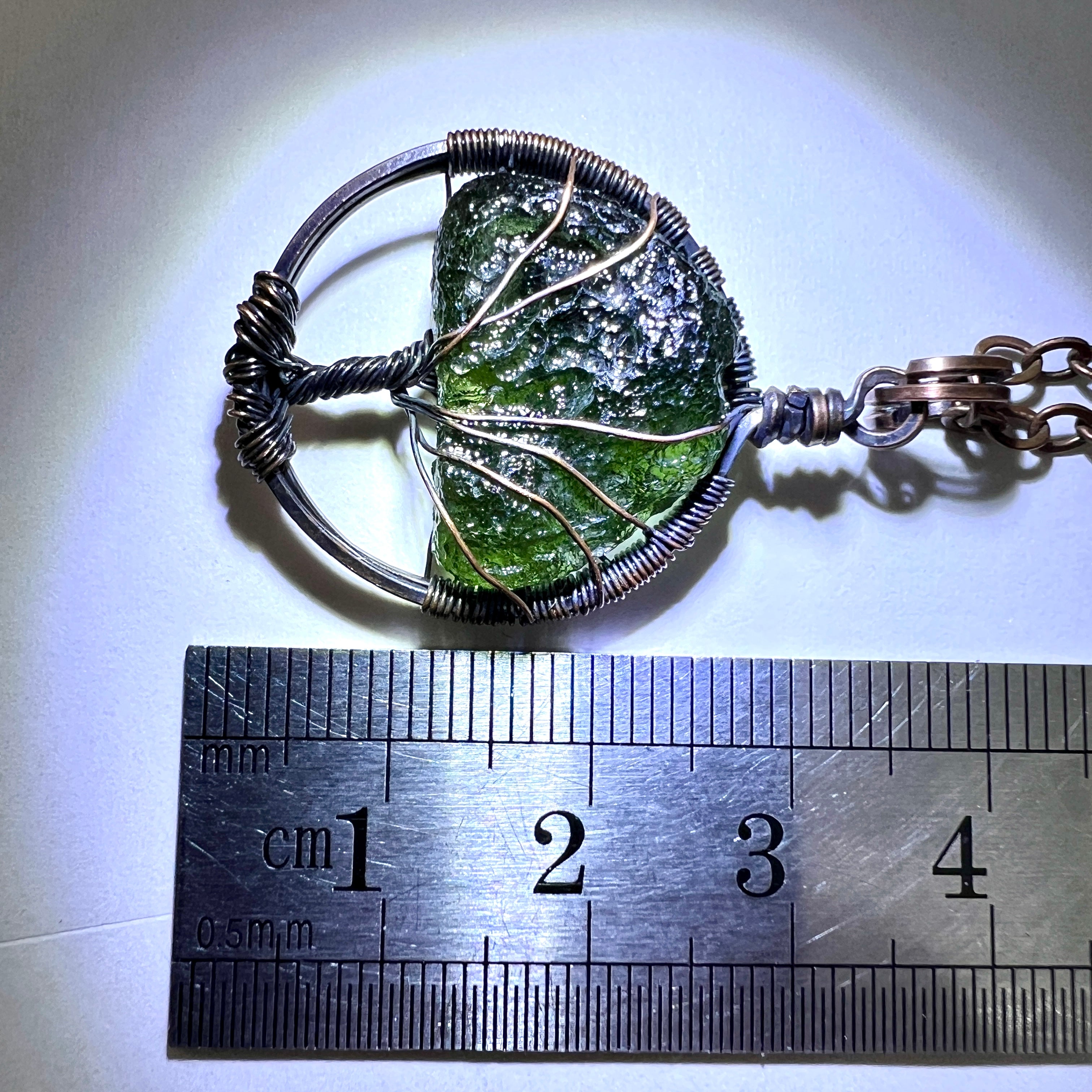 The Tree of Life—a timeless symbol of growth, balance, and renewal—is reimagined in this striking, one-of-a-kind copper-wrapped Moldavite pendant.