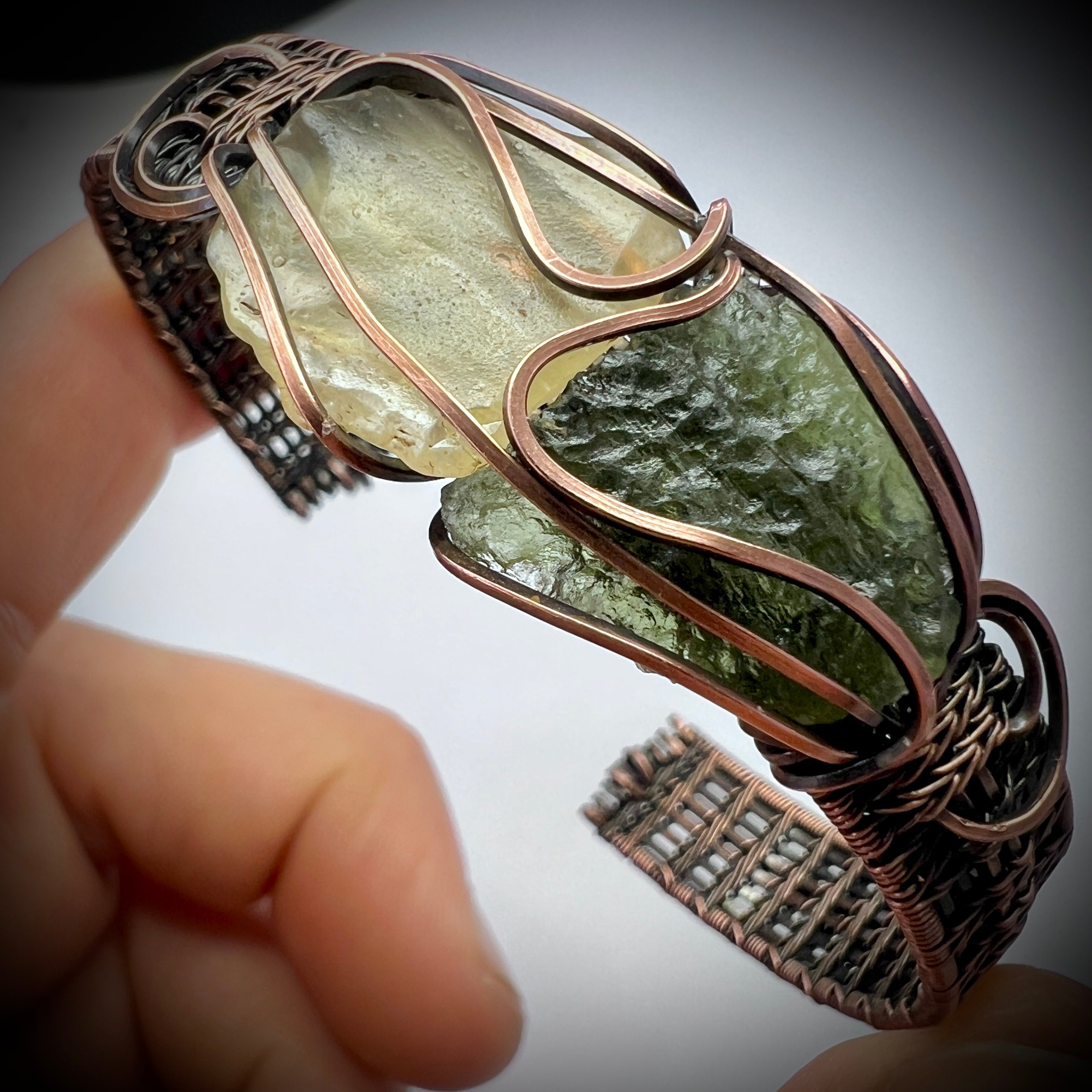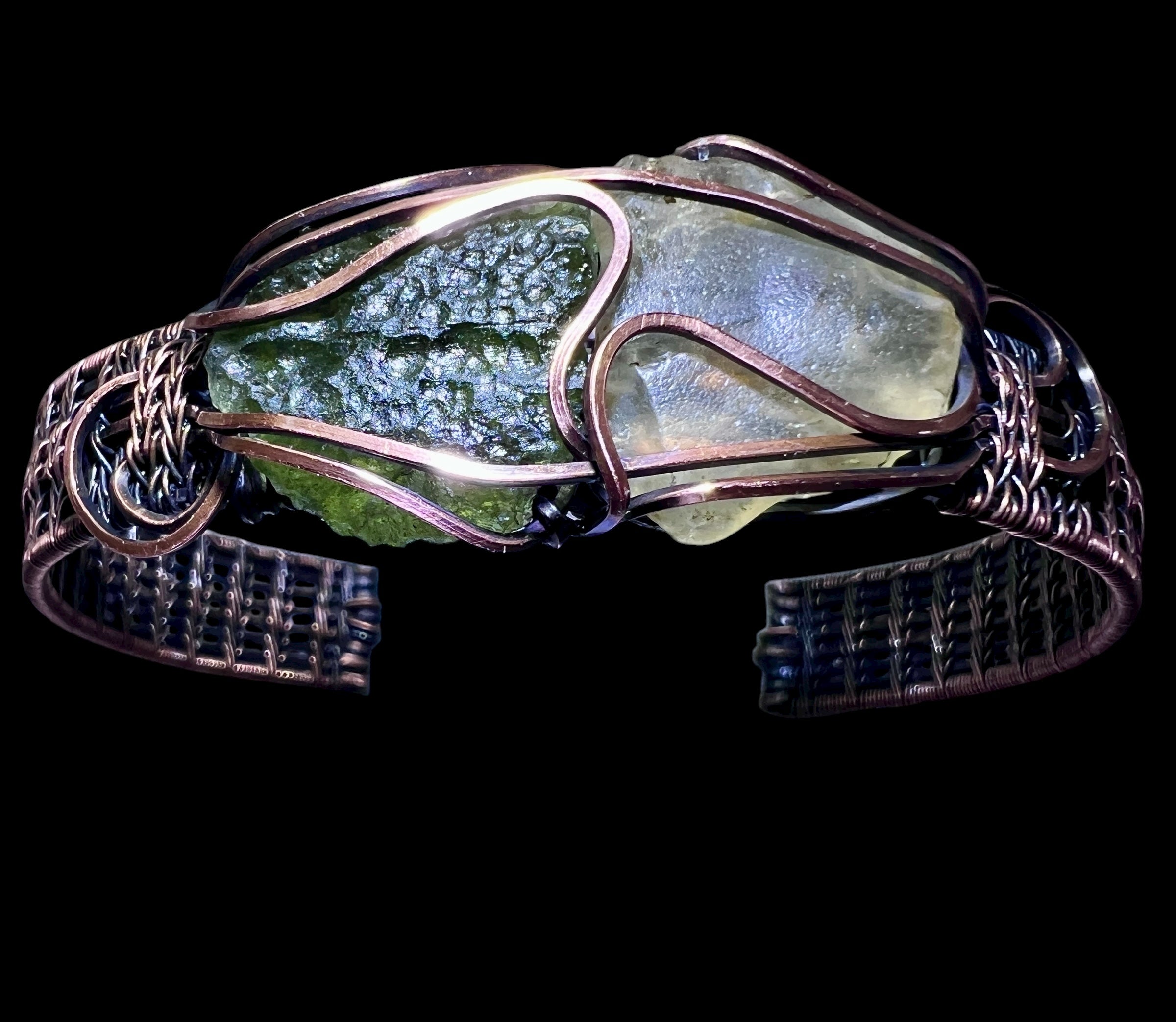 A handcrafted solid copper bracelet featuring a genuine 2.83-gram Chlum Moldavite paired with a natural 1.45-gram Libyan Desert Glass. This powerful combination unites two rare impact glasses formed by ancient cosmic events, set within a bold 11 mm thick copper band designed for both presence and durability.