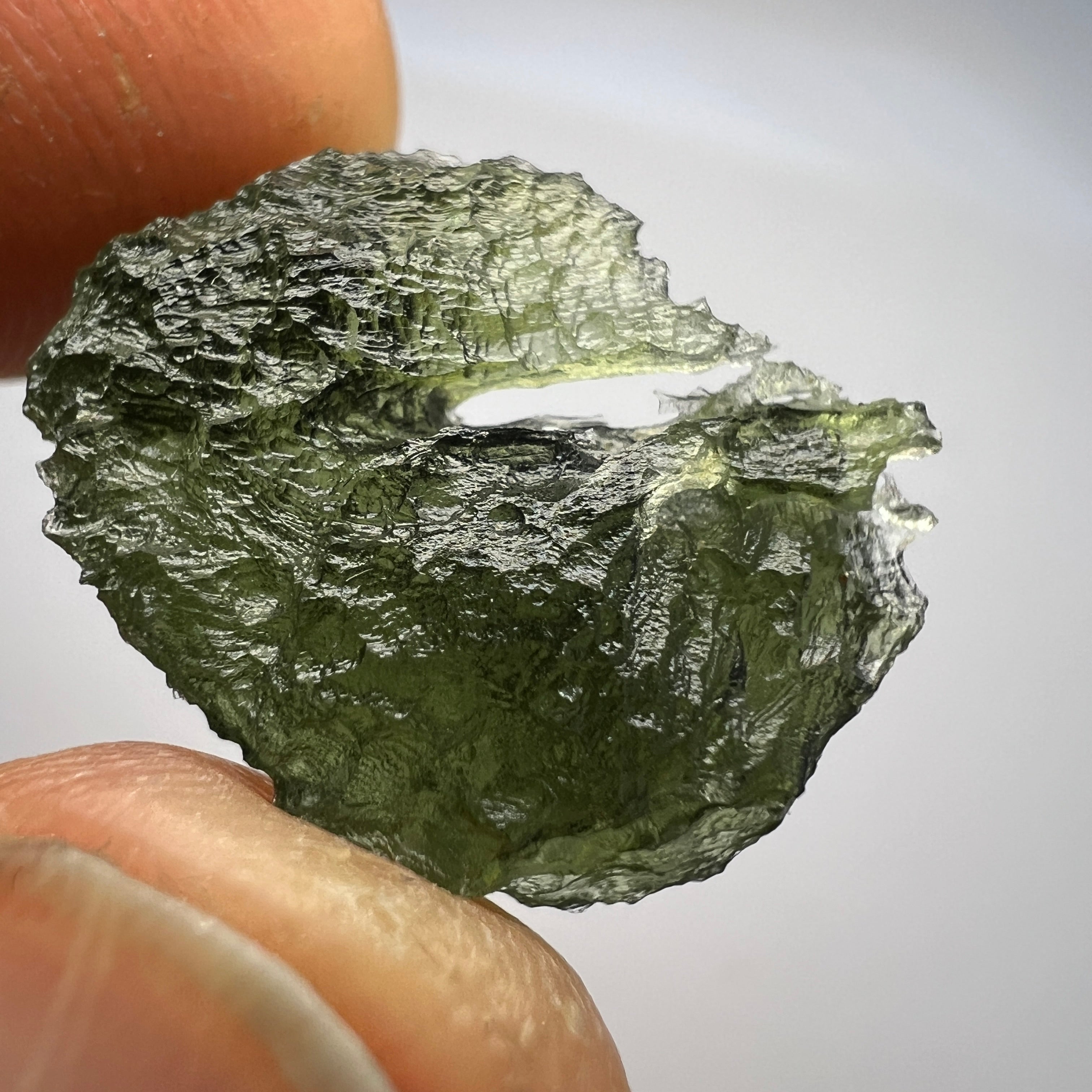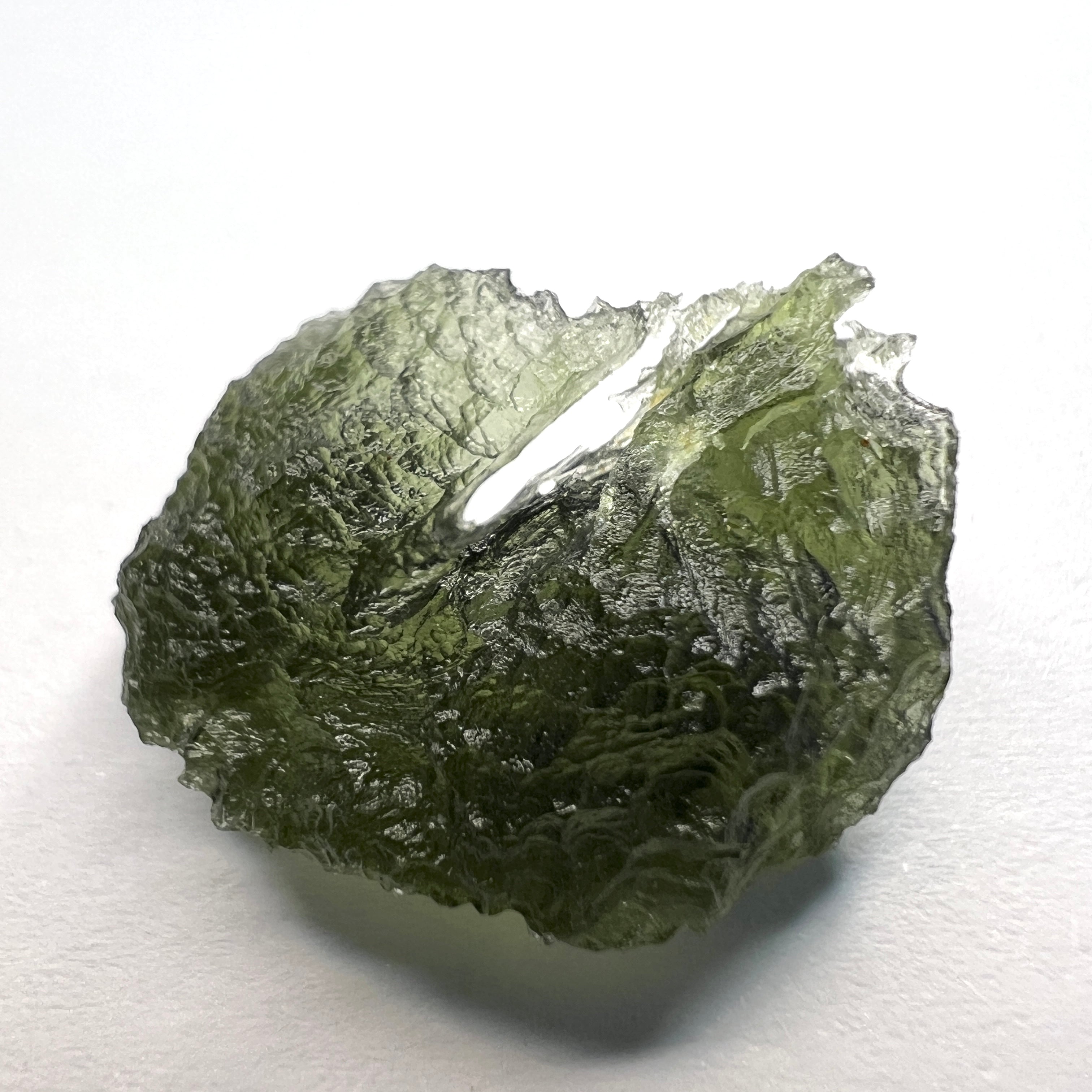 Interesting Moldavite specimen from Marouskovo Pole, featuring. a large open bubble on the back side