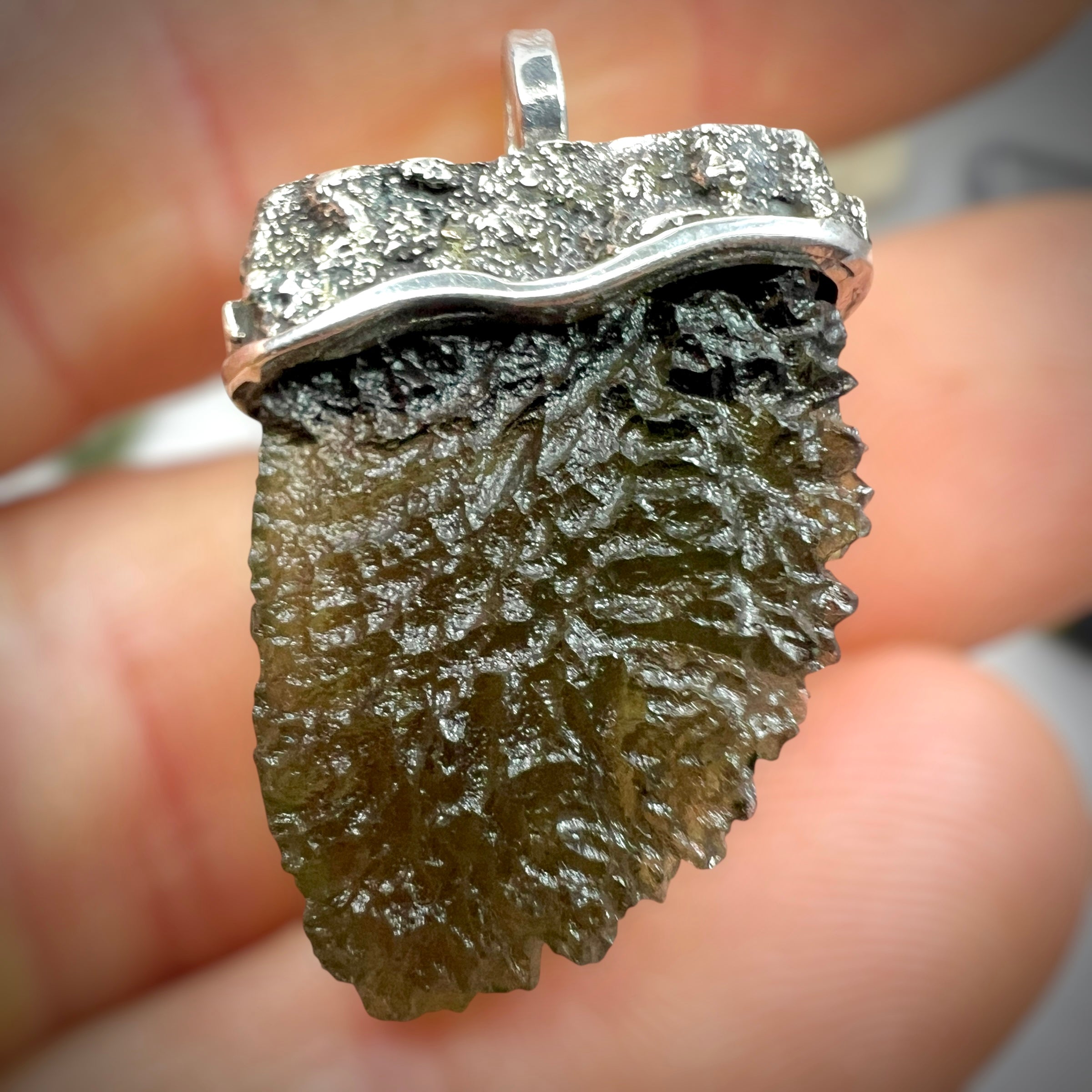 Sleek and radiant, this sterling silver pendant highlights a beautifully preserved 3.22-gram Moldavite from the Maly Chlum locality in the Czech Republic. The gem’s deep olive-green hue glows against the polished silver setting, while its natural texture — rich with delicate etchings — captures light with every movement. Designed for effortless elegance, the pendant’s minimal form allows the Moldavite’s raw beauty to take center stage.