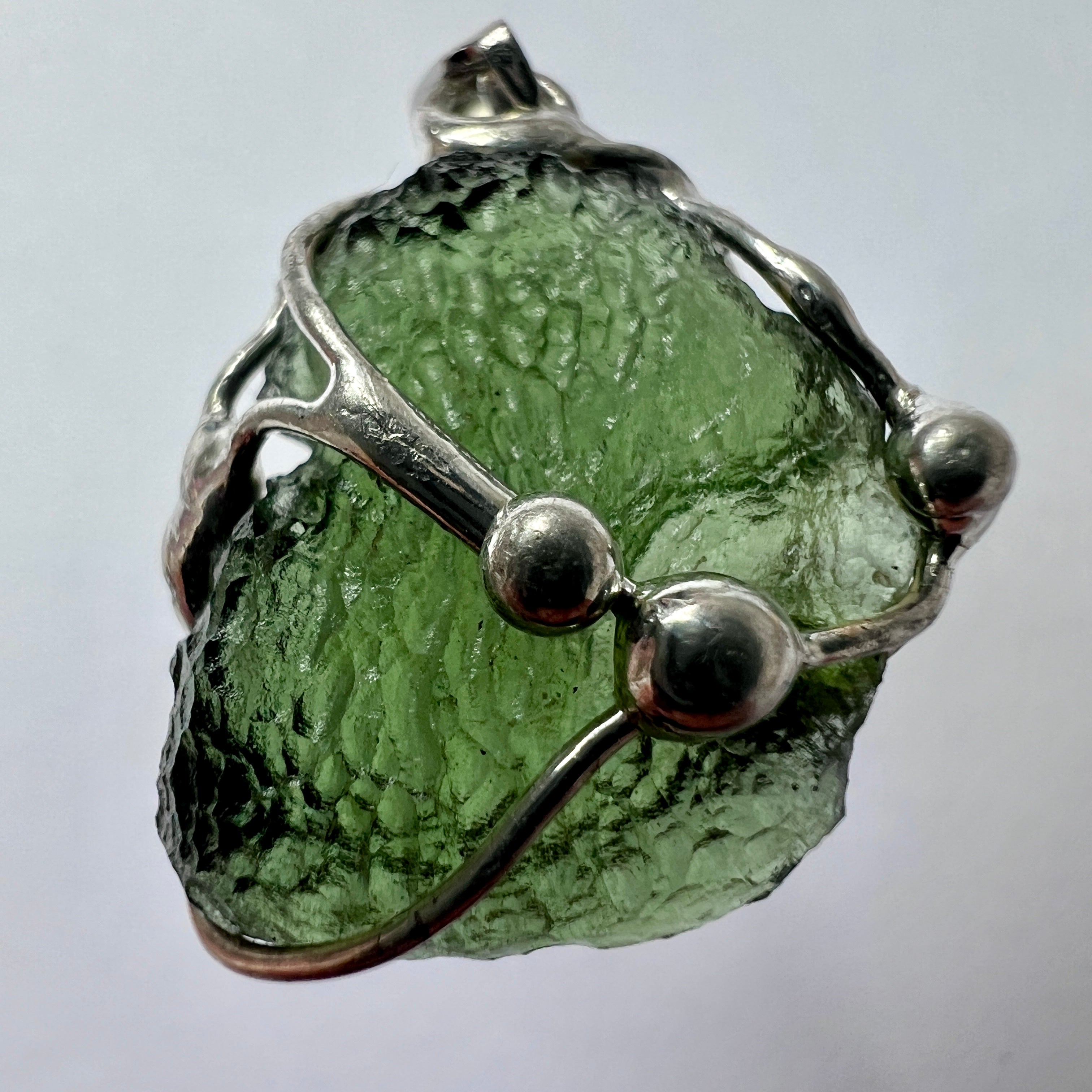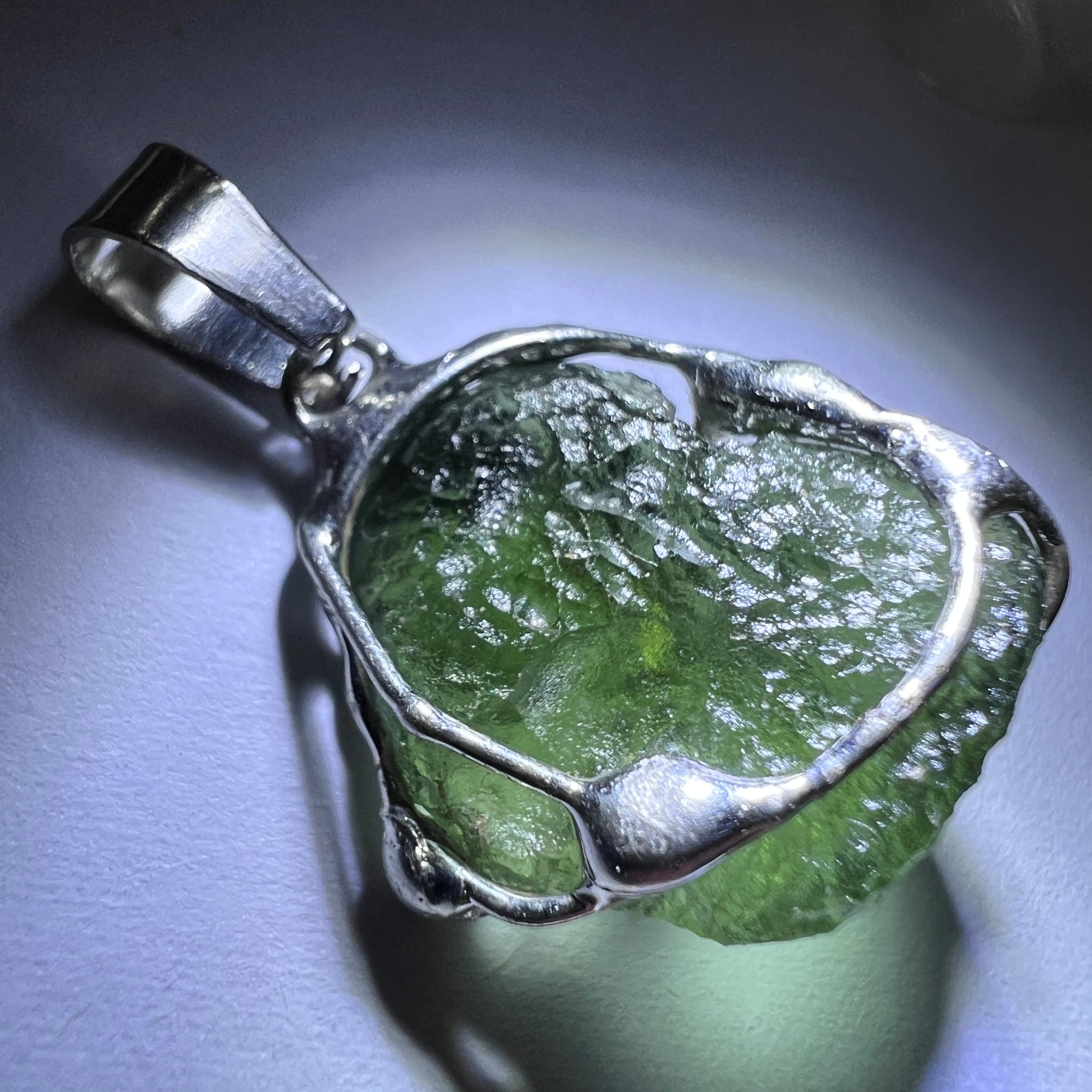 Charming Moldavite pendant featuring a flawless, exquisitely textured Moldavite specimen from Maly Chlum weighing 3.25 grams.