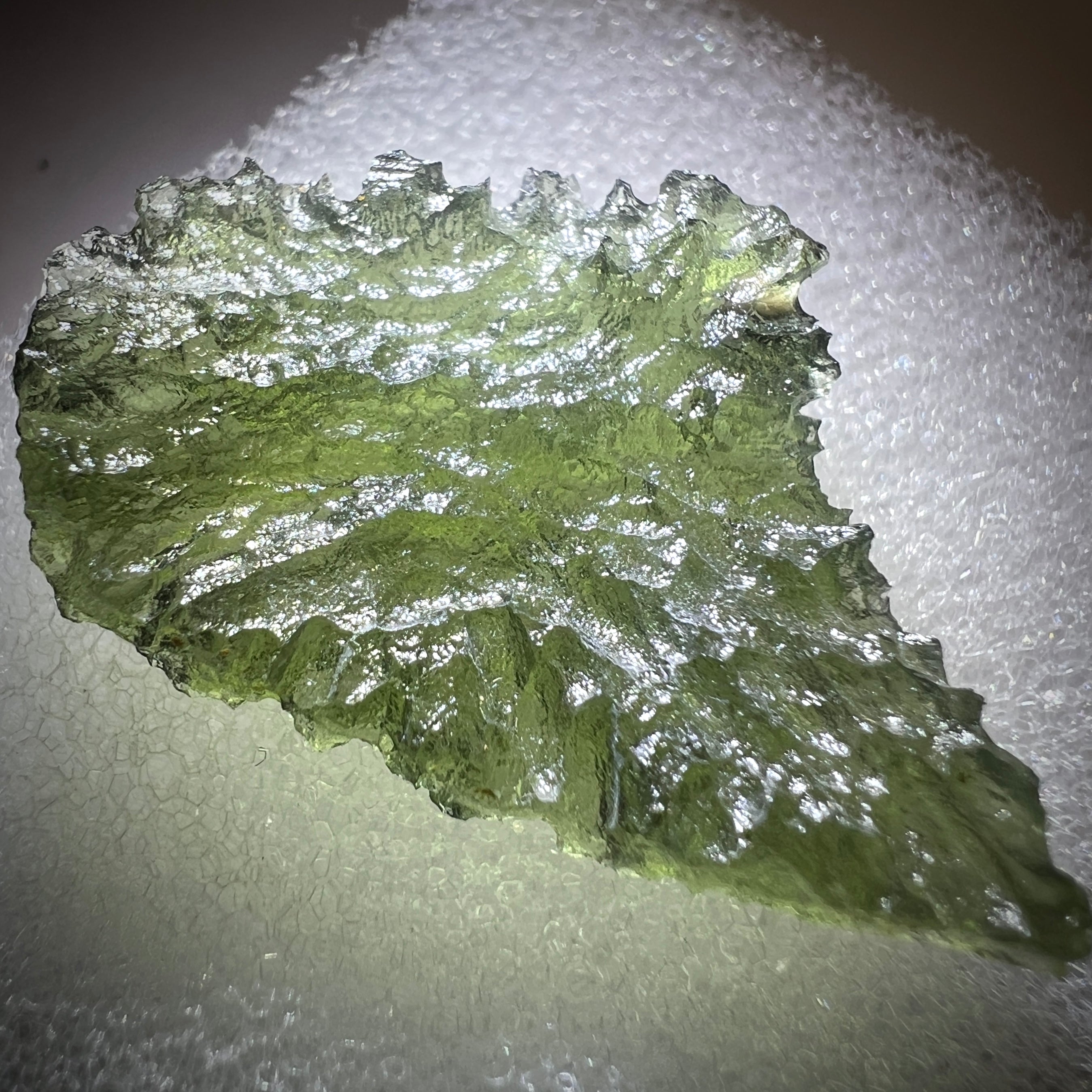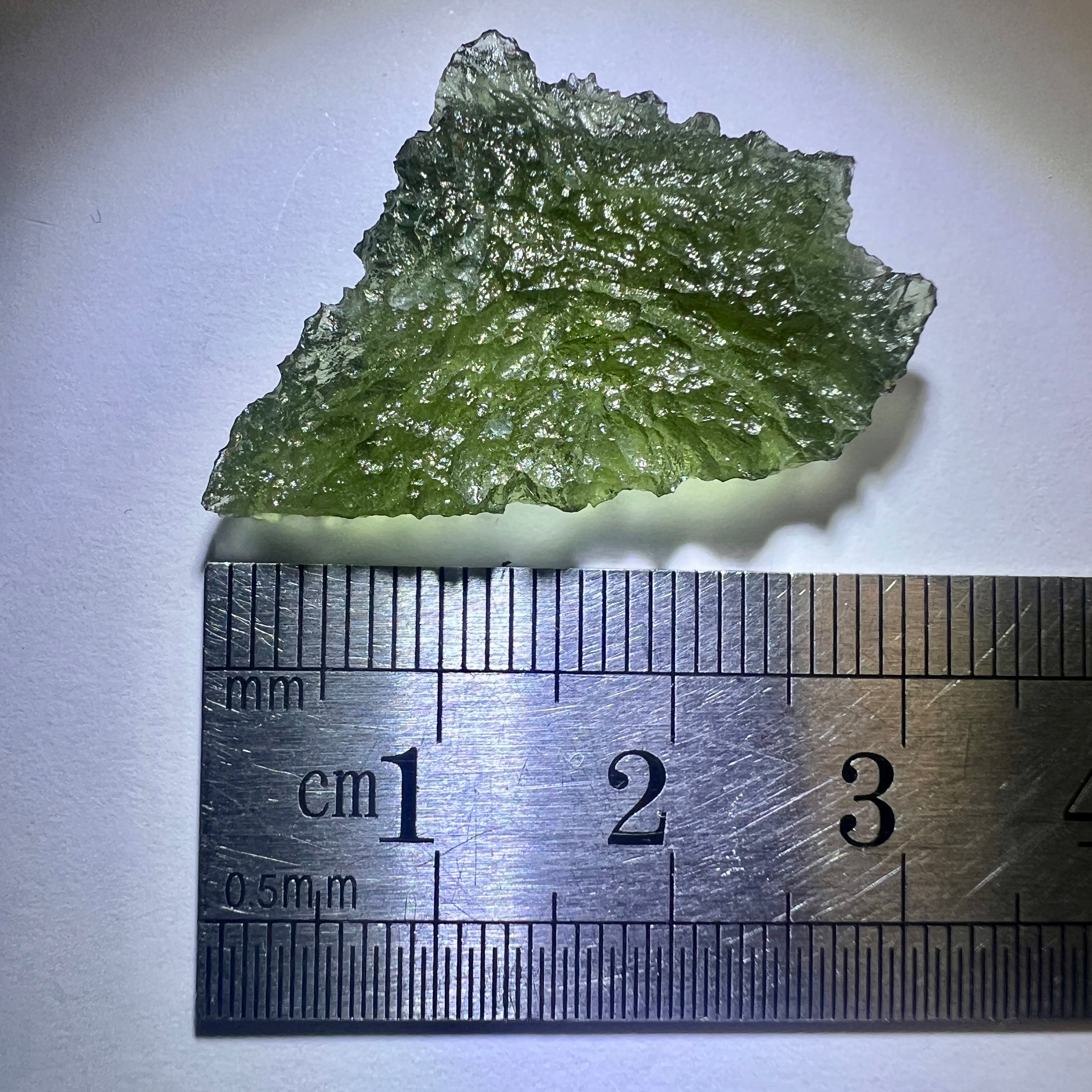This 3.29 g Moldavite from Maly Chlum, Czech Republic showcases a beautifully etched surface with natural ridges and grooves that tell the story of its cosmic origin. Its deep green colour shifts subtly under light, revealing hints of translucence and inner depth. Every contour is shaped entirely by nature, untouched, uncut, and unpolished, preserving its raw authenticity.