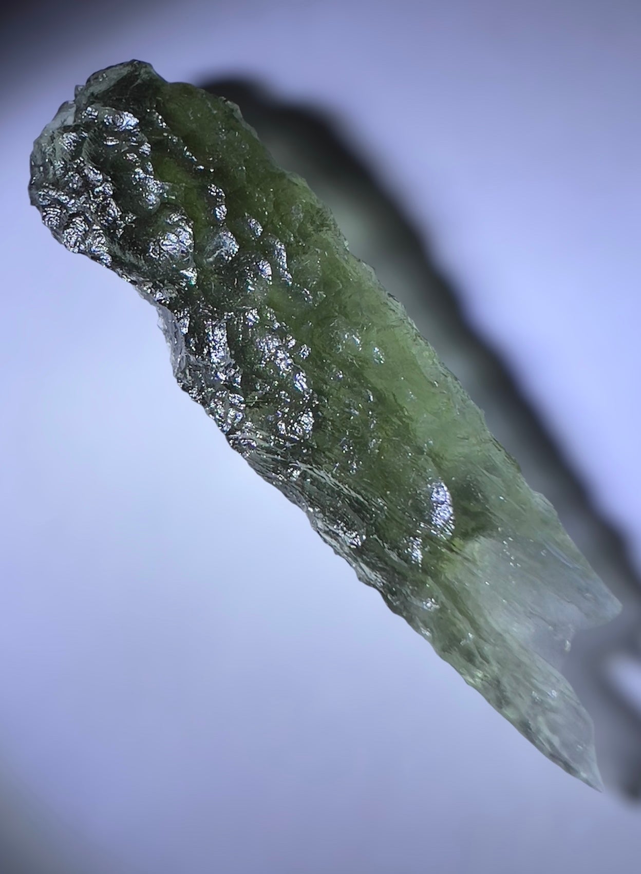 Moldavite is a rare tektite or meteoric glass, caused by an asteroid impact 15mil. years ago. The intense, 10,000°c+ temperatures of the strike vapourised the asteroid, target rock and sand, flinging the molten substance high into the atmosphere.