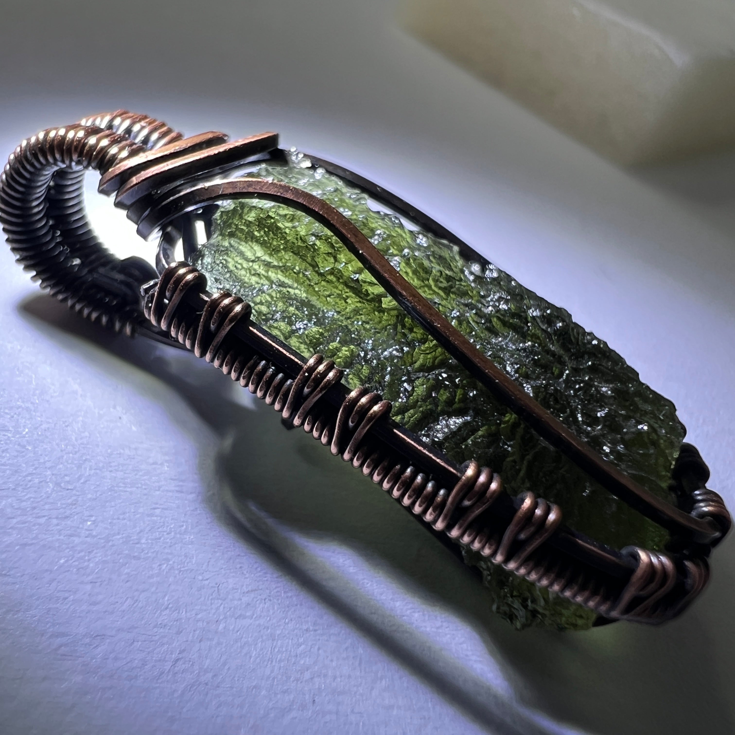 Visually, the rustic glow of antiqued copper harmonizes with Moldavite’s deep forest-green hue, giving the piece a timeless, organic look. Energetically, copper acts as a bridge between the heavens and the earth, mirroring Moldavite’s origin—born from the union of cosmic impact and terrestrial matter. Together, they form a powerful combination: Moldavite for awakening and transformation, and copper for grounding, circulation, and amplification.