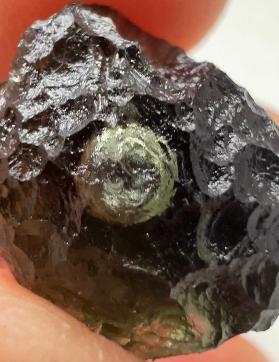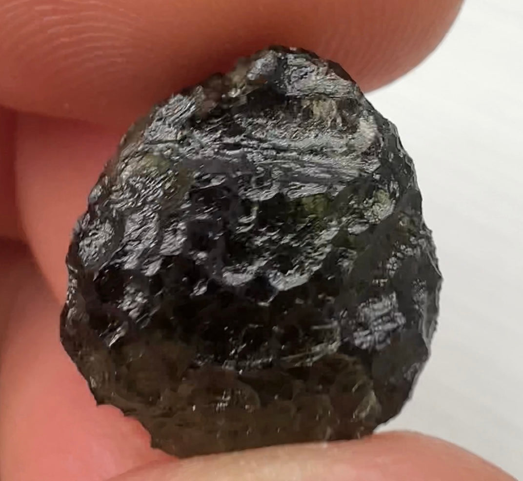 Moldavite is a rare tektite or meteoric glass, caused by an asteroid impact 15mil. years ago. The intense, 10,000°c+ temperatures of the strike vapourised the asteroid, target rock and sand, flinging the molten substance high into the atmosphere.
