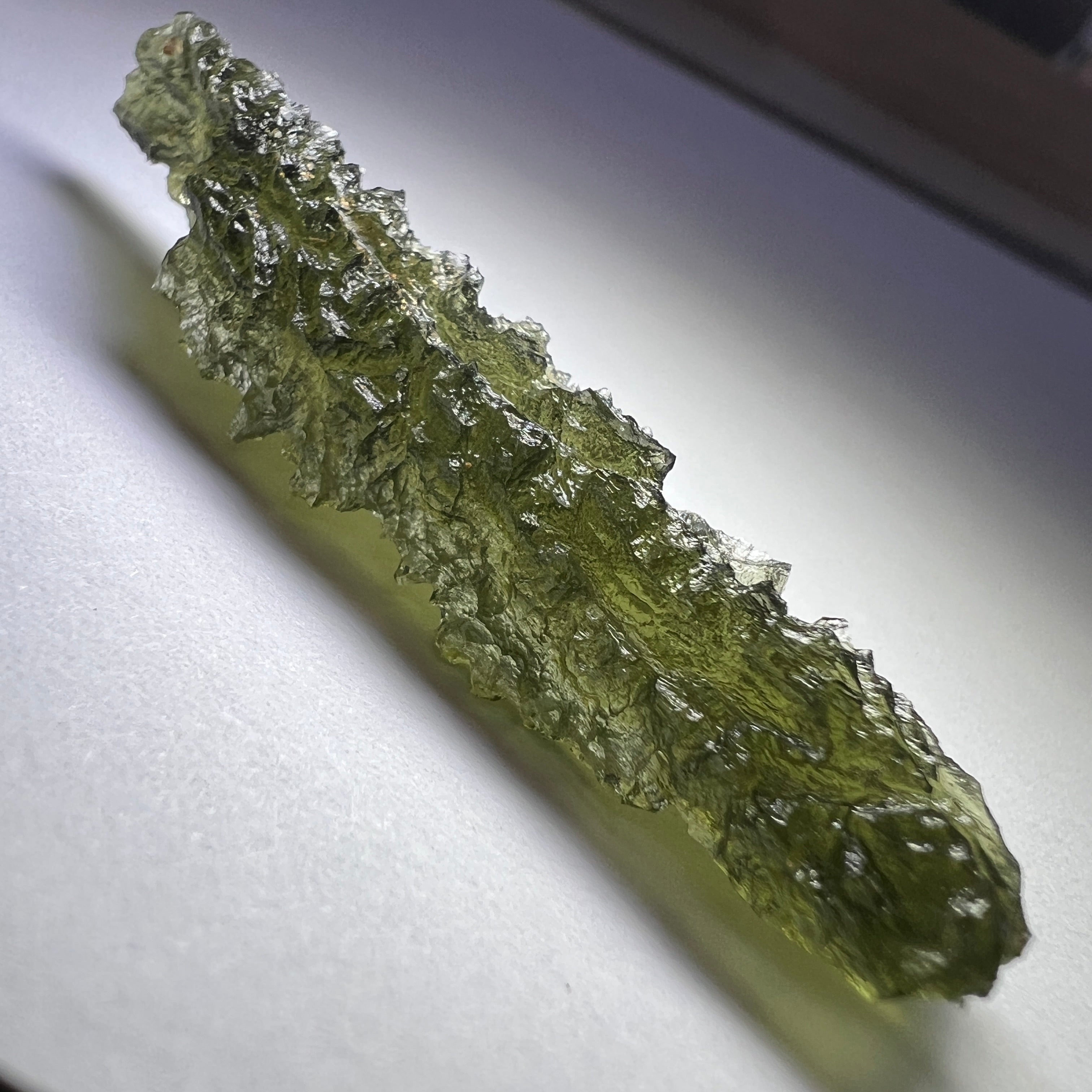 This deeply textured “stick” Moldavite displays pronounced natural surface sculpting formed during its violent atmospheric re-entry over 15 million years ago. Measuring 50 x 12 x 9 mm, the stone is perfectly intact and undamaged. The texture, elongated form, translucency, and colour are all consistent with authentic South Bohemian Moldavite from the Marouskovo Pole locality.