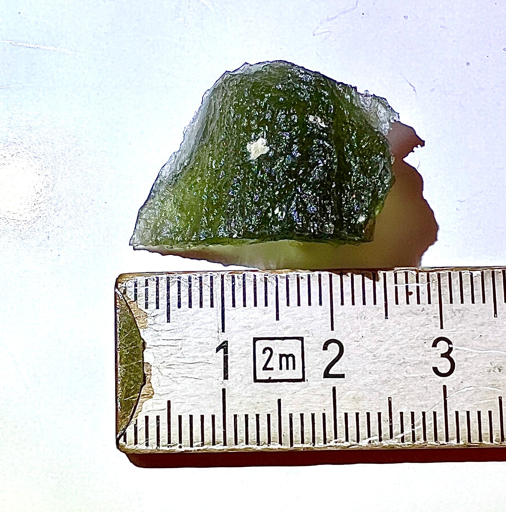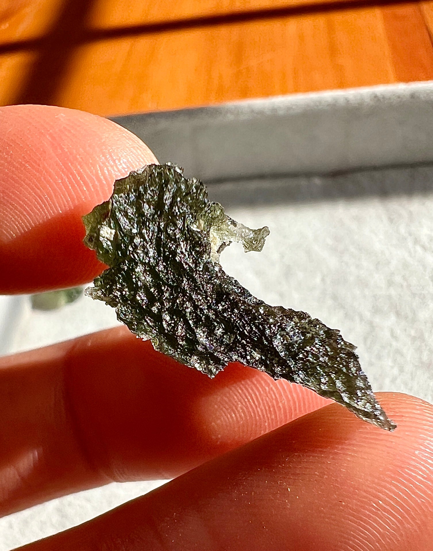 Moldavite is a rare tektite or meteoric glass, caused by an asteroid impact 15mil. years ago. The intense, 10,000°c+ temperatures of the strike vapourised the asteroid, target rock and sand, flinging the molten substance high into the atmosphere.