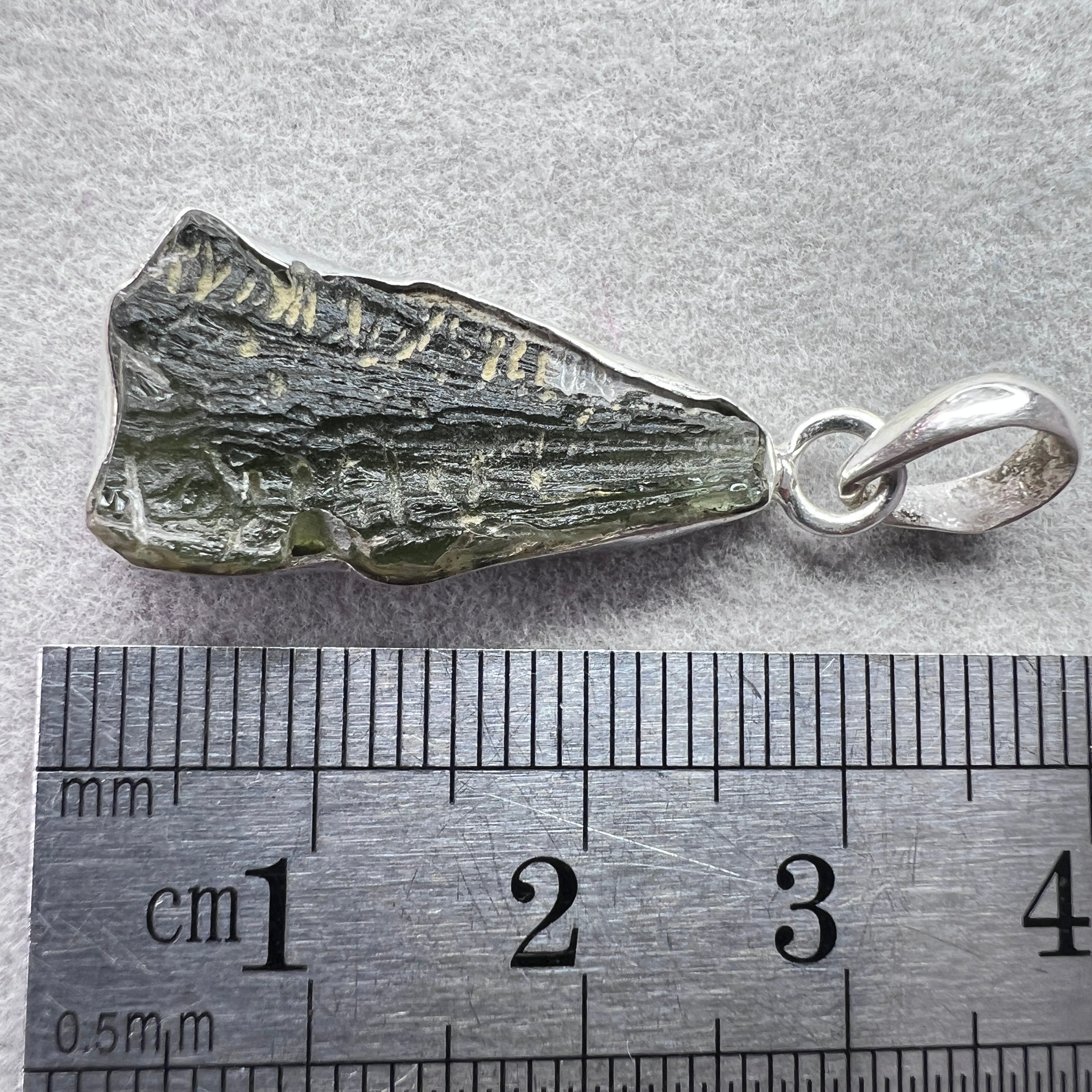 Authentic 3.03g-gram Moldavite from Chlum, set in a sterling silver setting that highlights its natural texture and vibrant green color.