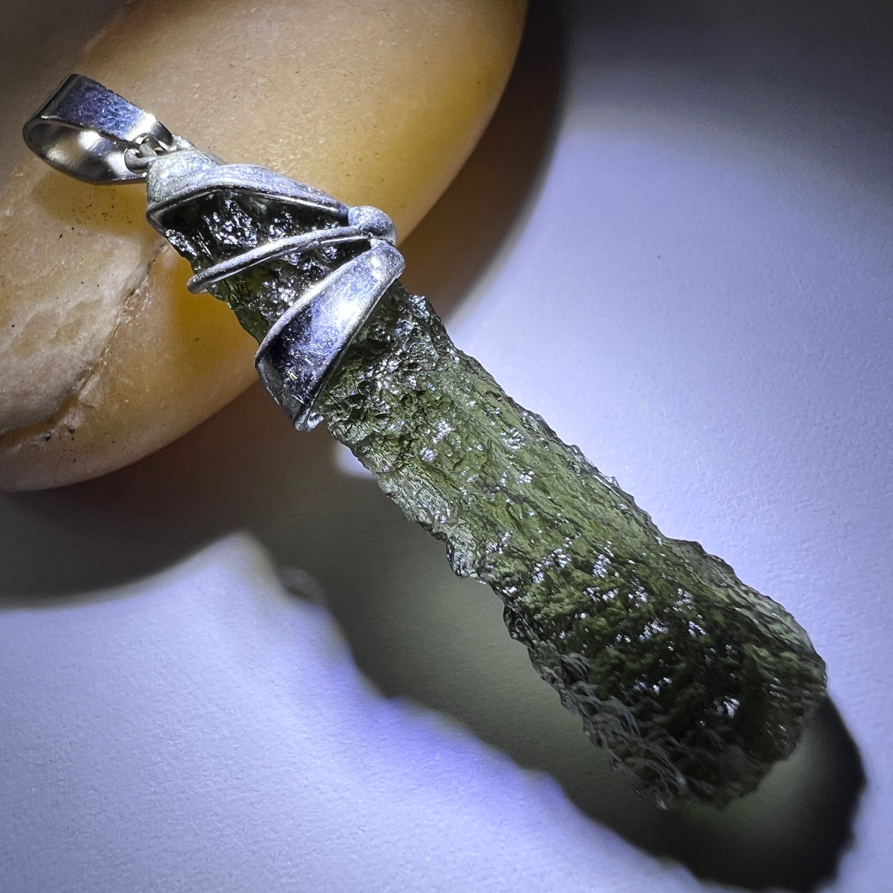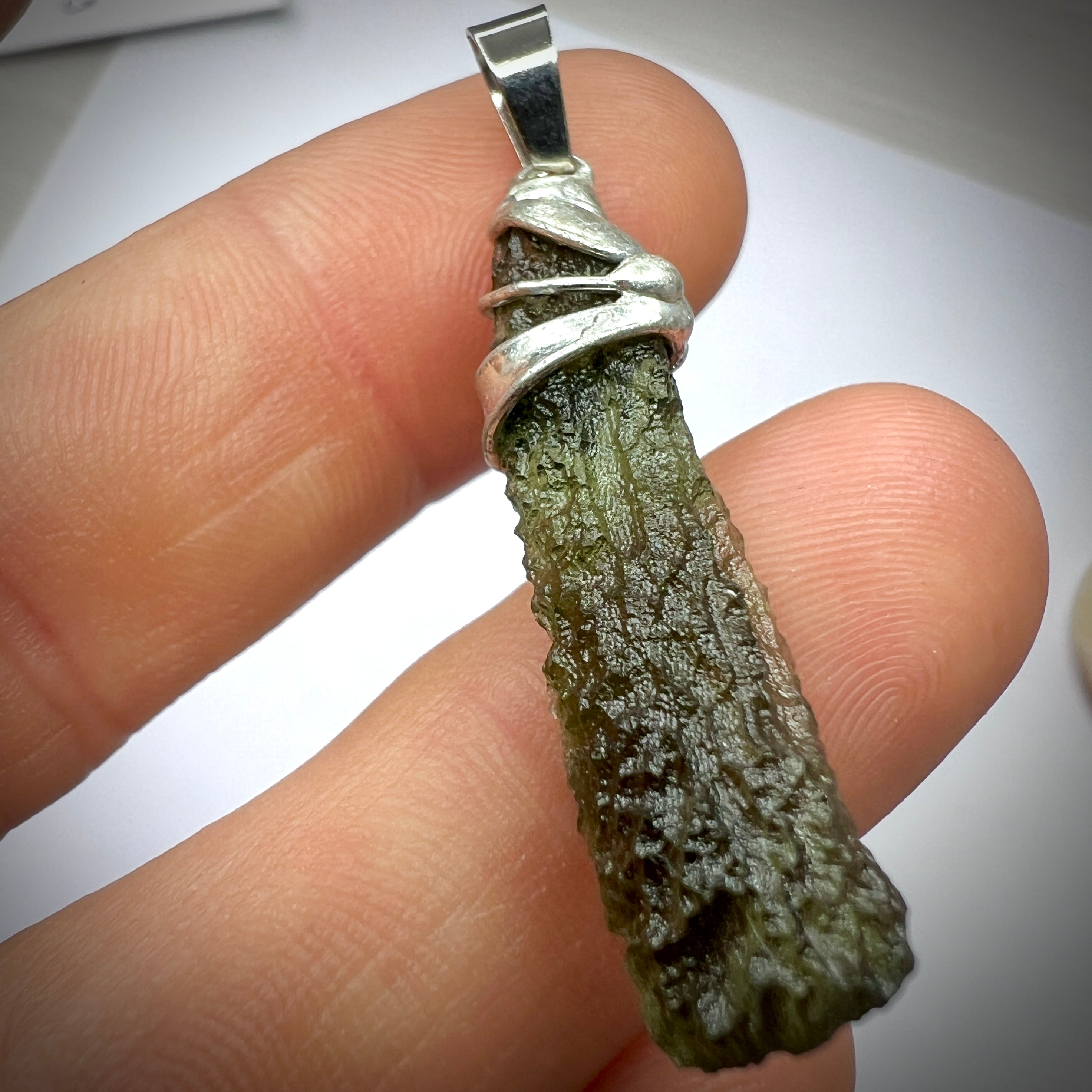 A charming and Moldavite pendant, naturally shaped like a slightly twisted stick and sourced from the renowned Chlum locality in the Czech Republic. This 3.9 gram specimen displays a vivid olive-green hue with delicate surface etching characteristic of genuine Moldavite from this region.