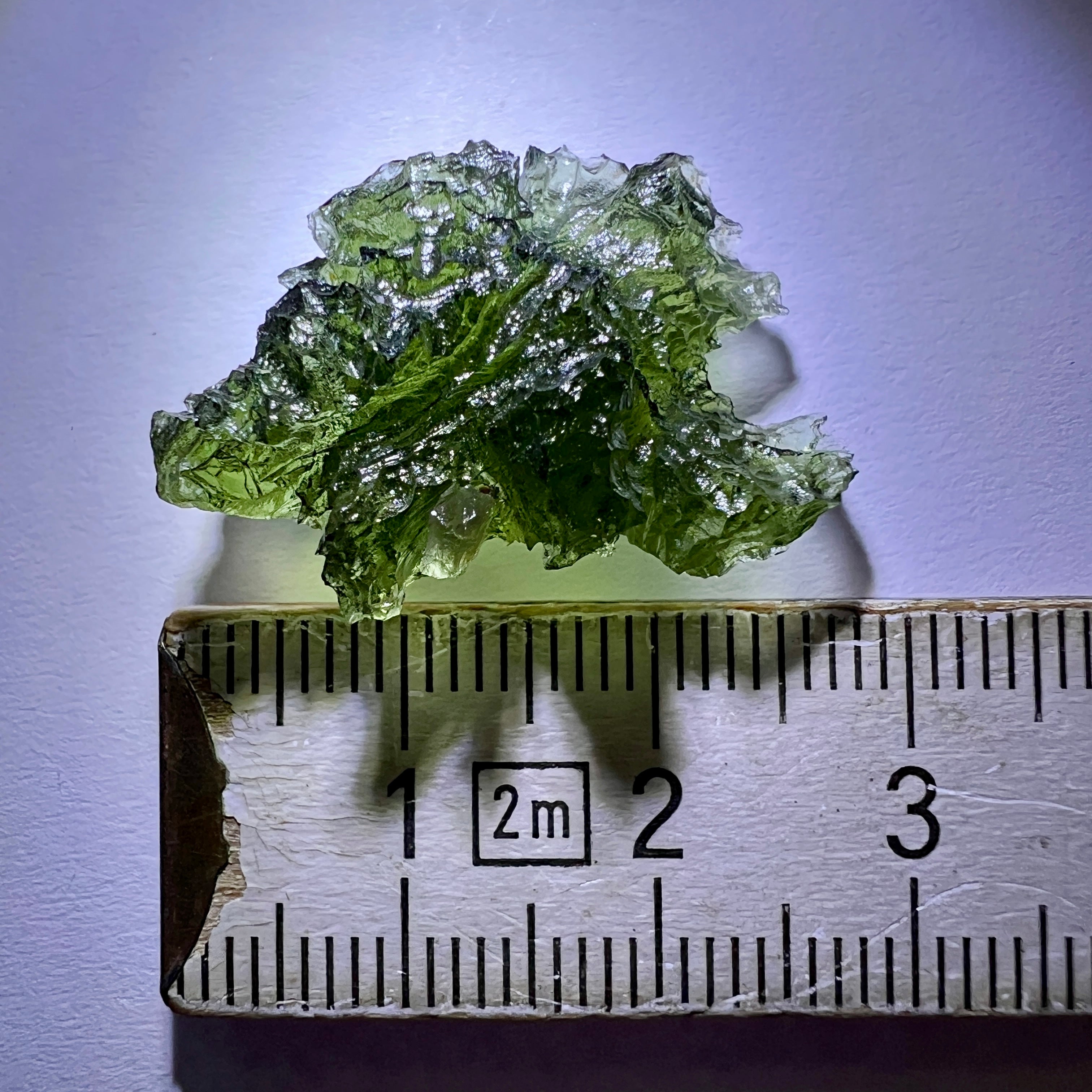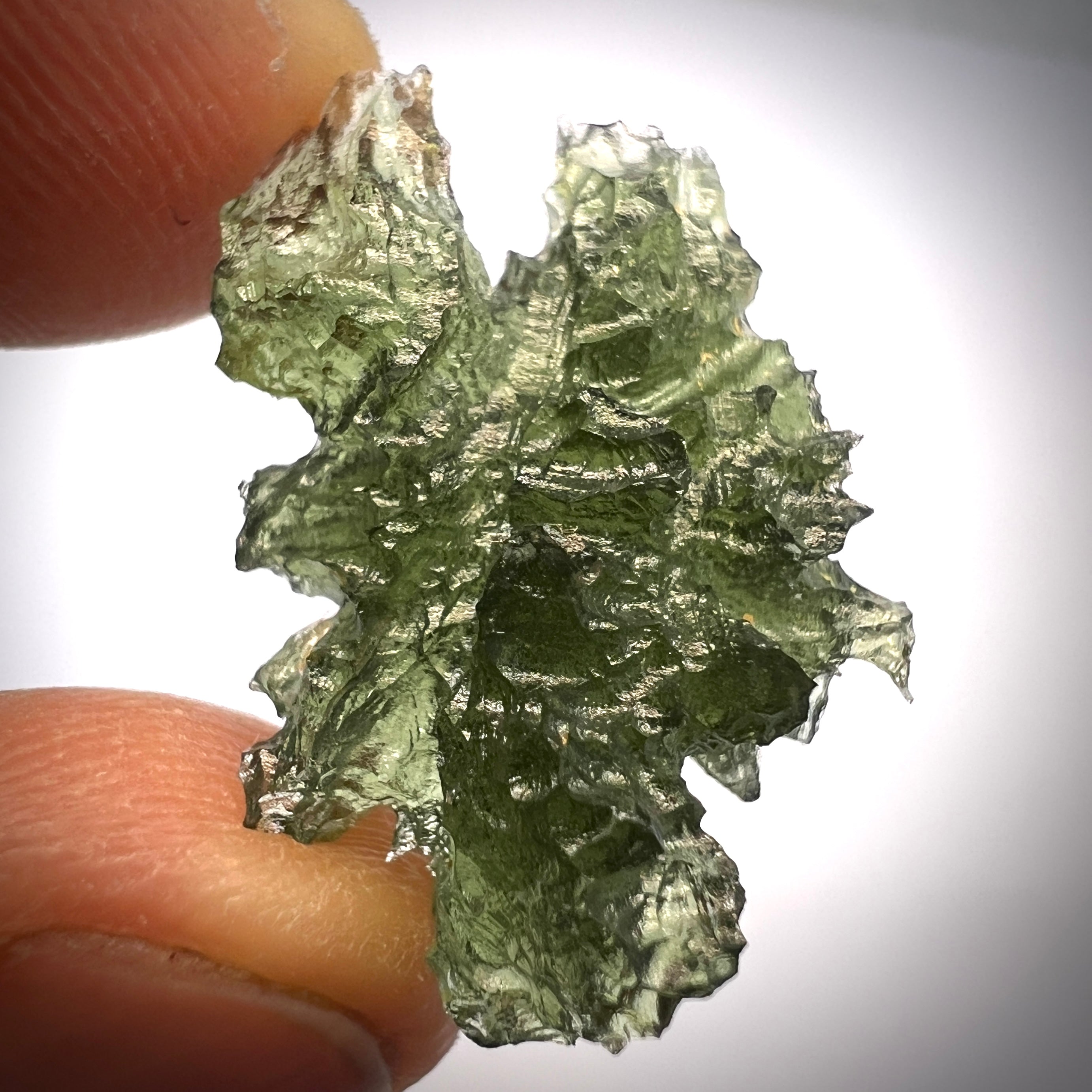 Weighing 4.02 grams, this Moldavite from Maly Chlum, Czech Republic features a deeply etched, sharply defined surface texture with intricate grooves and natural ridges unique to this locality. Its rich olive-green hue shifts beautifully under light, revealing translucent areas that highlight the stone’s natural depth and clarity. The edges are rugged yet refined, showcasing how perfectly nature sculpts each genuine Moldavite through heat, pressure, and time.
