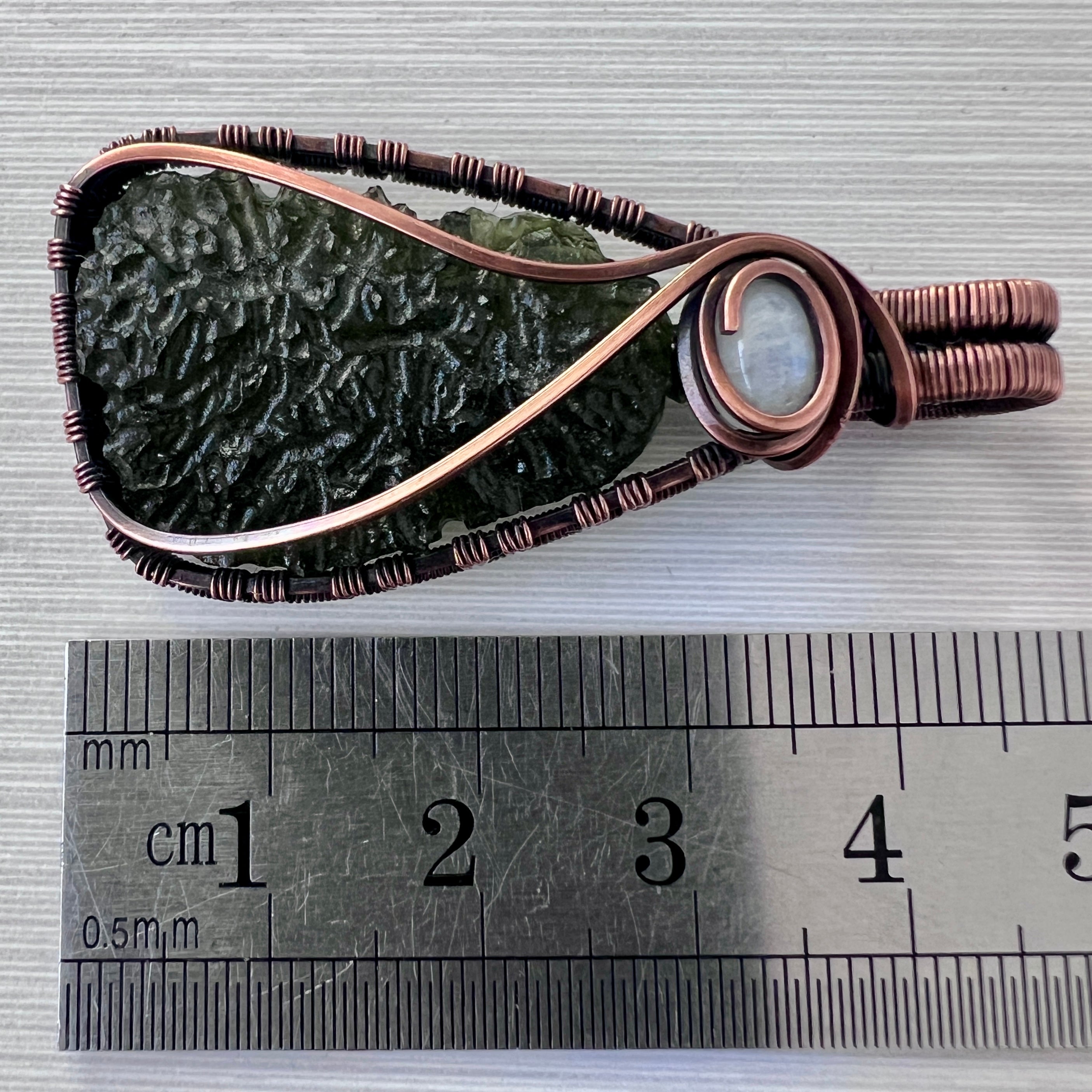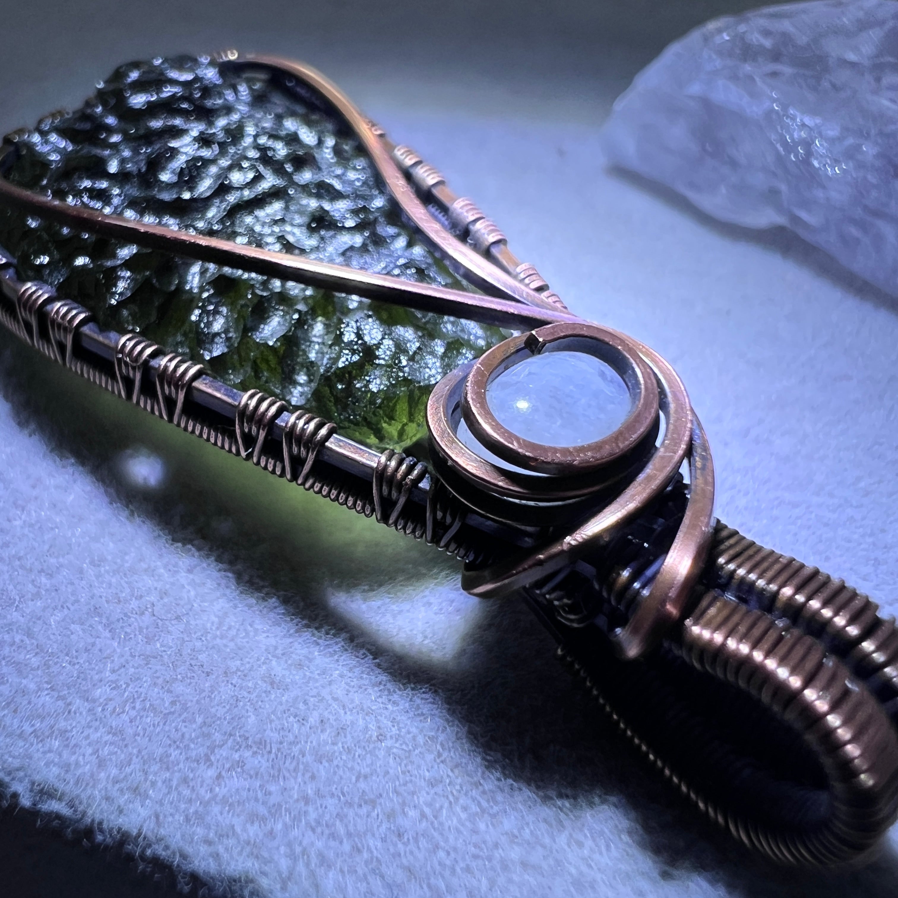 This masterfully handcrafted pendant features a beautifully textured 4.52-gram Moldavite from the Malý Chlum. The design is elevated by the addition of a deep purple Amethyst and a glowing Moonstone, all artfully secured within an intricate copper wire wrap that highlights the natural, "sculpted" texture of the tektite.