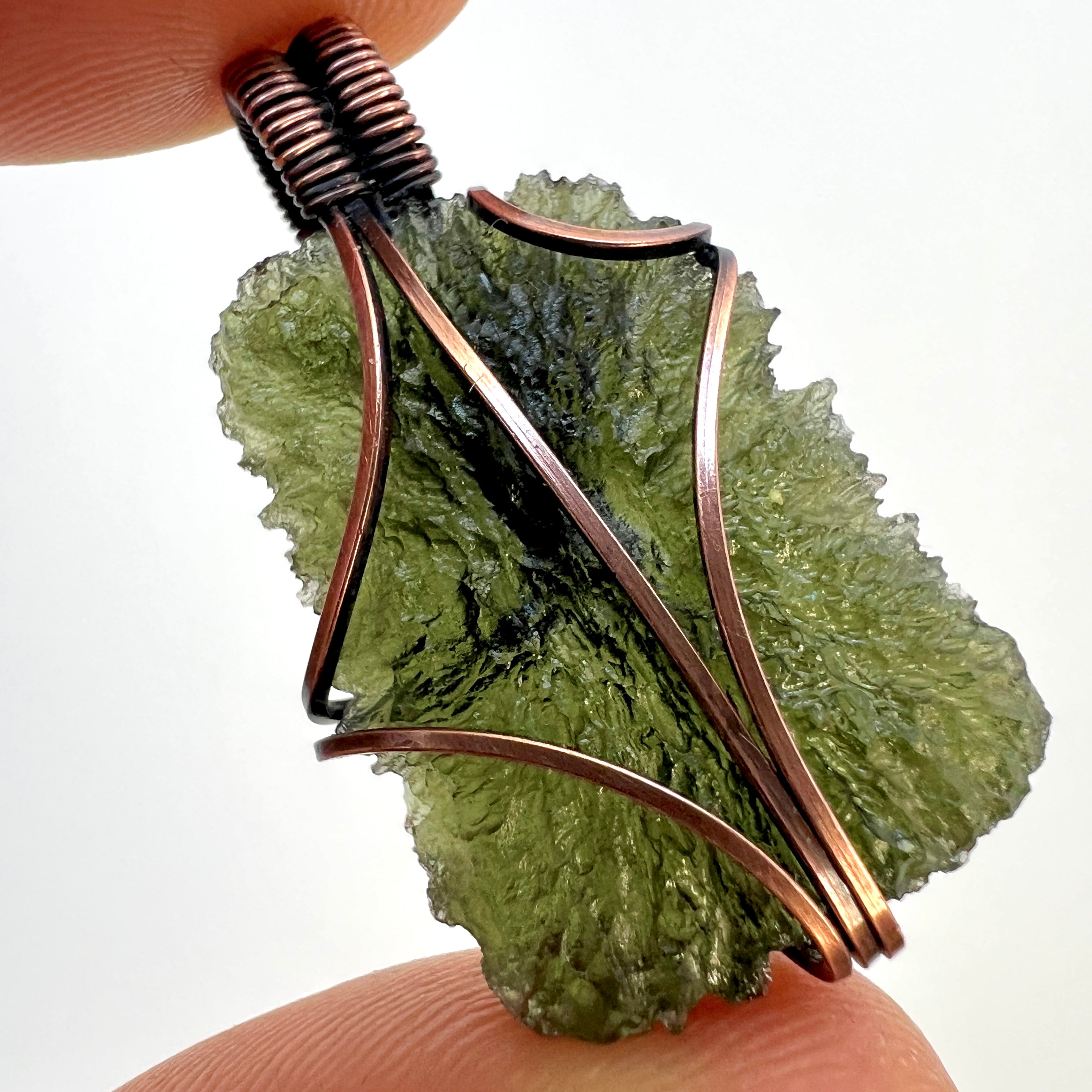 Visually, the rustic glow of antiqued copper harmonizes with Moldavite’s deep forest-green hue, giving the piece a timeless, organic look. Energetically, copper acts as a bridge between the heavens and the earth, mirroring Moldavite’s origin—born from the union of cosmic impact and terrestrial matter. Together, they form a powerful combination: Moldavite for awakening and transformation, and copper for grounding, circulation, and amplification.