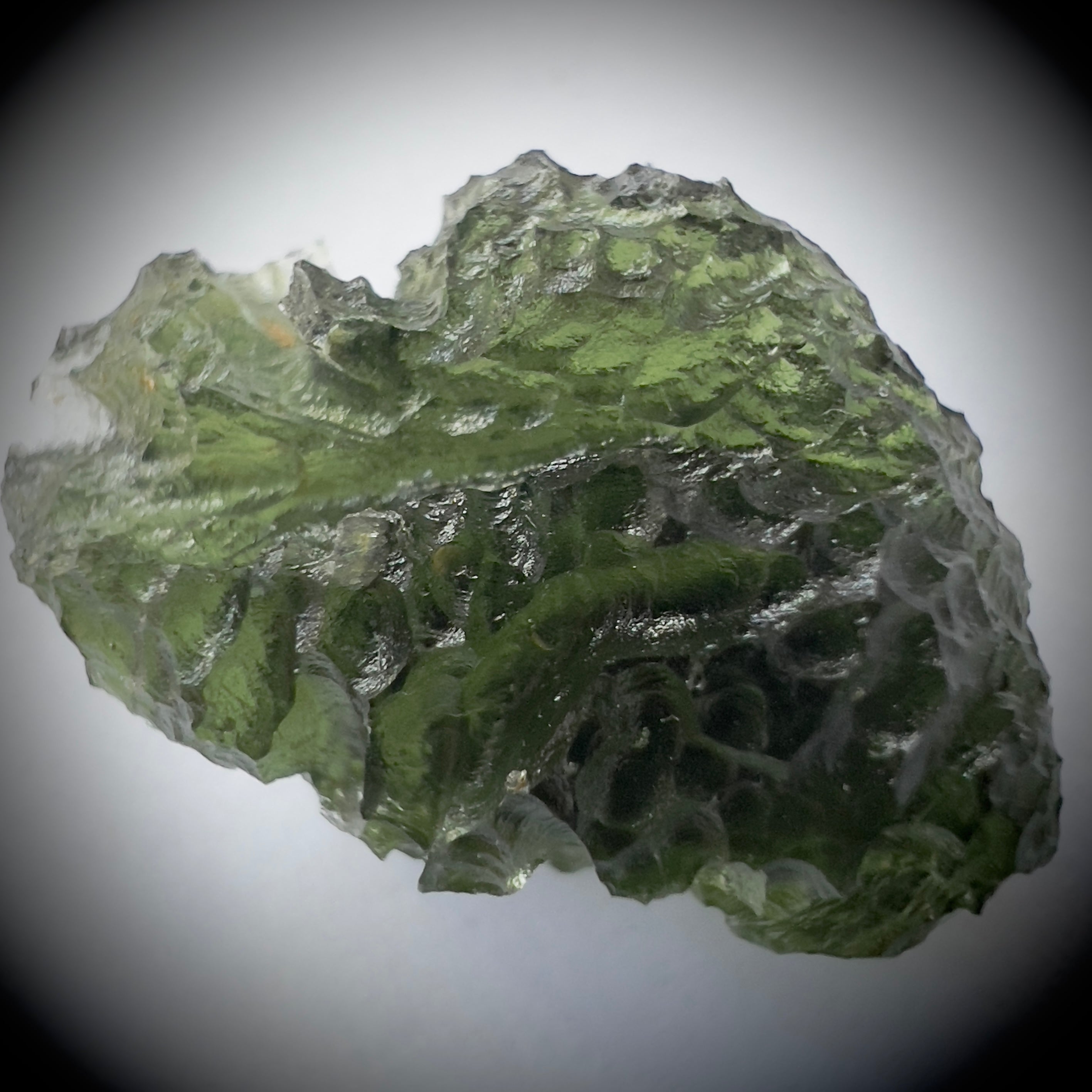 Moldavite is a rare tektite or meteoric glass, caused by an asteroid impact 15mil. years ago. The intense, 10,000°c+ temperatures of the strike vapourised the asteroid, target rock and sand, flinging the molten substance high into the atmosphere.