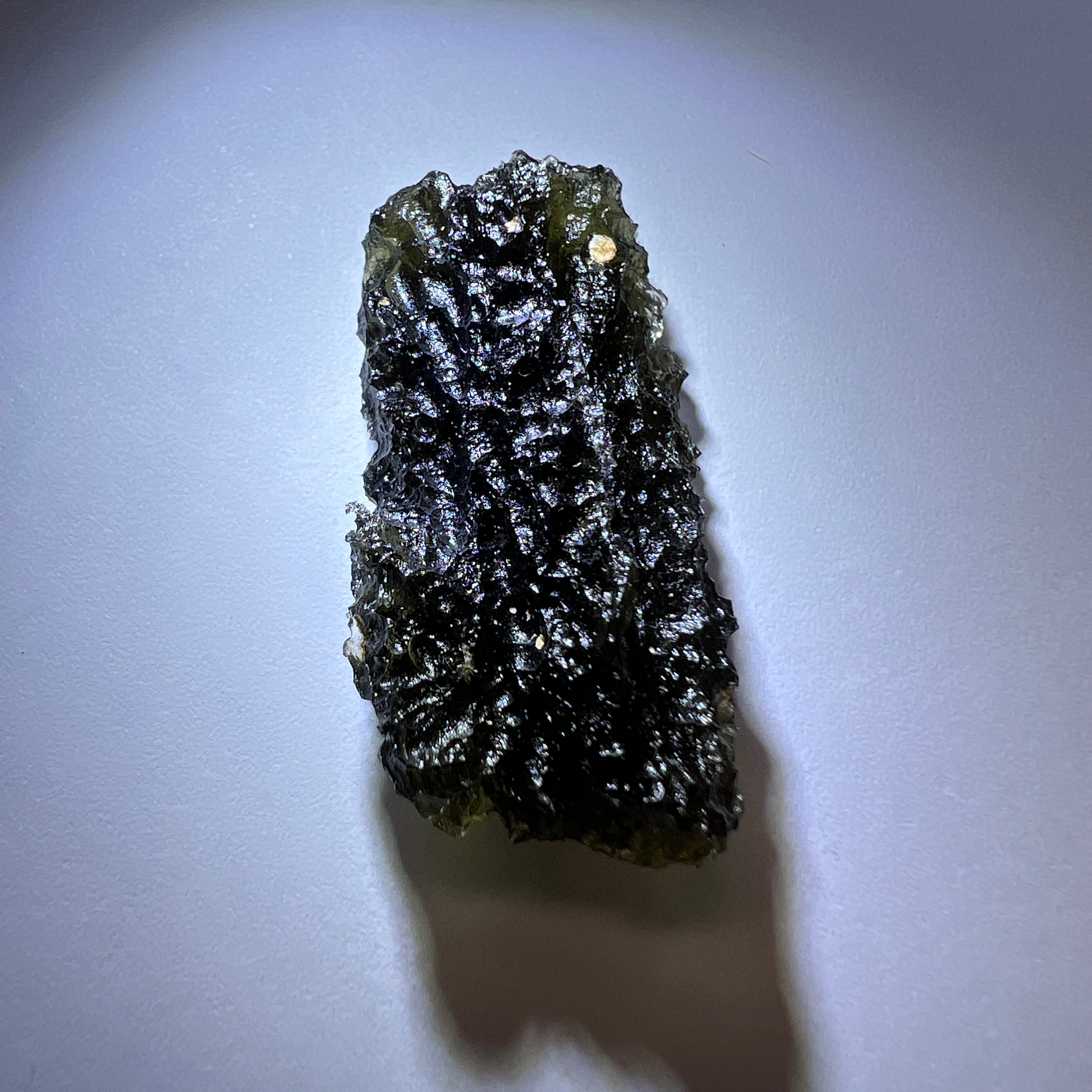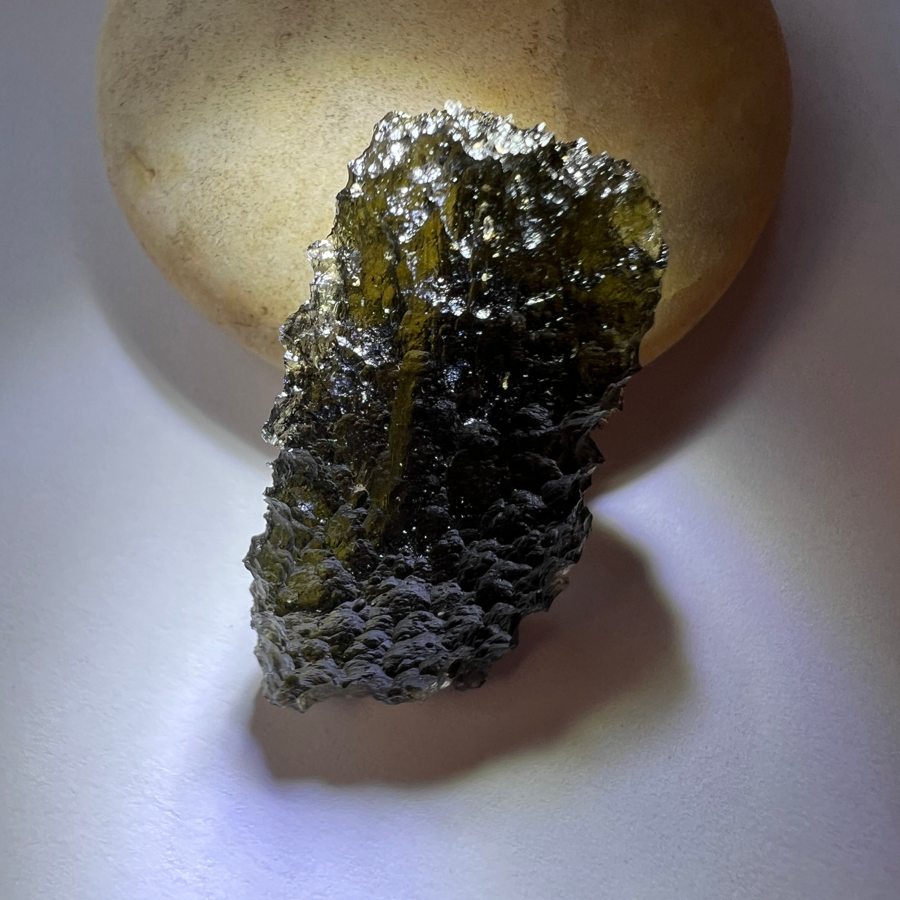 Moldavite is a rare tektite or meteoric glass, caused by an asteroid impact 15mil. years ago. The intense, 10,000°c+ temperatures of the strike vapourised the asteroid, target rock and sand, flinging the molten substance high into the atmosphere.