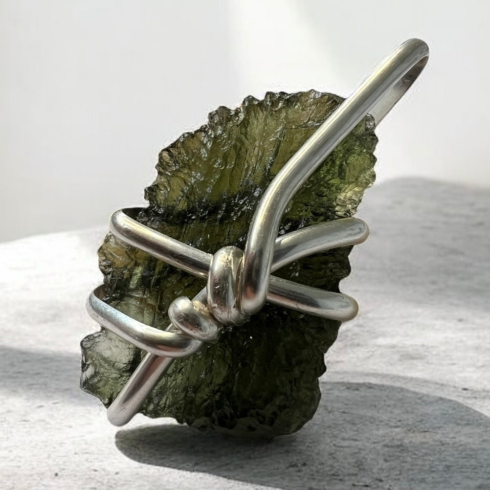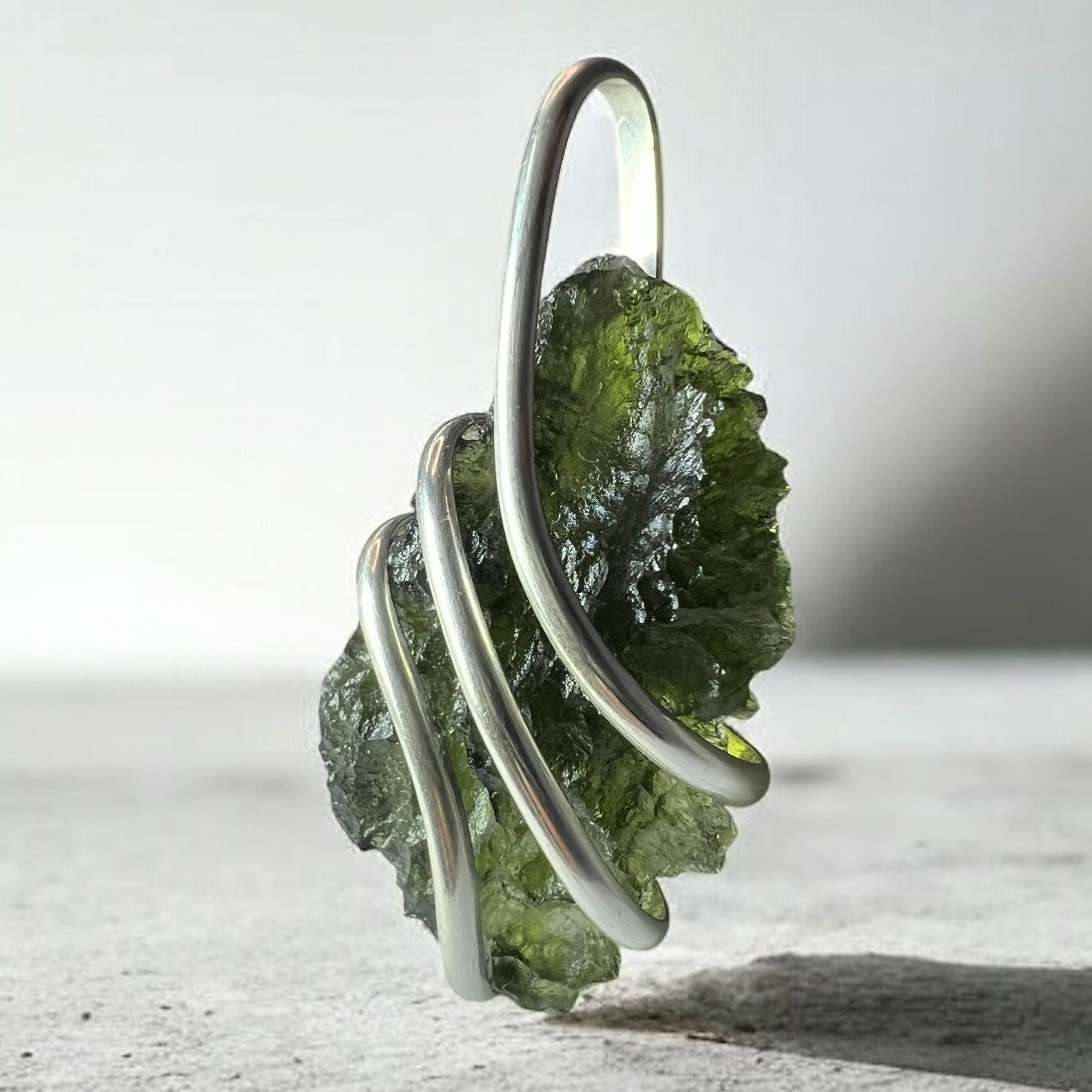 This remarkable pendant features a 5.64g Moldavite from Marouskovo Pole, beautifully wrapped in thick, half-round sterling silver wire. The stone’s elongated, sculpted form showcases a rich deep olive-green hue and distinct etched texture, capturing the raw natural beauty that makes Moldavite so mesmerizing. The bold silver wrap adds contrast and protection while preserving the pendant’s organic, freeform silhouette. A matching tarnish-free stainless steel chain completes the piece with a clean, modern finish.