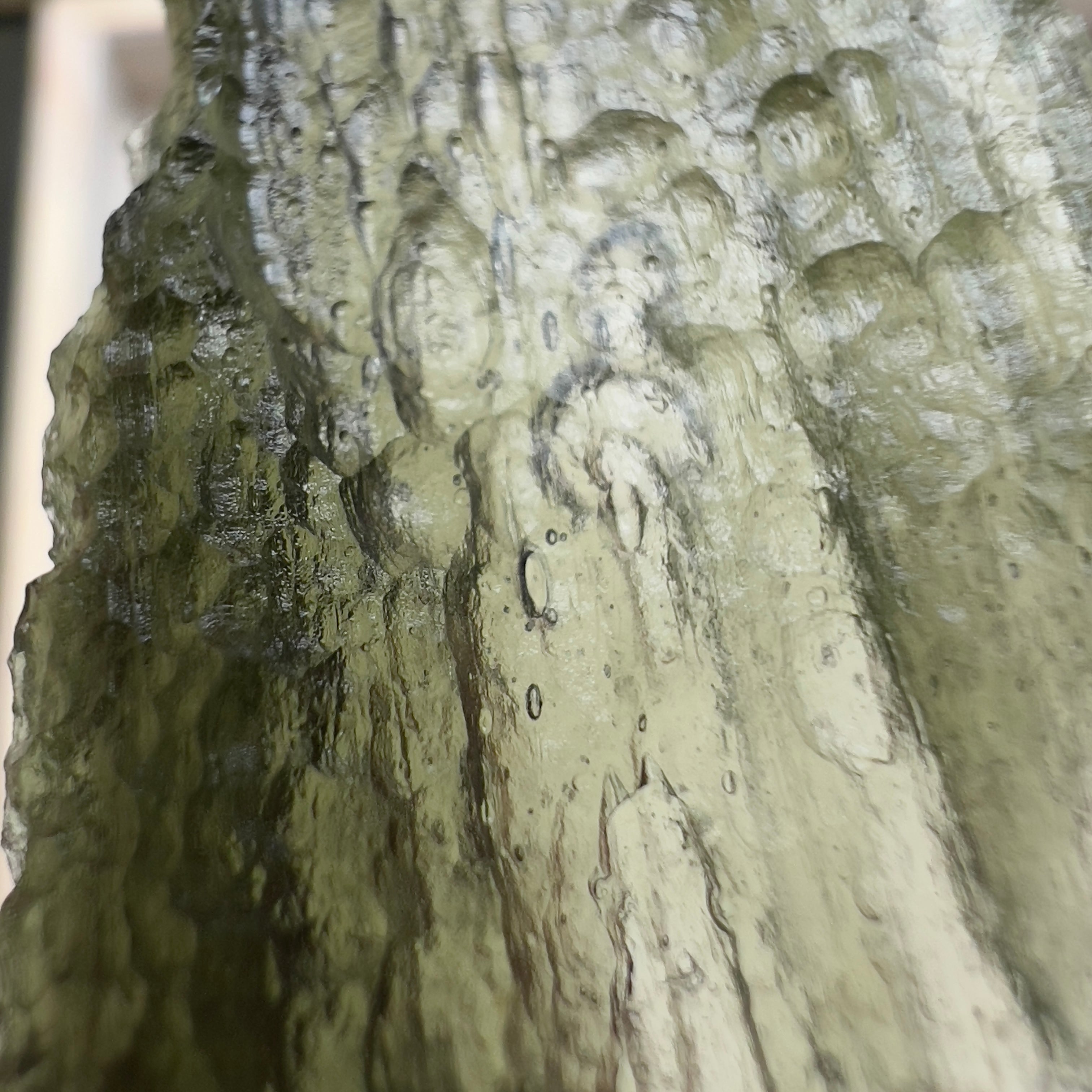 Moldavite is a rare tektite or meteoric glass, caused by an asteroid impact 15mil. years ago. The intense, 10,000°c+ temperatures of the strike vapourised the asteroid, target rock and sand, flinging the molten substance high into the atmosphere.