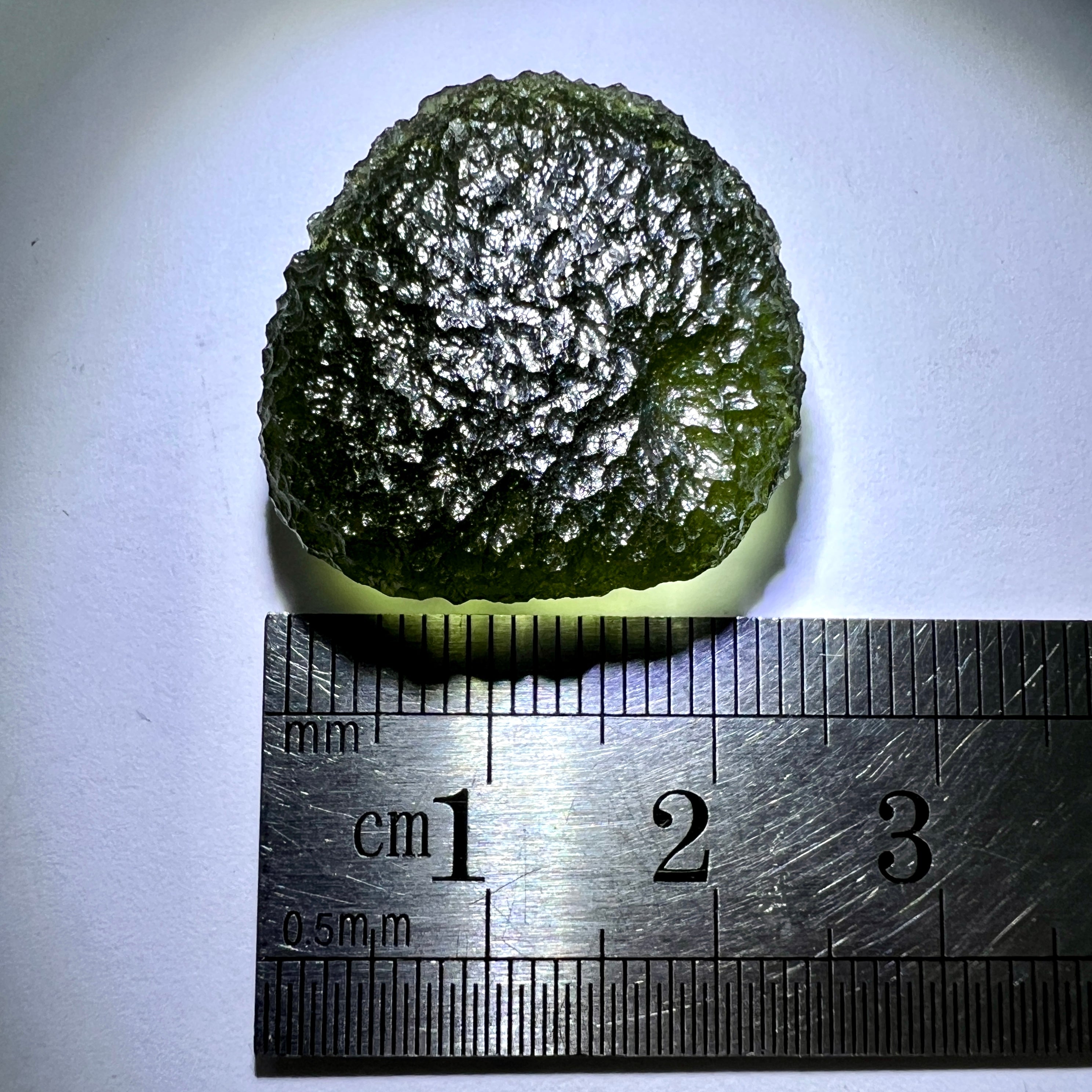 showcases intricate, detailed texturing on all sides and edges, making it a truly remarkable find. Its uniform thickness enhances its translucency, revealing a captivating green hue when held up to light. Weighing 6.7 grams, this piece is a prized addition for any serious collector of Moldavite.