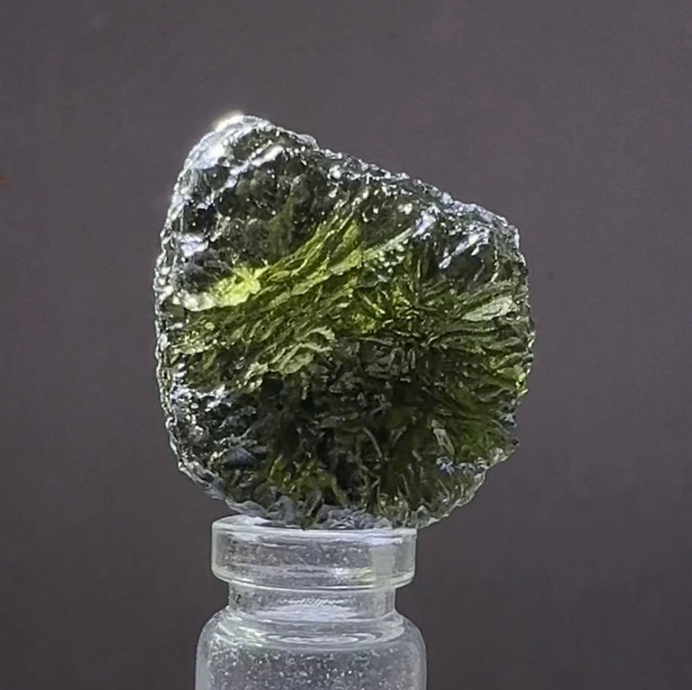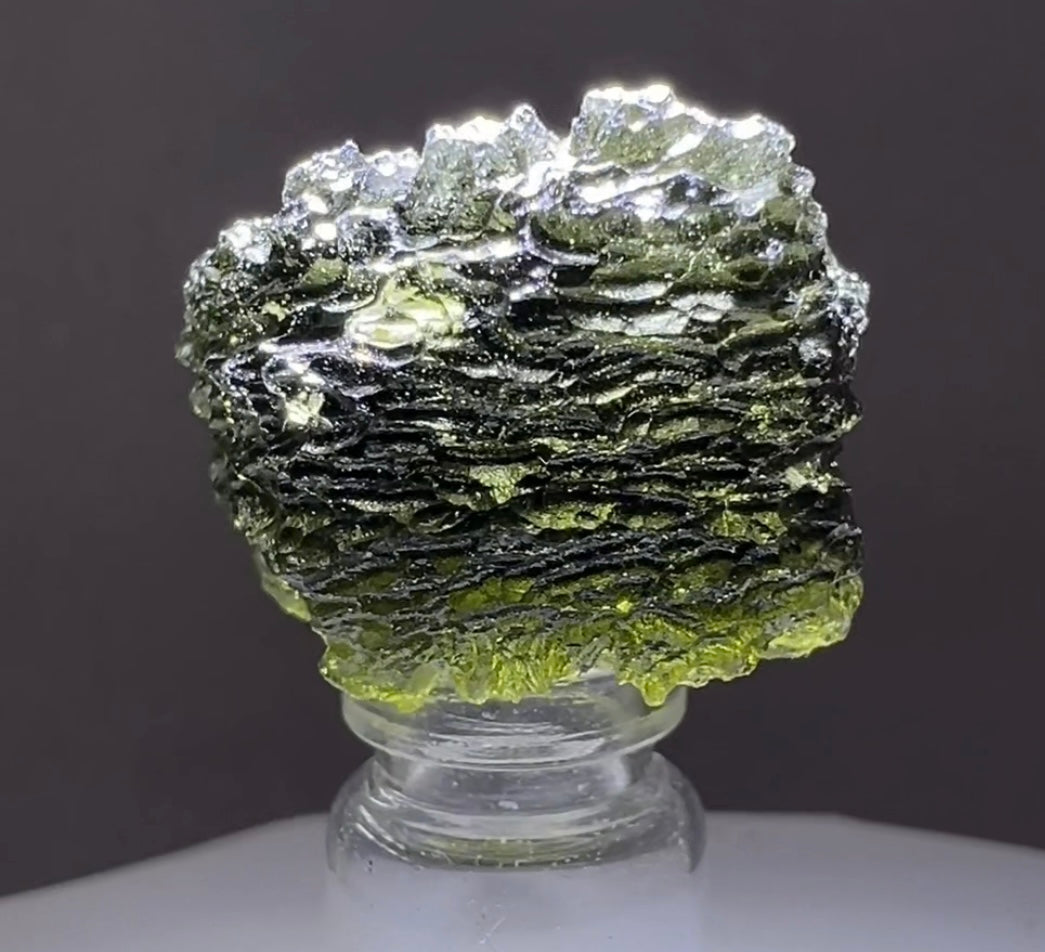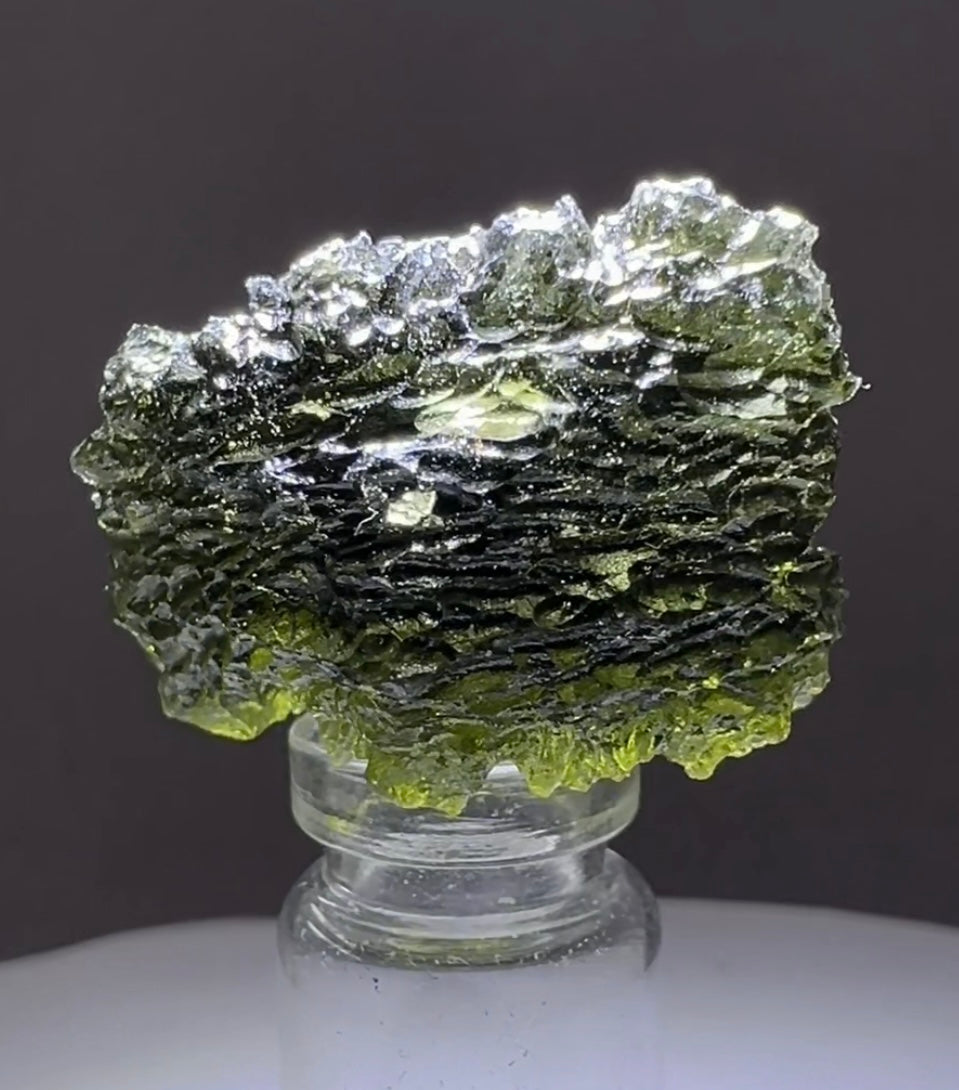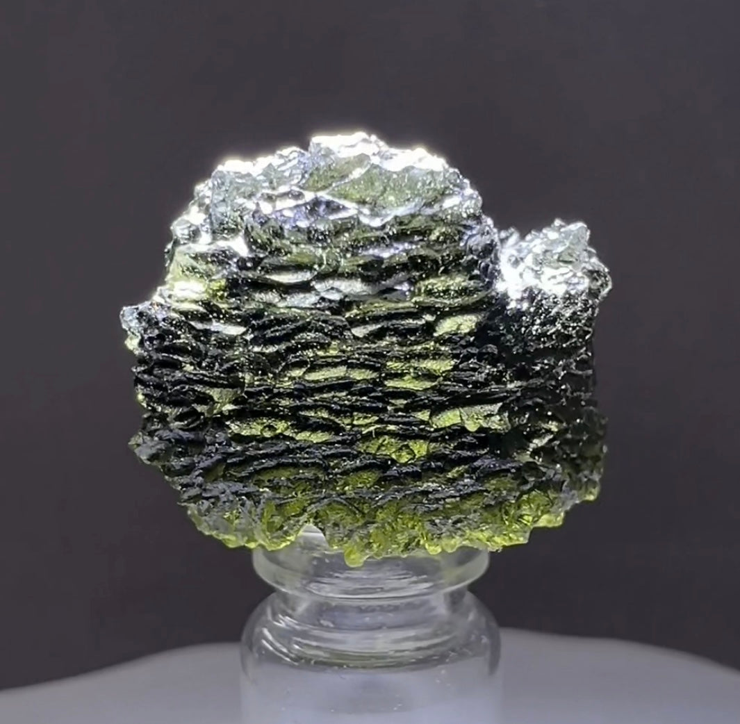 Moldavite is a rare tektite or meteoric glass, caused by an asteroid impact 15mil. years ago. The intense, 10,000°c+ temperatures of the strike vapourised the asteroid, target rock and sand, flinging the molten substance high into the atmosphere.