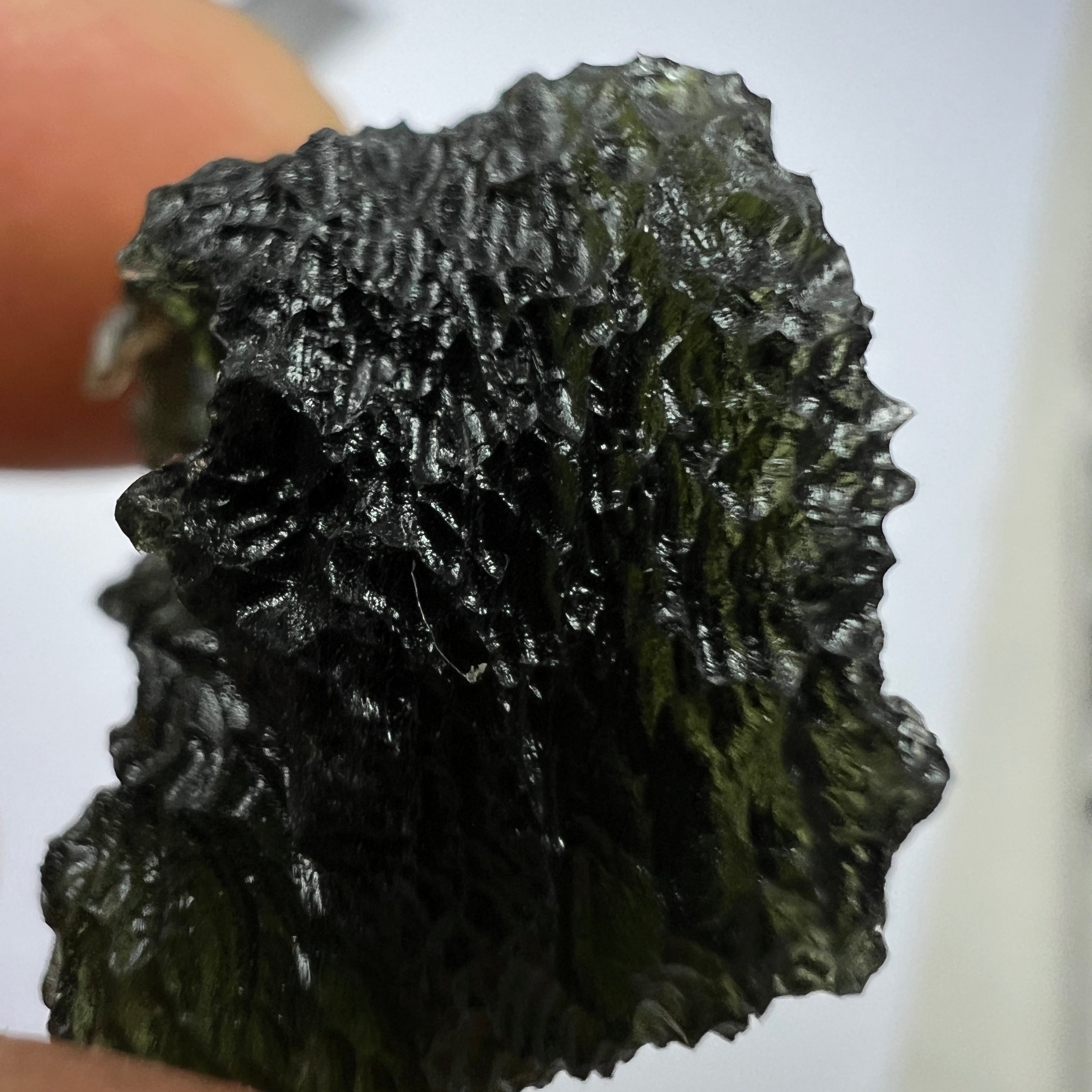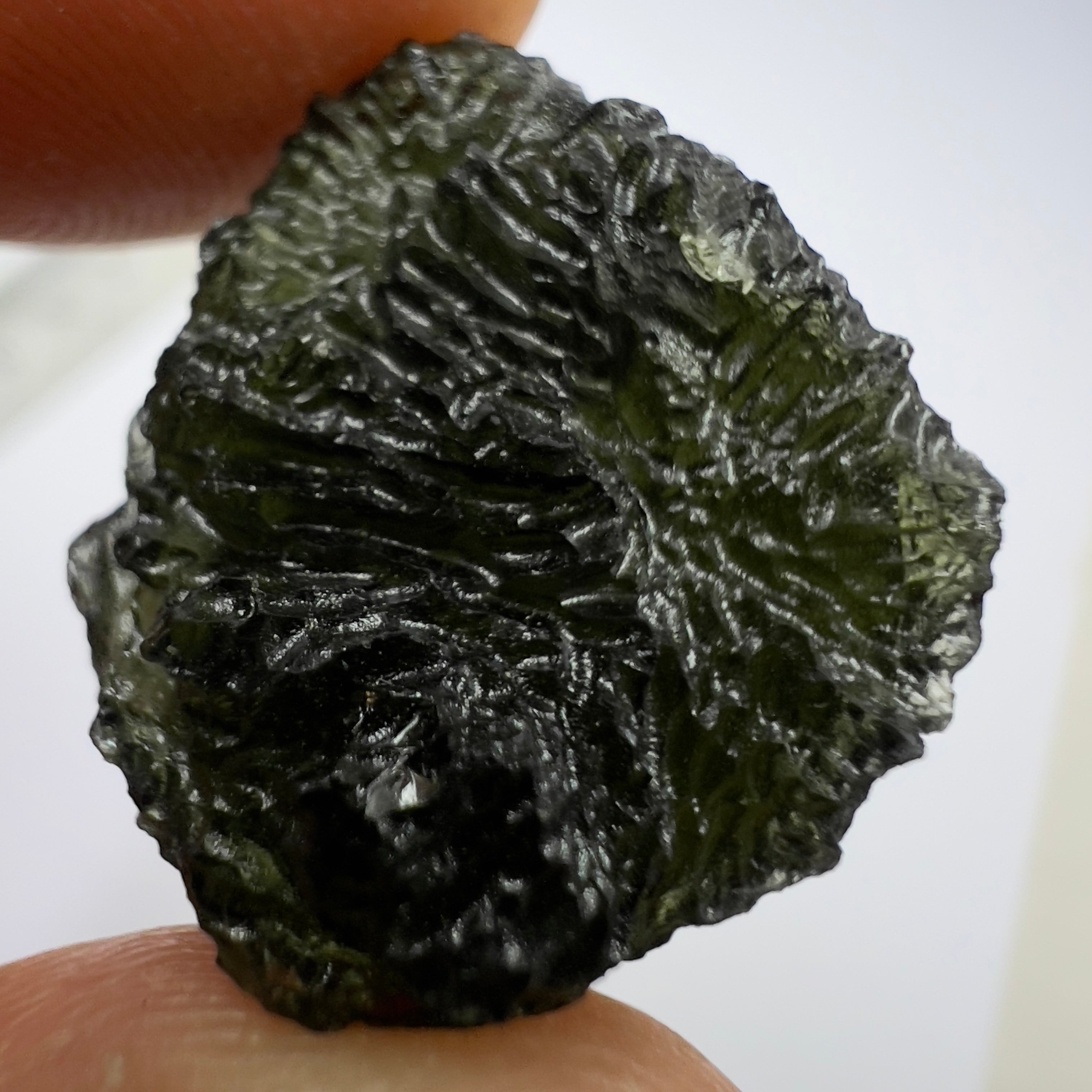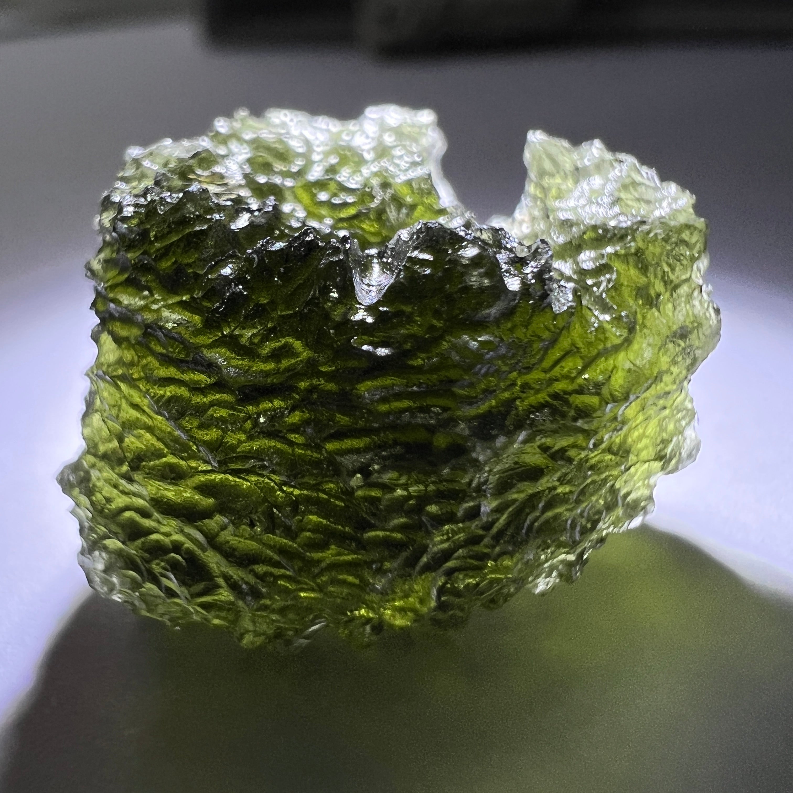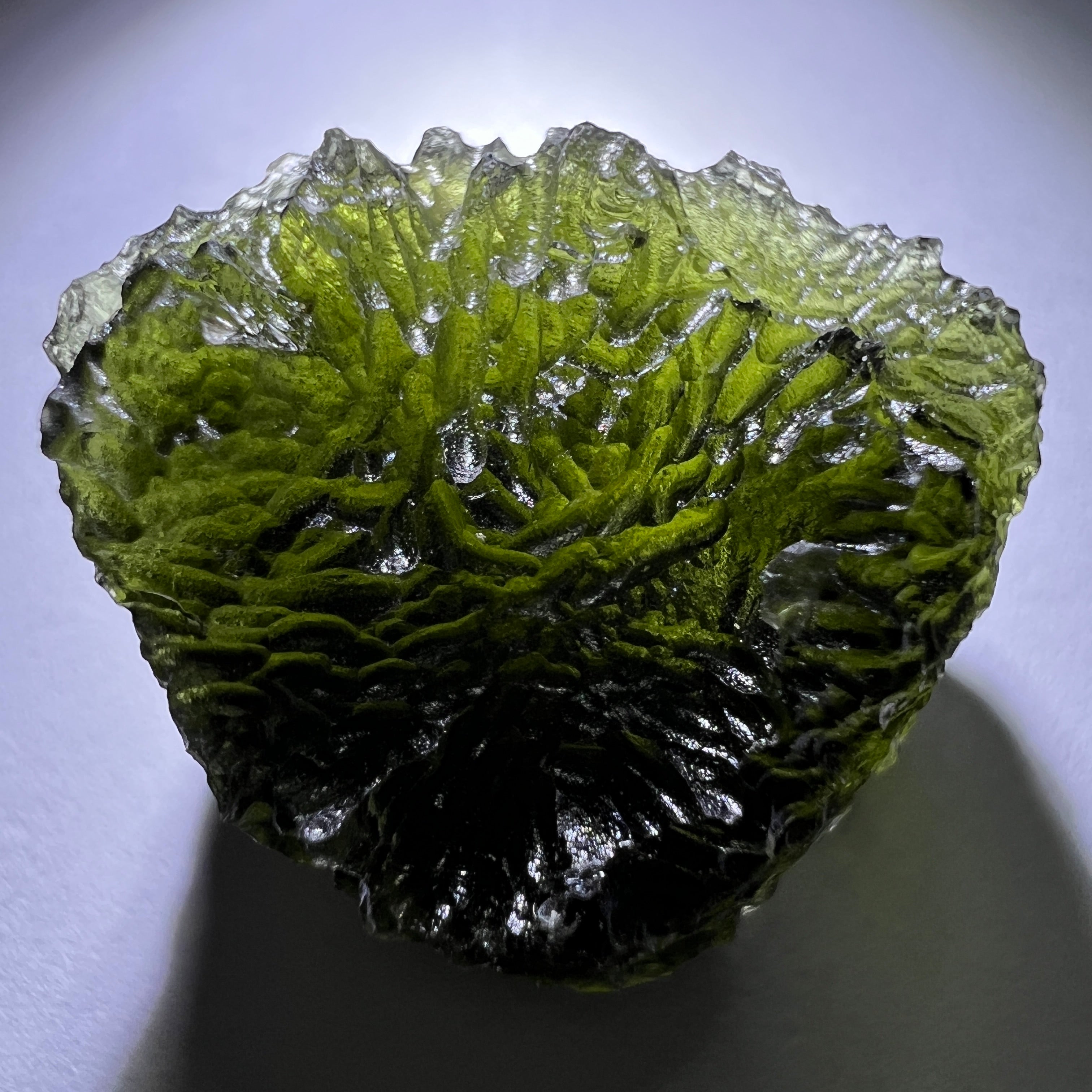 Moldavite is a rare tektite or meteoric glass, caused by an asteroid impact 15mil. years ago. The intense, 10,000°c+ temperatures of the strike vapourised the asteroid, target rock and sand, flinging the molten substance high into the atmosphere.