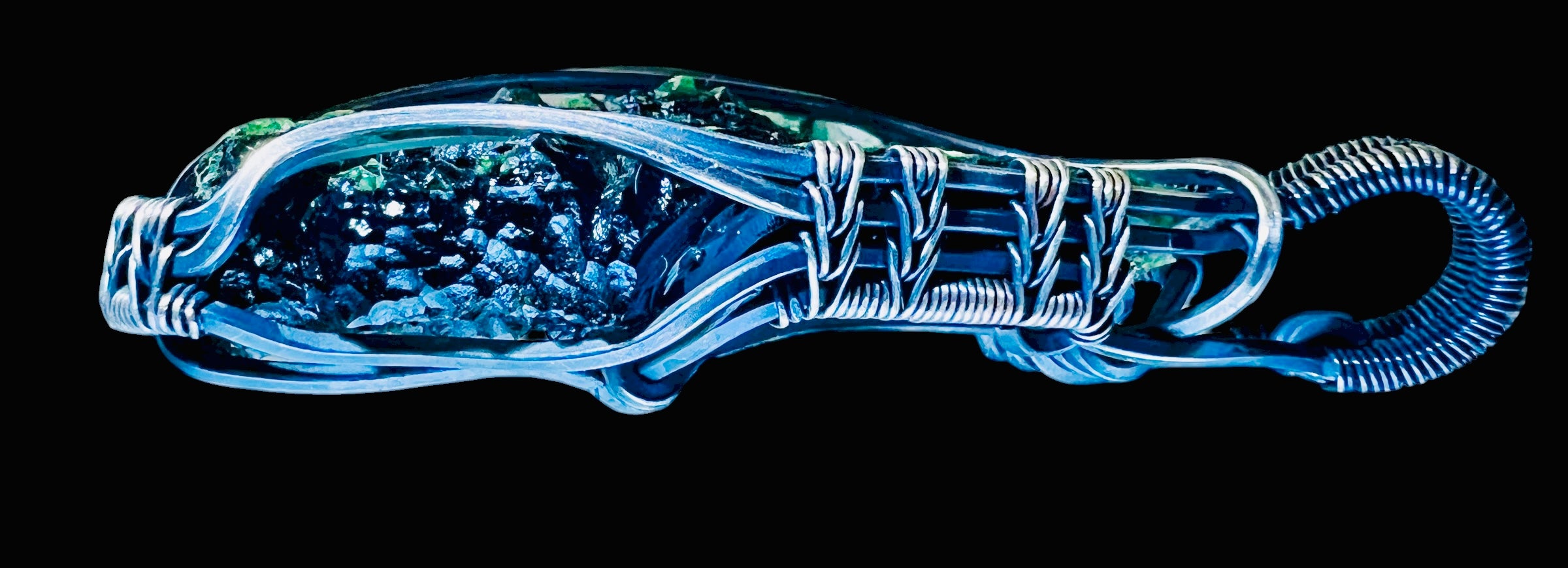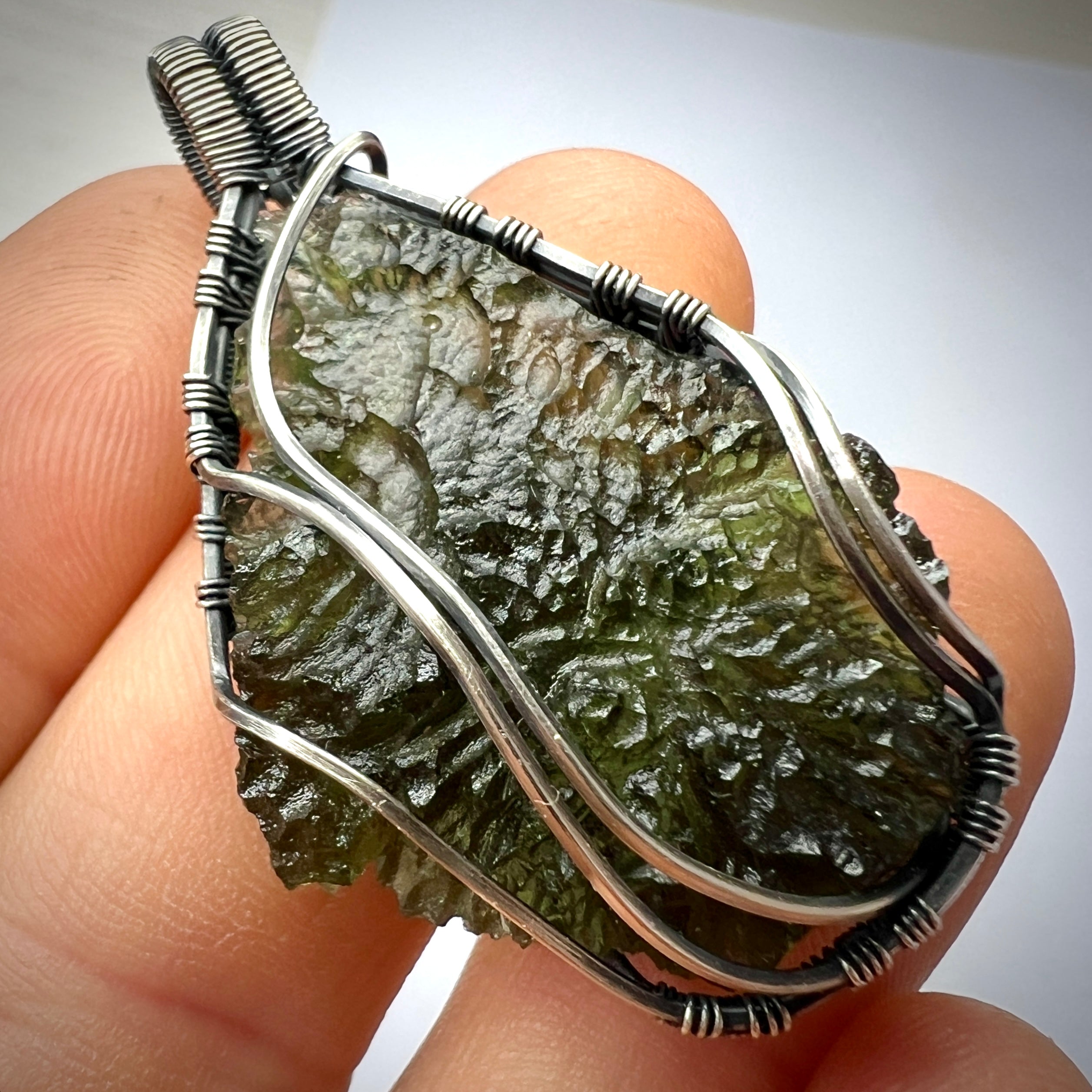 This specimen shows exceptionally well-defined texture and a remarkable green hue that comes forward even more due to the stone’s unusually uniform thickness. The wrapping remains unobtrusive, allowing the natural contours and translucency of the Moldavite to stand out on its own.