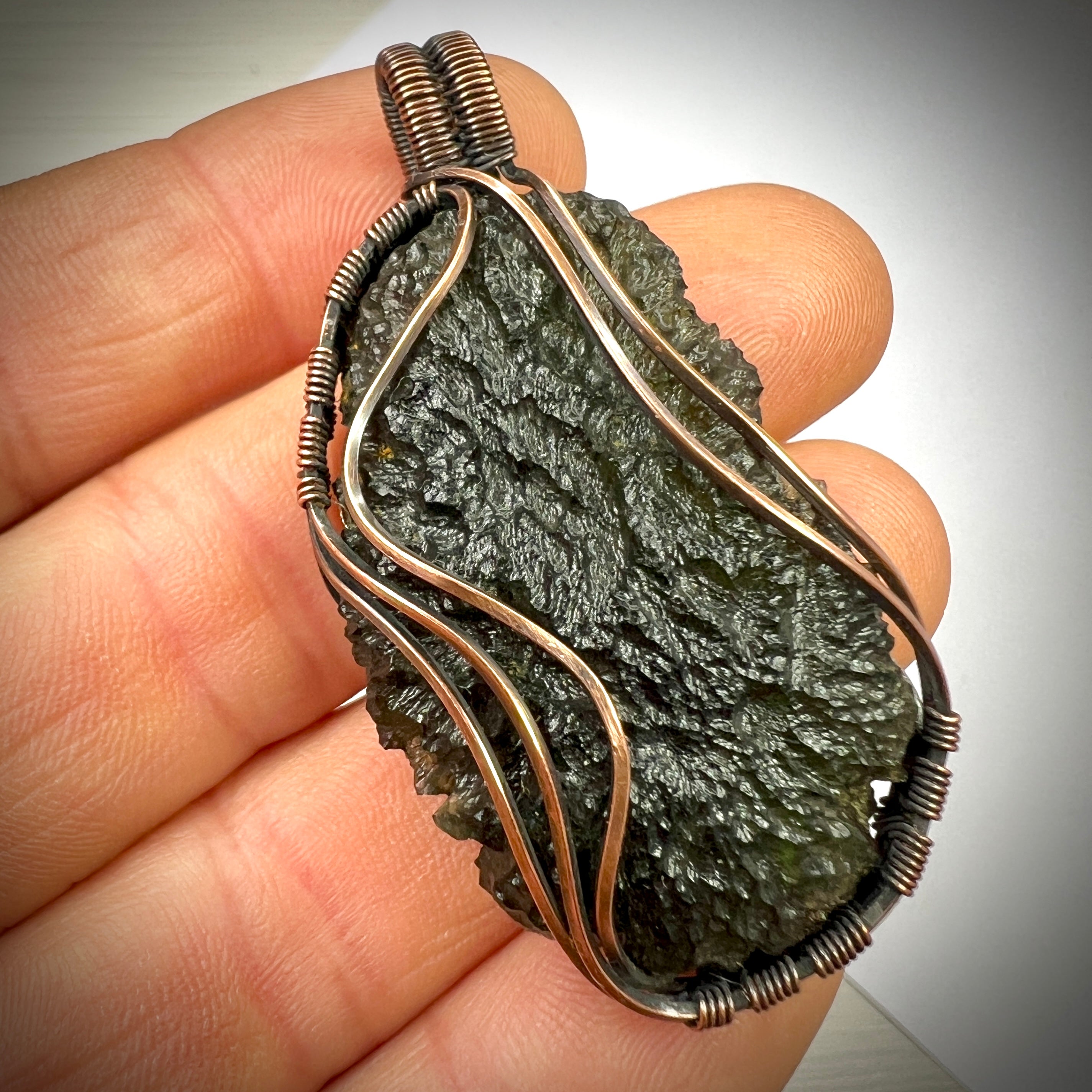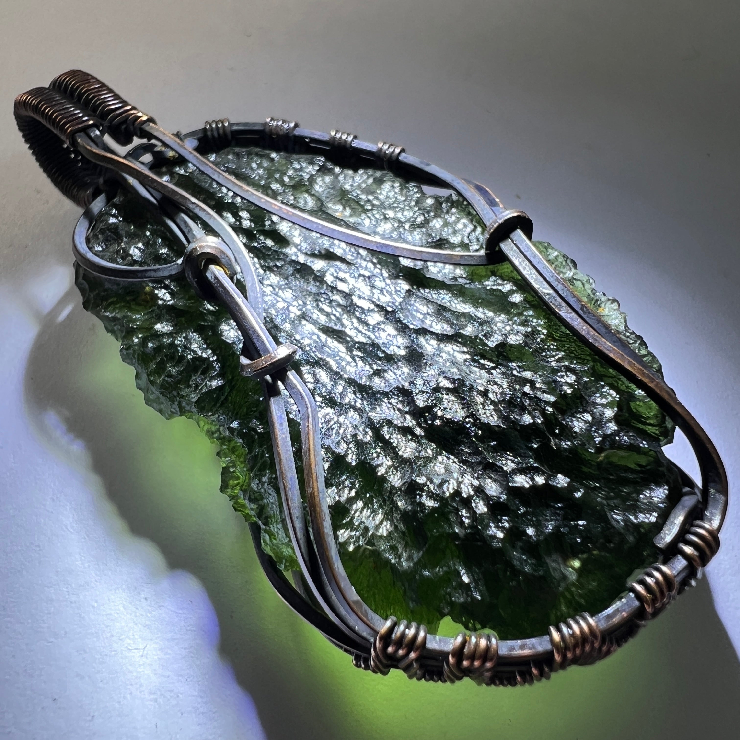 The stone is expertly secured in hand-wrapped antiqued copper, a metal that pairs beautifully with Moldavite on every level.
