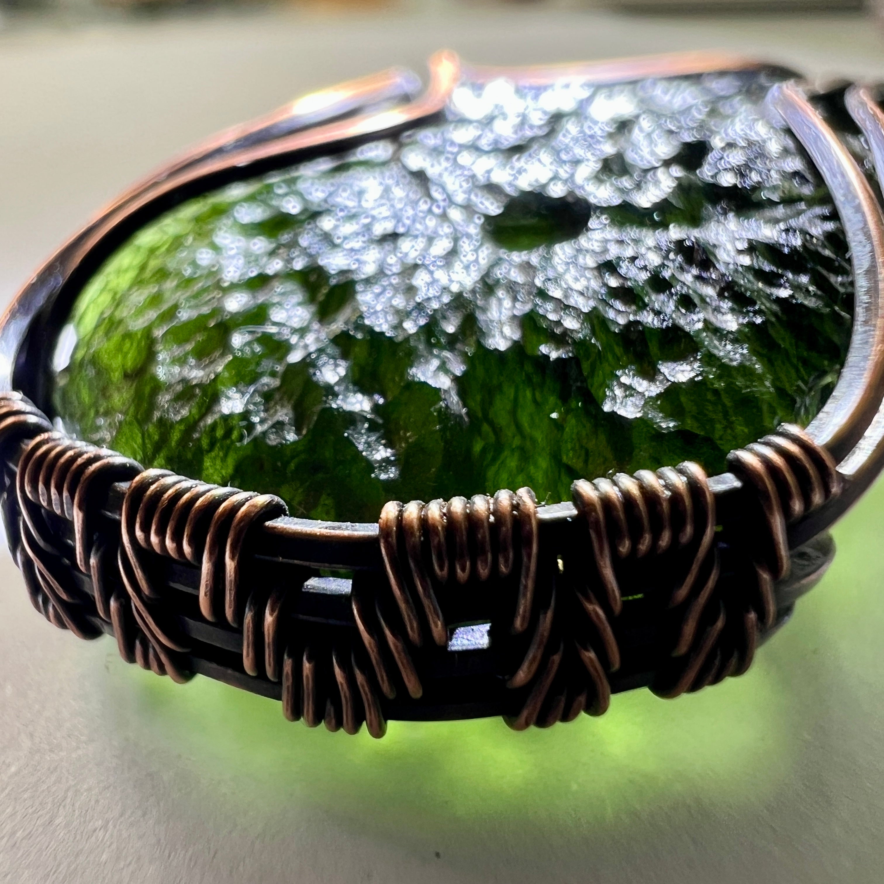 Visually, the warm, earthy copper undertone enhances Moldavite’s green brilliance, giving the piece a grounded, old-world presence.