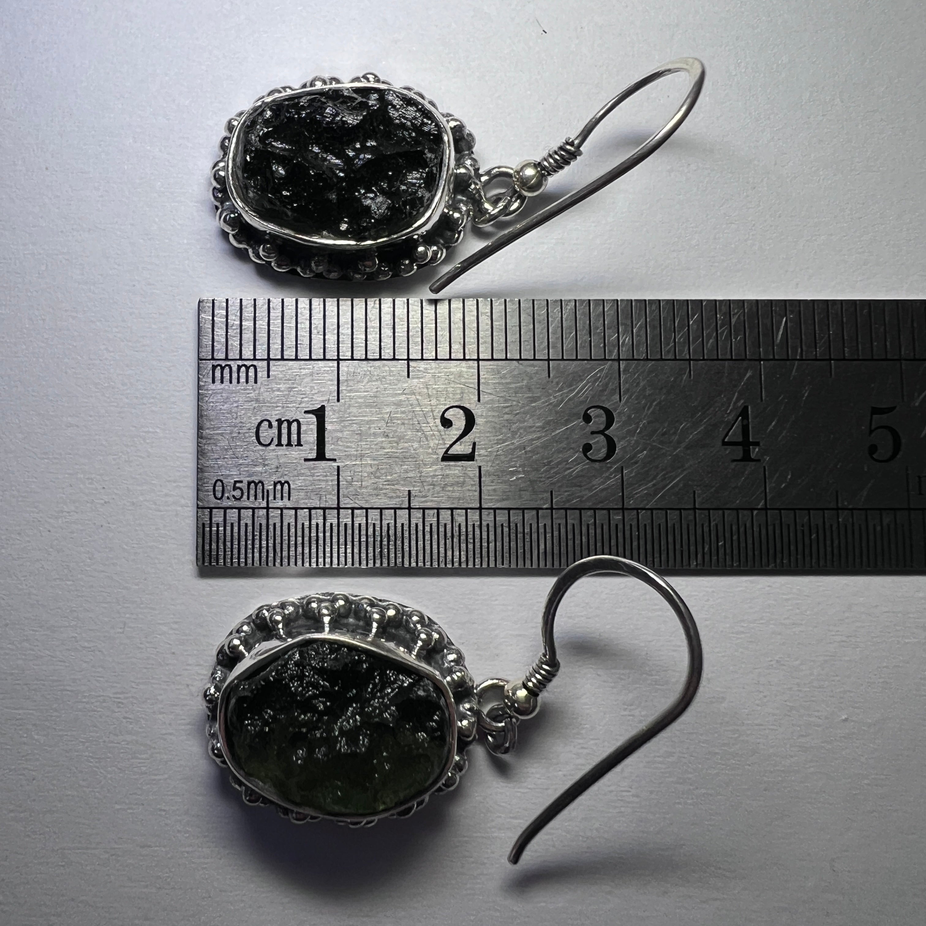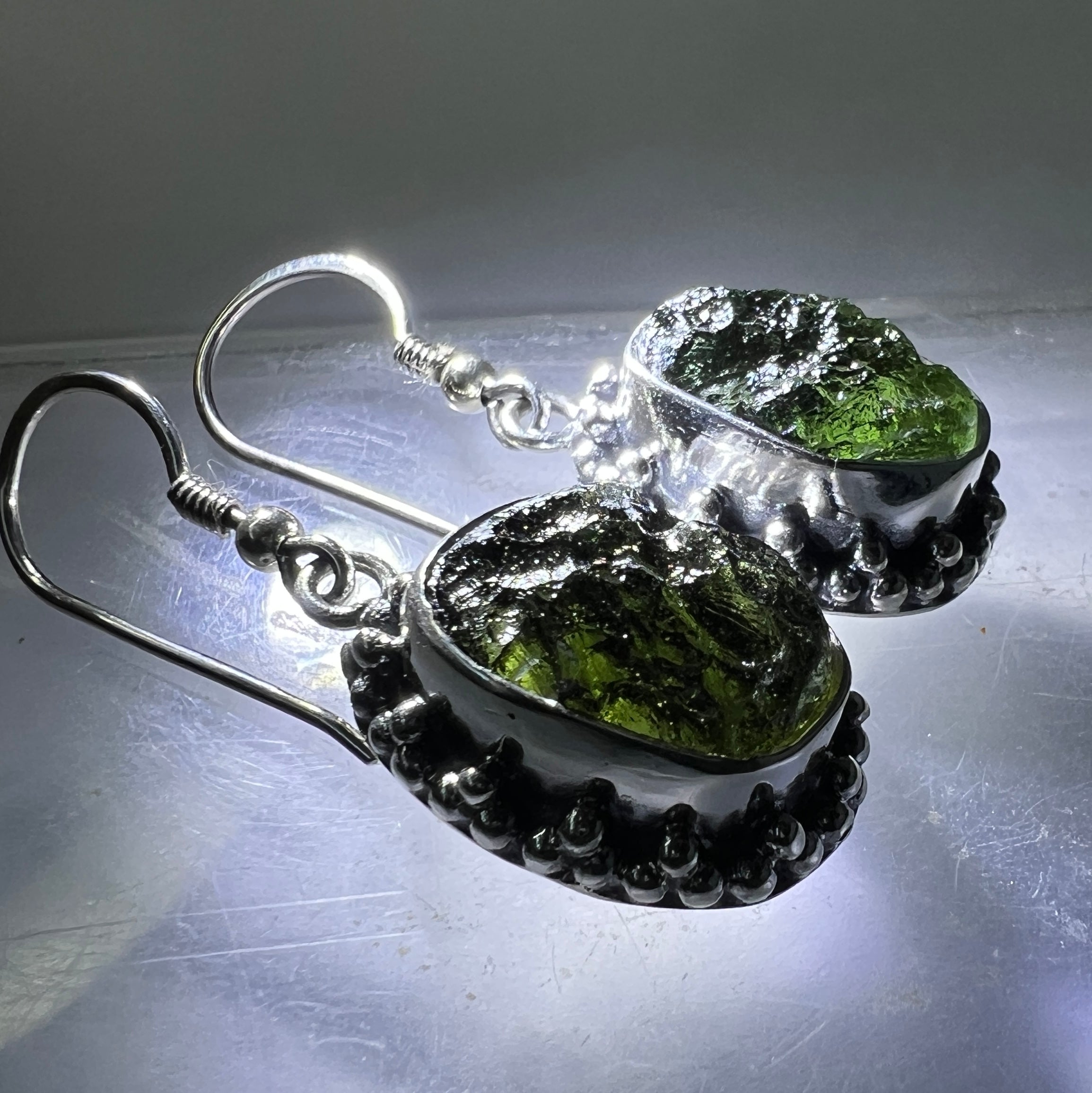 Stunning pair of Moldavite earrings set in sterling silver, featuring beautifully textured raw Moldavite specimens from the Chlum locality in the Czech Republic. The organic surface and vibrant green translucency of the stones highlight the unmistakable character of genuine Moldavite.