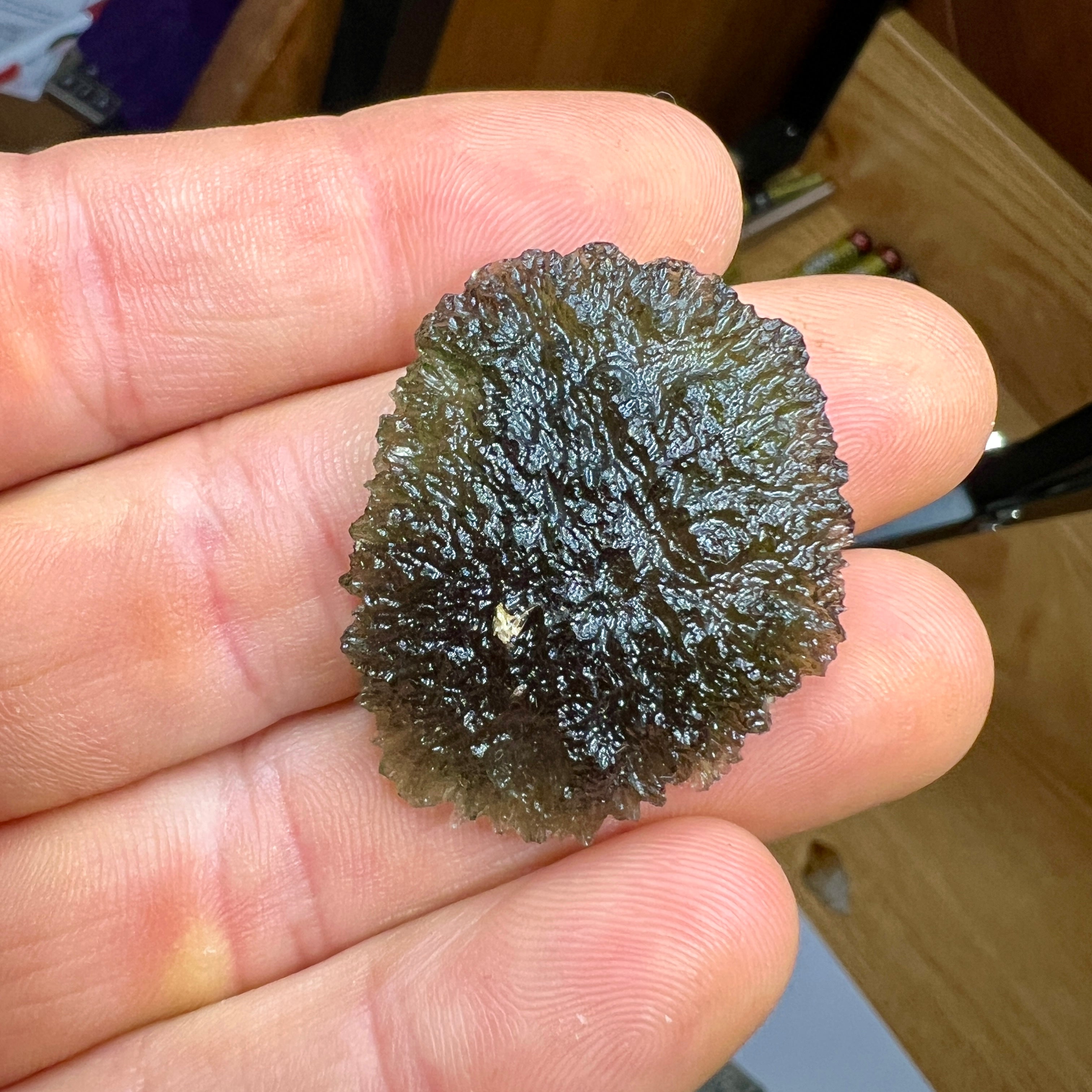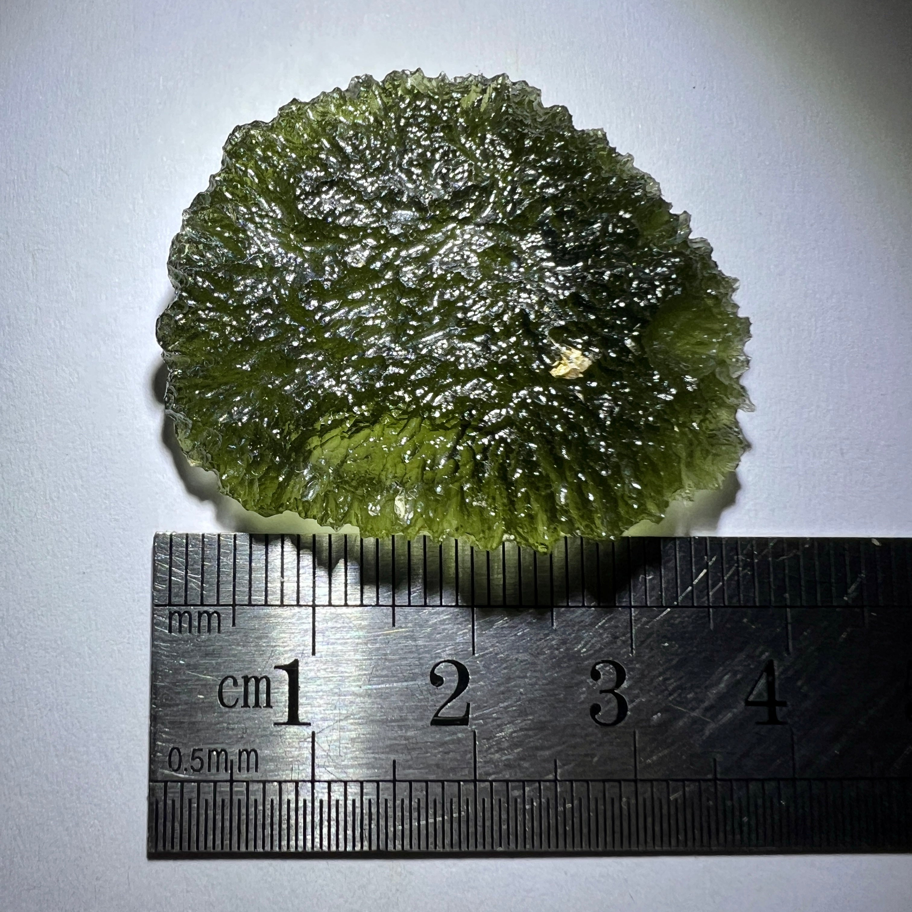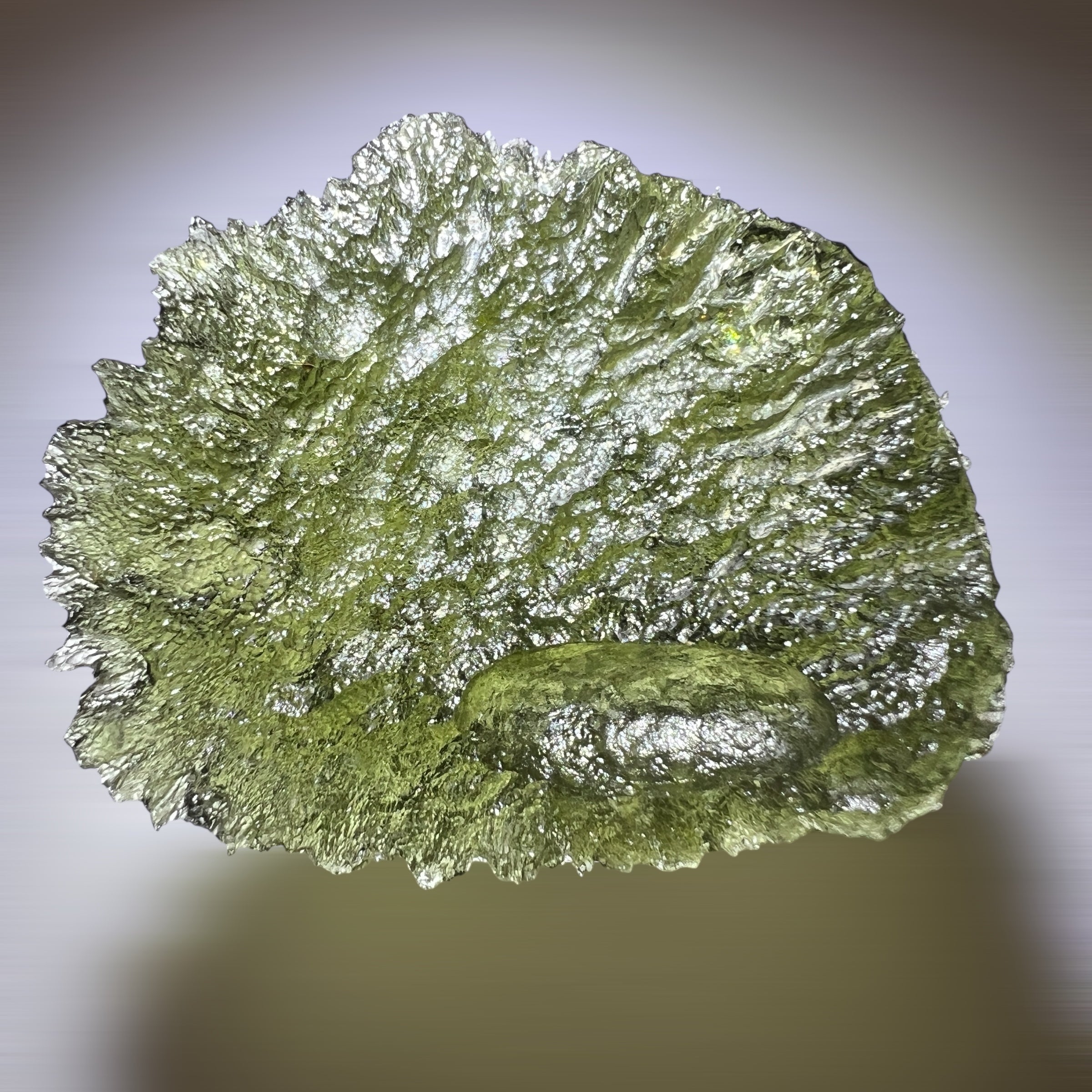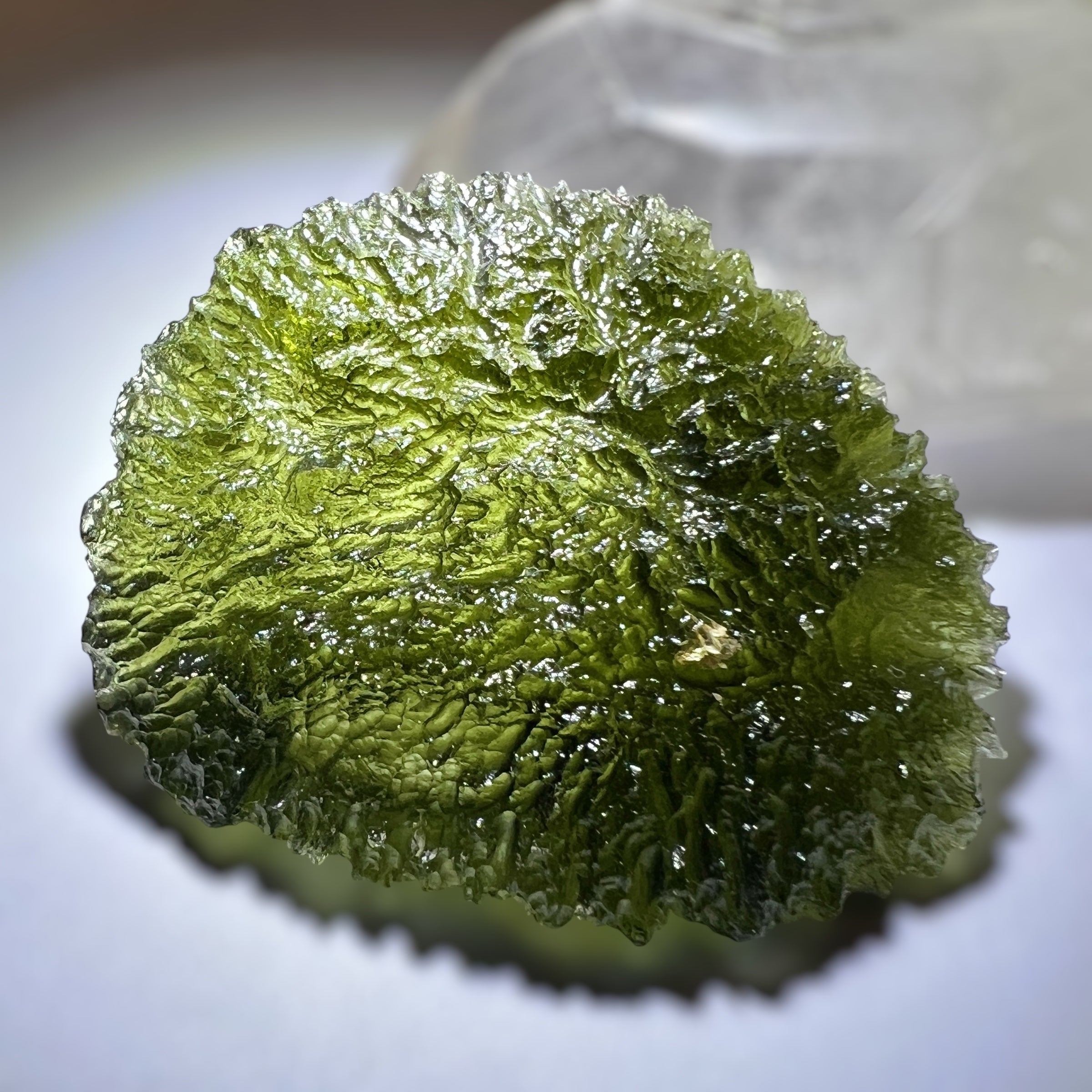 This striking Moldavite from Silážka, Czech Republic, weighs 9.18 grams and features a slightly irregular, concave disc shape with a uniform thickness of around 5mm — allowing light to pass through beautifully and revealing the intricate texture in stunning detail.