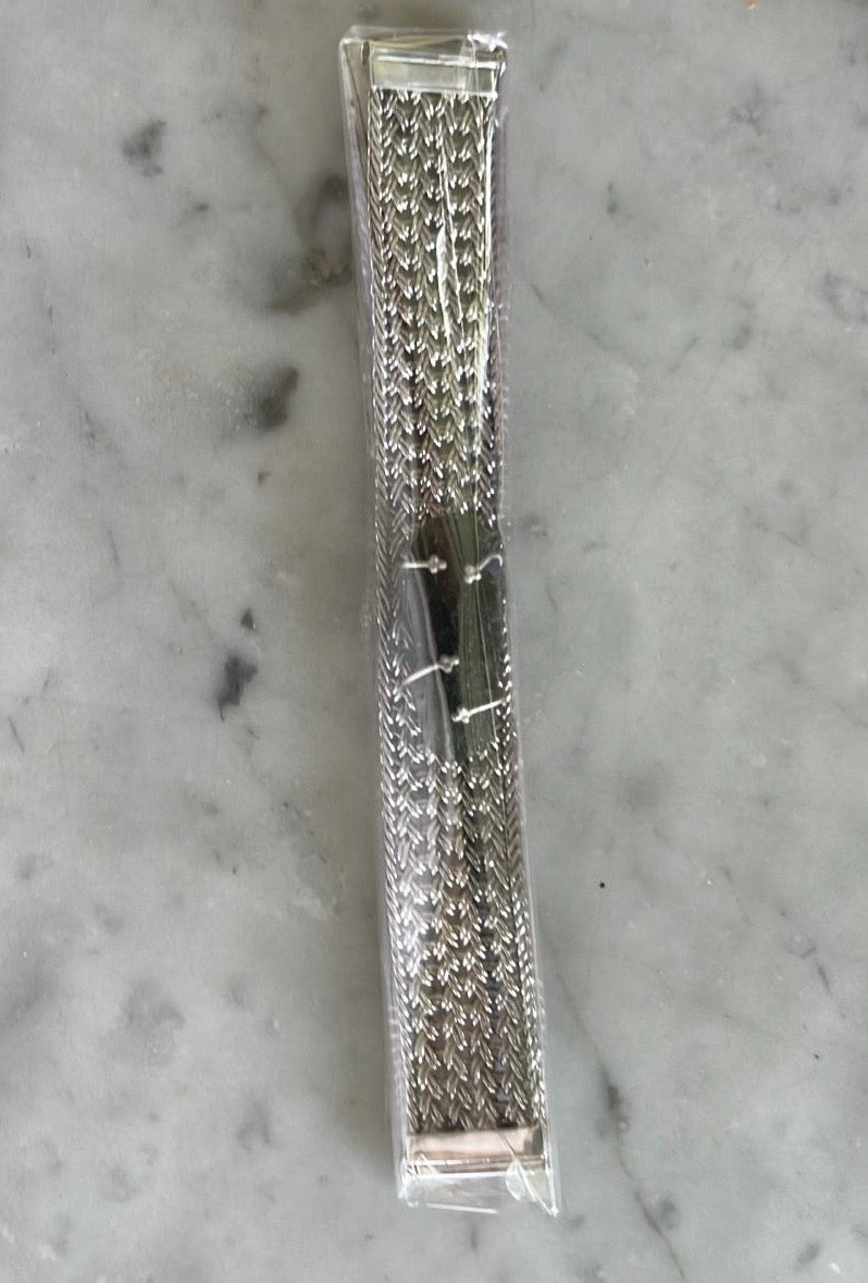 The bracelet itself is a masterpiece of craftsmanship. An intricately hand-woven silver band forms a refined structure reminiscent of the links of a fine luxury watch, bringing together strength, elegance, and precision. It closes securely with a watch-style clasp, completing the timepiece-like aesthetic that makes this bracelet so striking on the wrist.