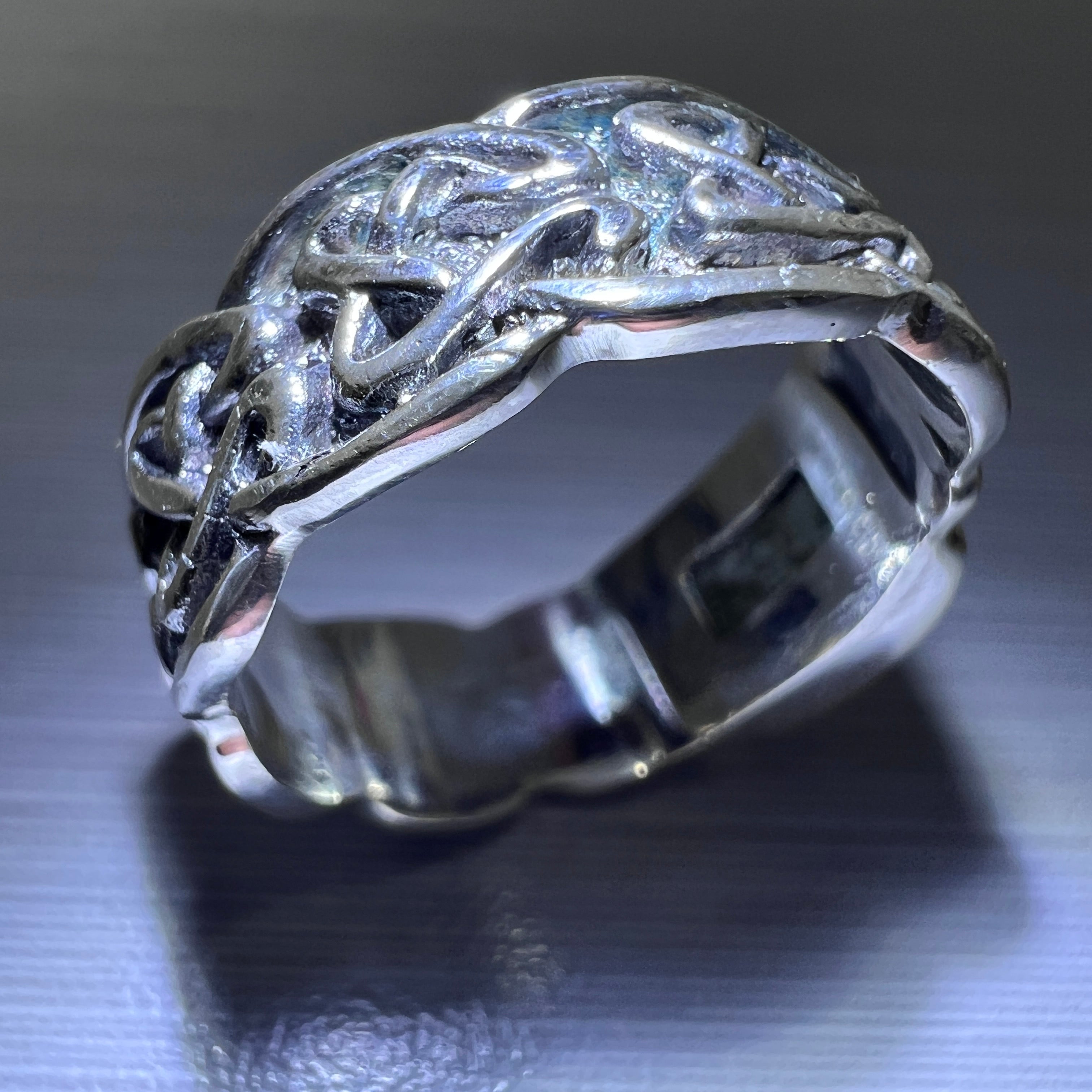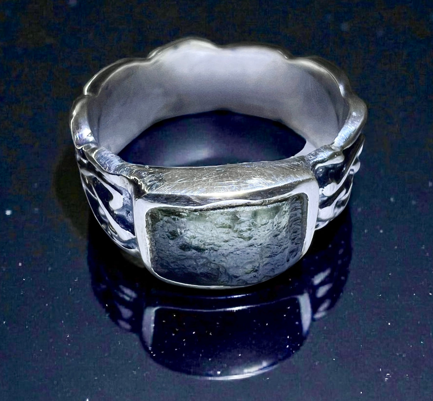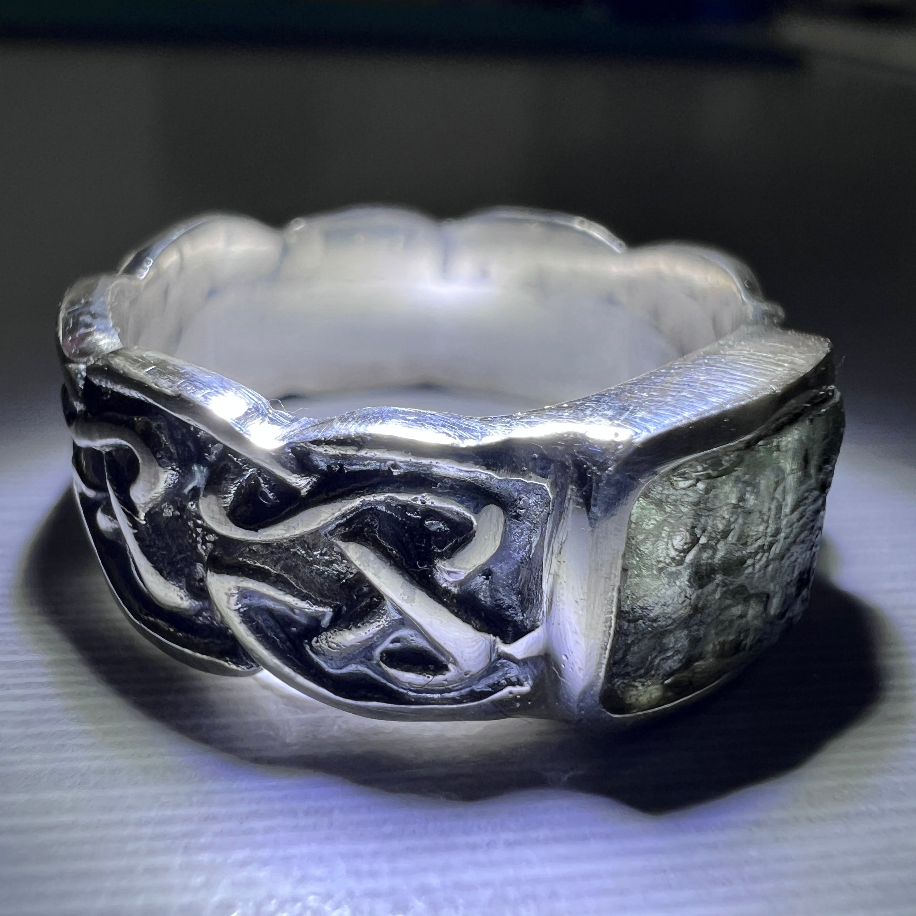 Moldavite is associated with transformation and spiritual growth, while Celtic motifs represent heritage, continuity, and protection, making this ring both a meaningful and stylish statement piece.